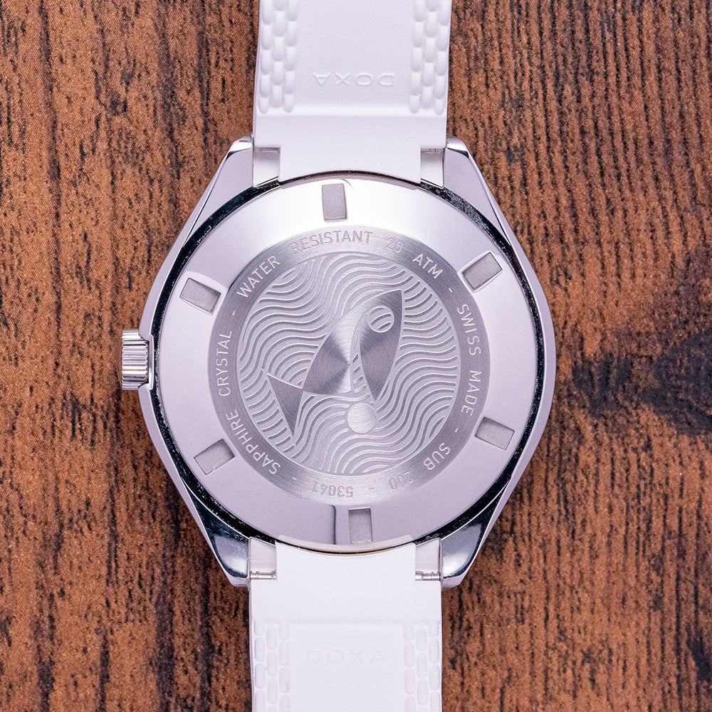 First unveiled at Baselworld 2019 this 2021 Doxa Sub 200 White Pearl 799.10.011.23 has a 42mm 316L stainless steel tonneau case, polished and brushed surfaces transition with crisp lines, bevel edges, a lug-to-lug length of 46mm and a case thickness of 13.5mm giving the watch an impressive wrist presence. On the right side is a signed screw-down crown with a black Doxa fish symbol. The unidirectional dive bezel has a white sapphire insert with a 60-minute scale and holds a scratch-resistant sapphire box crystal with an anti-reflective coating and a distinctive curvature of the dome that reminds us of the plexiglass crystals used in the 1960s. The white pearl dial has an outer minute track with applied baton indexes outlined in black coated in Super‑LumiNova marking the hours, at 3 o’clock a framed date window, and sword hands complemented by a tapered second hand all coated in the same Super‑LumiNova and at 12 o’clock we have the DOXA motif and at 6 o’clock “SUB 200” completes this striking dive tool watch. On the reverse a screw-down case back with the deeply engraved DOXA fish symbol on top of a wave pattern, inside an Automatic Sellita SW200, 26 jewels, 28,800 beats per hour. The watch comes fitted on its DOXA 19mm white rubber strap and a pin buckle with the DOXA fish symbol and the watch comes with its DOXA presentation box, travel case and paperwork.