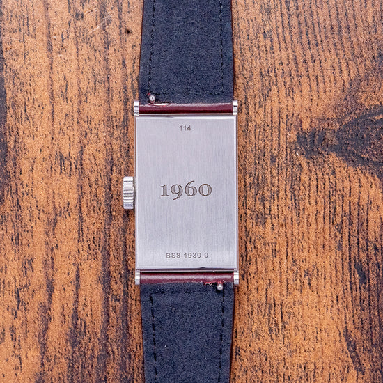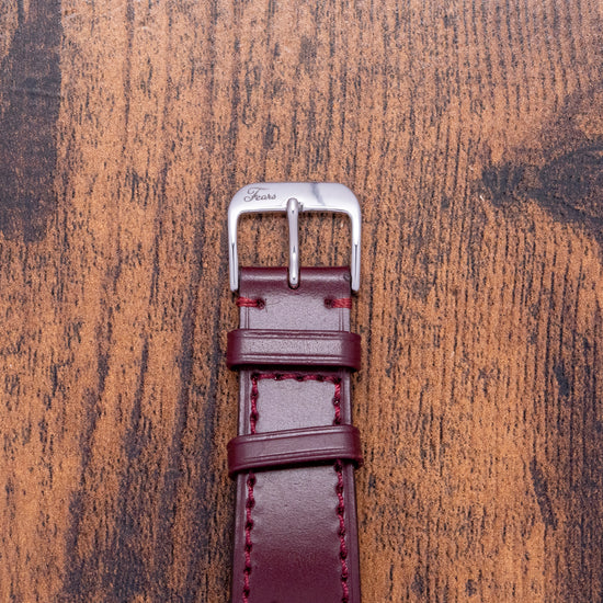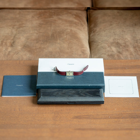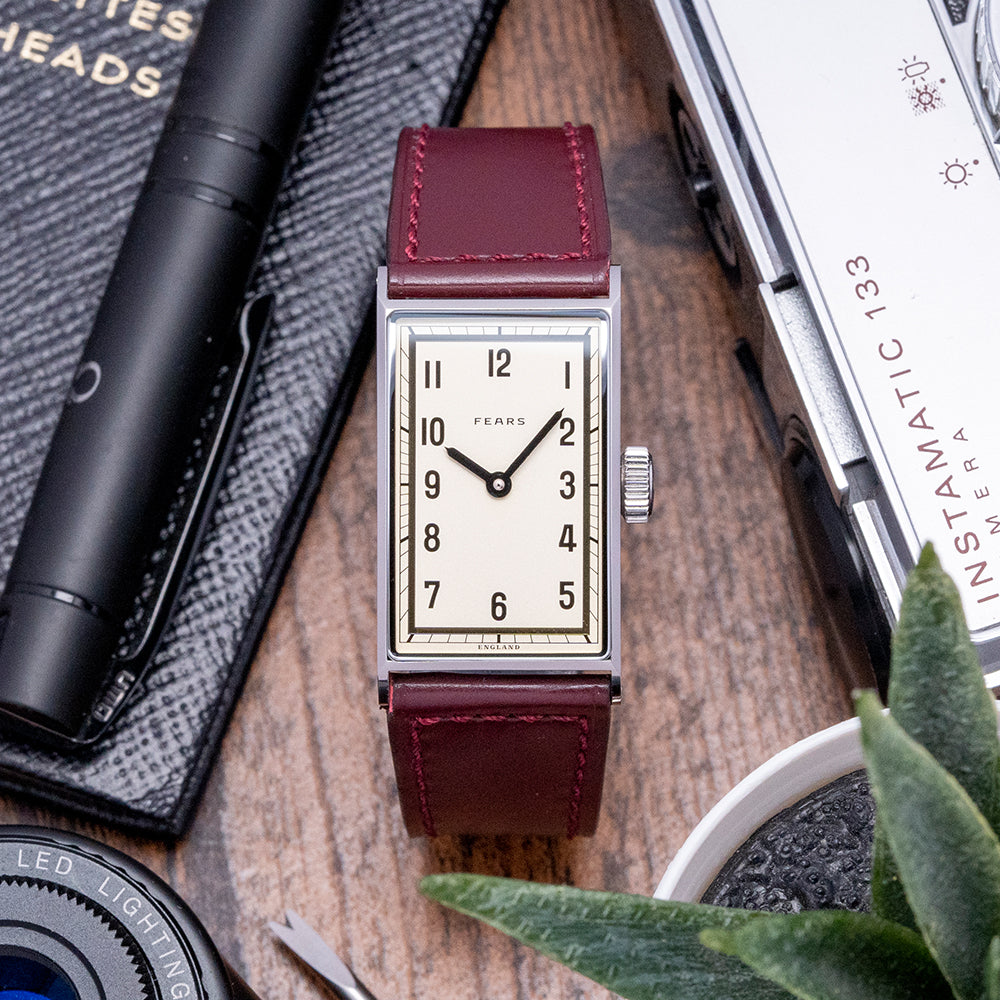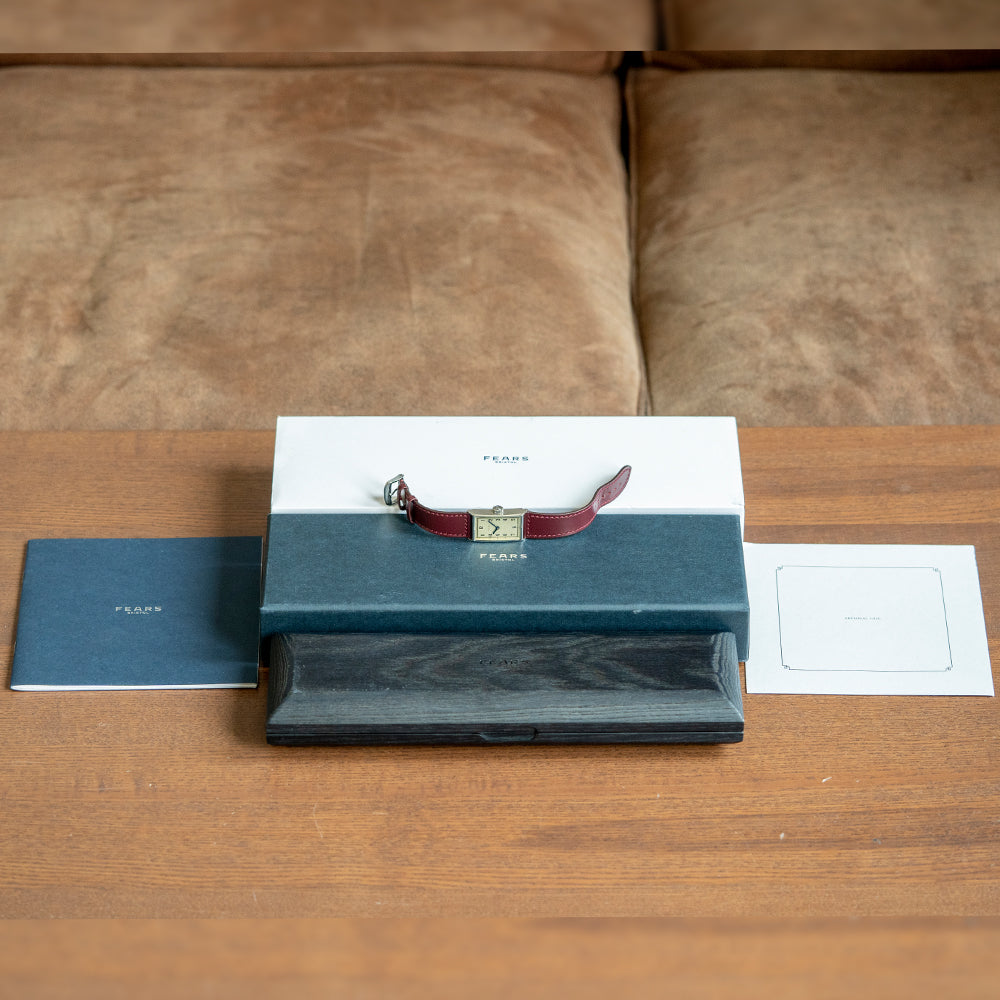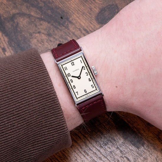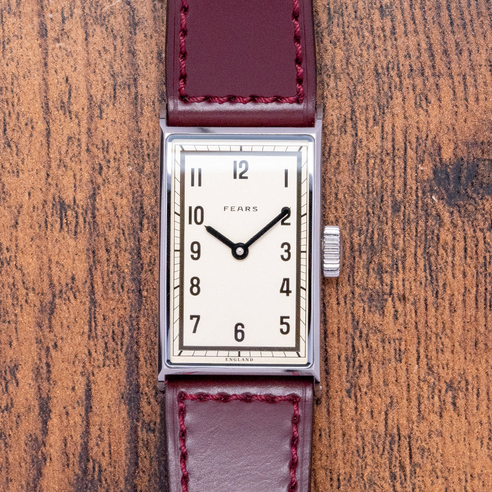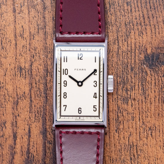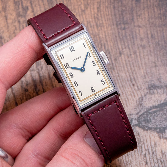 Created to coincide with the 175th Anniversary of the founding of Fears, the Archival 1930 is a proportional recreation of an art deco watch Fears made in 1930, true to the original, each watch features an original vintage movement. Its elegant form makes it a perfect luxury rectangular watch for men or women, made in a strictly limited run of 175, each piece has a unique serial number engraved between the lugs at 12 o’clock, this number can identify the watch's history from its master database. The Archival 1930 features the years the company was operational; 1846-1976 and 2016-2021, proudly engraved on the case back. The case is expertly machined from 316L Stainless Steel, in Germany, to a level usually reserved for precious metals, proportionally the same as the original but slightly larger to make it more contemporary. The long slim case and crystal have a subtle curvature that beautifully follows the curve of your wrist and a large crown has a deeply engraved tip with the Fears Pipette logo. The dial’s base is polished and plated in 18ct Yellow Gold, with the rest of the dial layered over the top. An outer minute track is precisely printed, and a real gold border shines through the matte Champagne finish that is subjected to a light 18t yellow gold plating. In contrast, the crisp glossy black Art Deco numerals mark the hours for that vintage aesthetic, the solid Fears-shaped hands are hand polished and shaped, and their rich blue colour makes for a highly legible dial. On the reverse, we have a snap-off stainless steel case back with attractive vertical brushing and deep engraving of “1960”. Inside The Archival 1930, is an original ‘new old stock’ movement that Fears used in the past, the manually wound ETA 2360 movements date back to the 1960s and having never been used previously have undergone full reconditioning in the workshop while receiving an upgraded mainspring to improve reliability, each of these original rectangular movements is thus effectively hand-built in the traditional way with each movement taking days to assemble and regulate. Fitted on a handmade Bristol Leather strap in a traditional Oxblood Red and lined in soft Fears, Blue Alcantara, its calf leather is vegetable tanned in one of Britain's oldest tanneries in Bristol- Thomas Ware & Sons. The stainless steel pin buckle has its 1930s Fears logo deeply engraved on the polished top of the buckle. The Fears Archival 1930 is presented in a rectangular, wooden box made of solid English ash and stained in our bespoke Fears Blue colour and on the top of the box, the Fears logo is subtly engraved.