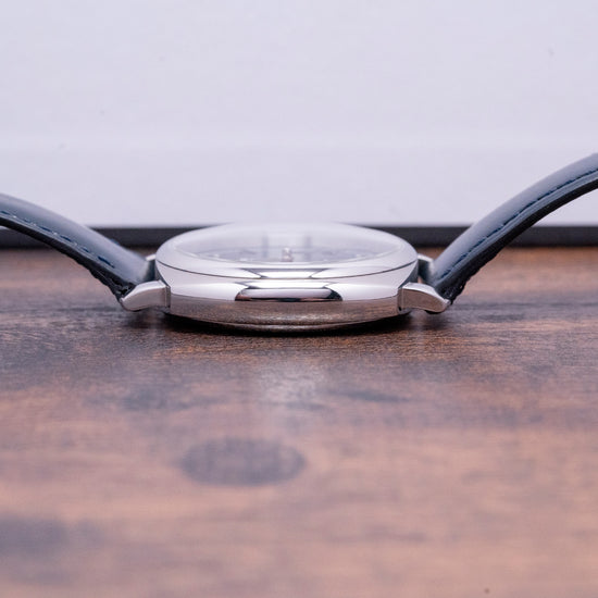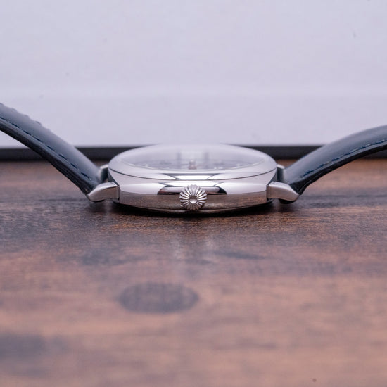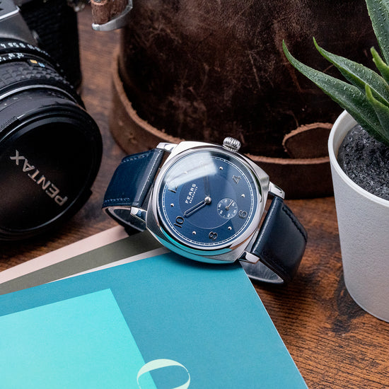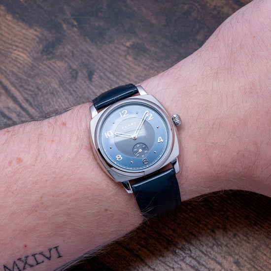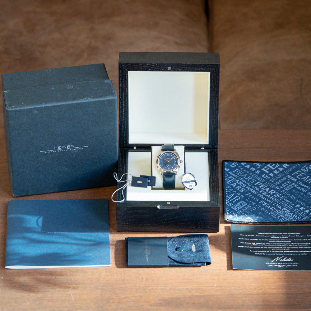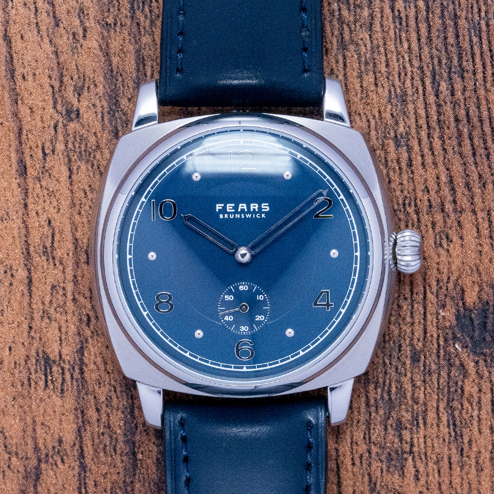 Here you have the opportunity to purchase a 2021 Fears Brunswick Blue which is now "Discontinued". Made in small batches each piece has a unique serial number engraved between the lugs at 12 o’clock, this number can identify the watch's history from its master database. The inspiration for the case comes from a Fears watch originally made in 1924. Manufactured in Germany, its wonderfully curvaceous 38mm case is made from 316L stainless steel, the case has only one flat surface, its rear sapphire crystal. The finish and depth of polishing are quite exquisite and showcase the skill and attention to detail of the German manufacturers, and a lug-to-lug length of 43mm and a case thickness of 11.5mm ensures a comfortable fit. To facilitate daily winding the watch features a traditional “onion” shaped crown, this being made in Switzerland. On the dial, numerals expertly applied by hand, capture and play with the light as you gently wind the crown to begin your day. A domed sapphire crystal sits above an incredible Fears Blue dial. The blue, at first glance, appears two-tone but it's when you tilt the watch that you capture its true beauty of tri-tone. Made in Germany by one of the world's finest dial makers, they use 56 production processes to achieve this spectacular dial. It is made up of 3 layers and two surface finishes combined with a galvanic blue coating. The ring of the dial on which the numerals sit is hand-brushed meaning the surface is unique to each watch. Truly a masterclass in dial manufacture. Hand-applied numerals and pips marking the hours are machined from brass and polished to a mirror finish. They then receive a Rhodium coating to give a brilliant shine. This same Rhodium coating is given to the elegant skeletal “Fears” Hands which are all finished by their expert in-house watchmakers in the UK creating depth and finishing that has rarely been seen on mass-produced, stamped hands. Watch hand production and construction is a practice performed by only a handful of British watch brands. Inside we have a hand-wound ETA 7001, 17 jewels, 18,000 beats per hour. First introduced in the 1970s it quickly gained a reputation for being reliable. Its slim design incorporates an Incabloc shock system. Each movement is serviced and hand-finished here in Britain, applying Côtes de Genève striping and Rhodium plating. Once re-assembled and thoroughly tested it receives its “Golden Pipette” which is handmade and applied to the bridge. Fitted on a 20mm handmade Fears Blue Bristol leather strap, its calf leather is vegetable-tanned in one of Britain's oldest tanneries in Bristol- Thomas Ware & Sons. The accompanying stainless steel pin buckle carries the final flourish of an engraving of the Fears pipette logo. This watch is sold with its original Fears presentation box, swing tags, Fears travel pouch and paperwork.