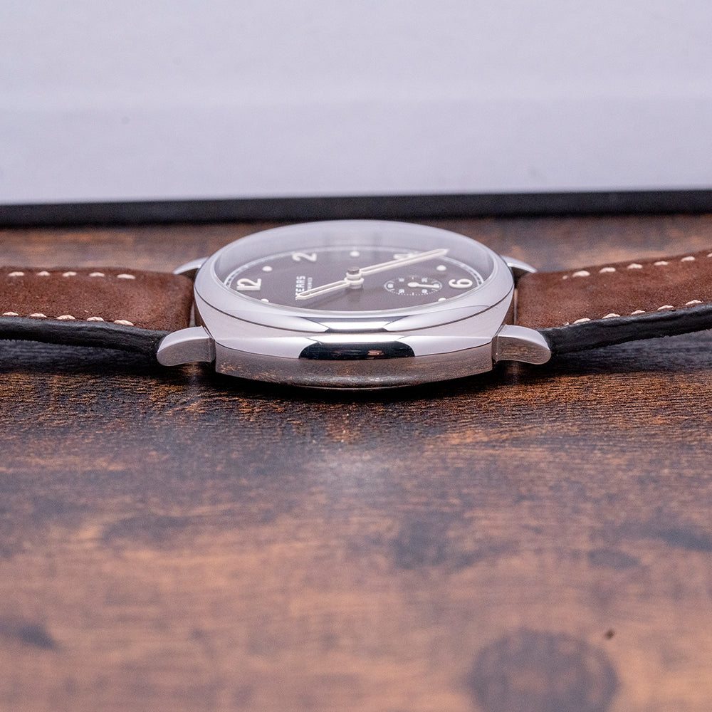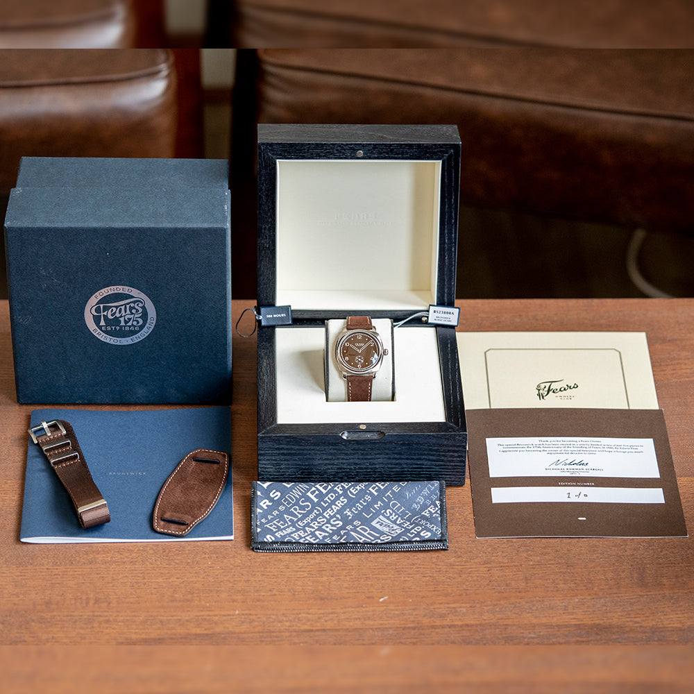 Here we have a 2021 Fears Brunswick Brown 175th Anniversary, hand-built in Britain with a limited run of just five pieces; this is number one of five. A unique serial number is engraved between the lugs at 12 o’clock; this number can identify the watch's history from its master database. The inspiration for this watch case comes from a Fears watch originally made in 1924. Manufactured in Germany, its wonderfully curvaceous 38mm case is made from 316L stainless steel, and the finish and depth of polishing are quite exquisite. A lug-to-lug length of 42mm and a case thickness of 11.8mm ensures a comfortable fit on your wrist, and to facilitate daily winding the watch features a traditional “onion” shaped crown, this being made in Switzerland. On the dial, numerals expertly applied by hand, capture and play with the light as you gently wind the crown to begin your day. A domed sapphire crystal sits above an incredible Fears Brunswick Brown dial; the Burnt Ochre dial undergoes an extraordinary 59 production processes to achieve its multi-tone colour; the dial is made up of a galvanic coating of Rhodium and a clear lacquer, which has a bespoke shade of brown pigment. The ring of the dial on which the numerals sit is hand-brushed, meaning the surface is unique to each watch, which is truly a masterclass in dial manufacture. Hand-applied numerals and pips marking the hours are machined from brass and polished to a mirror finish; they then receive a hand-painted cream enamel coating; this same hand-painted cream enamel coating is given to the elegant skeletal “Fears” Hands, which are all finished by their expert in-house watchmakers in the UK creating depth and finishing that has rarely been seen on mass-produced, stamped hands. Watch hand production and construction is a practice performed by only a handful of British watch brands. On the reverse, we have a case back with the 175th Anniversary logo, laser engraved; the number out of 5 is also engraved at the bottom. Inside, we have a hand-wound ETA 7001, 17 jewels, and 18,000 beats per hour, first introduced in the 1970s, it quickly gained a reputation for being reliable, and its slim design incorporates an Incabloc shock system. Each movement is serviced and hand-finished here in Britain, applying Côtes de Genève striping and Rhodium plating; once re-assembled and thoroughly tested, it receives its “Golden Pipette '' which is handmade and applied to the bridge. The watch comes with two 20mm straps, a rich chocolate brown Bund strap handmade in Belgium from European Buffalo nubuck, and a brown Regular NATO strap with seat belt weave; the accompanying stainless steel pin buckle carries the final flourish of an engraving of the Fears pipette logo. The Brunswick Brown is presented in a bespoke wooden box, crafted in Britain from English Ash, which is stained Fears Blue and lined in genuine cream suede; the watch sits proudly on a special cushion.
