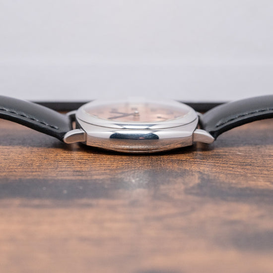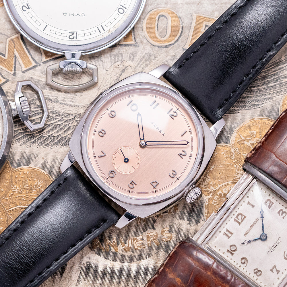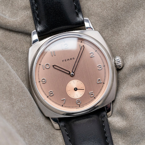 Here we have a 2021 Fears Brunswick Salmon Dial Exhibition Back, made in small batches; each piece has a unique serial number engraved at 12 o’clock between the lugs. The inspiration for this watch's case comes from a Fears watch originally made in 1924; its curvaceous 38mm case is made from 316L polished and brushed stainless steel, and on the right side is a traditional “onion”- shaped crown. The polished flanks lead to a comfortable lug-to-lug length of 43mm and a case thickness of 12mm. A domed sapphire crystal sits above an incredible Copper Salmon dial. This special dial was first used on Fears watches of the 1940s and 50s; its rich tone is created by galvanic coatings of 18ct rose gold and copper, with vertical brushing. Concentric circle finishing on the sunken sub-seconds at 6 o’clock. The numerals are diamond-polished, sand-blasted, and coated in anthracite to give a warm, grey finish. Inspired by the many different typefaces Fears has used throughout its history, they were designed especially for Fears by a horological typographer. Skeletonised thermally blued hands complete this dynamic timepiece. On the reverse, a screw-down exhibition case back and inside, we have a hand-wound ETA 7001, 17 jewels, and 18,000 beats per hour. It comes paired with two 20mm Fears straps with its signed pin buckle engraved with the Fears pipette logo. This watch is sold with its original Fears presentation box, swing tag and paperwork.