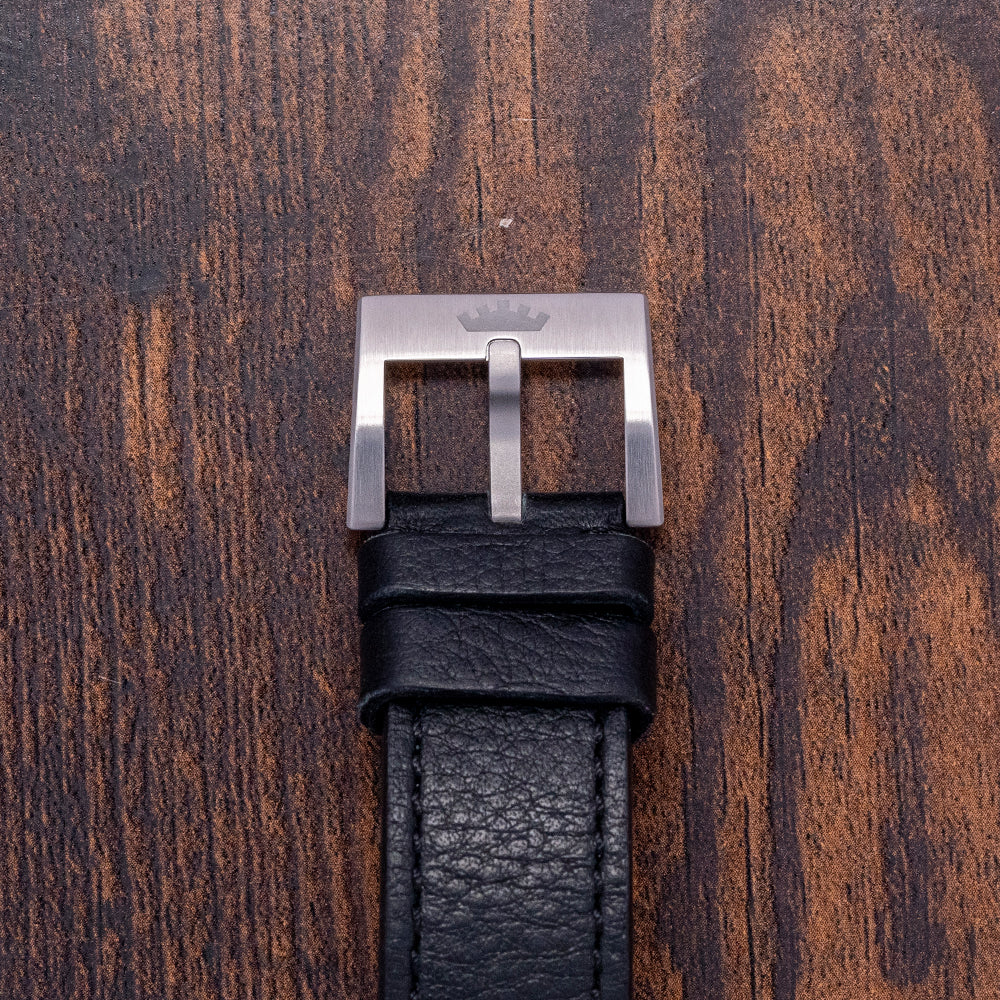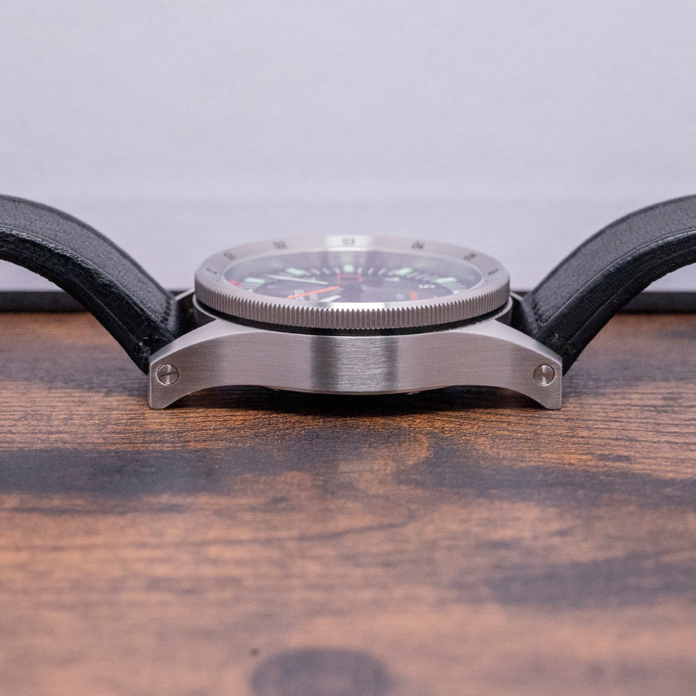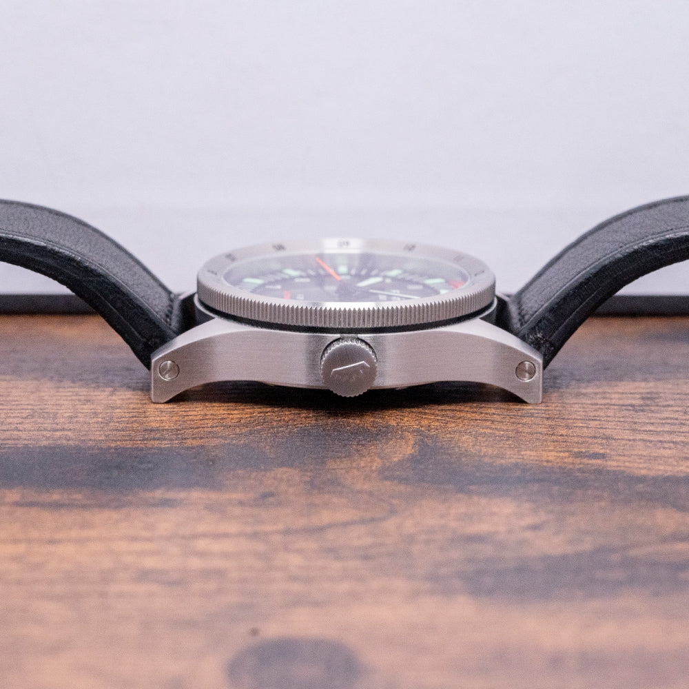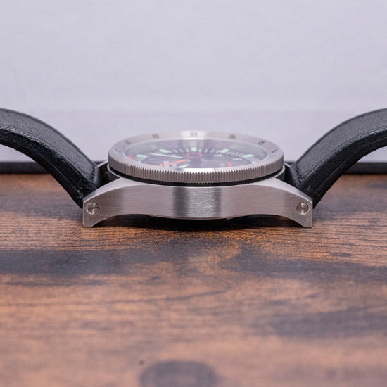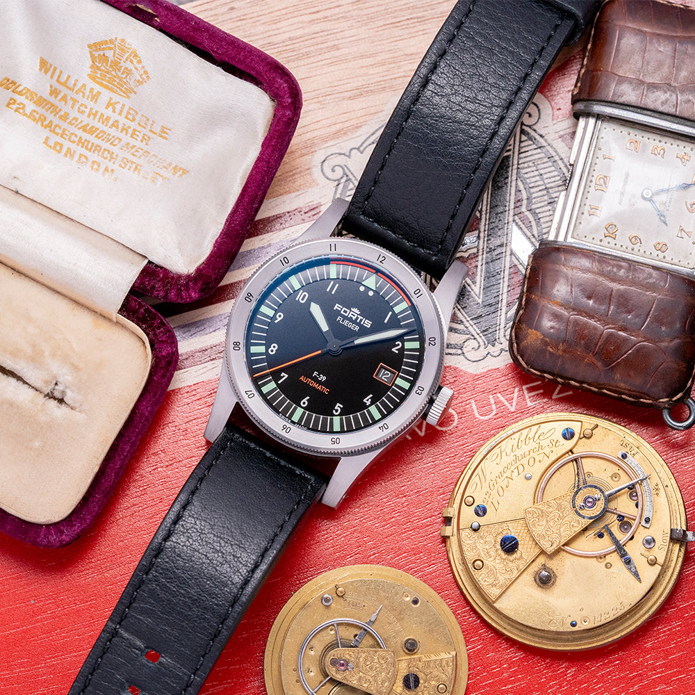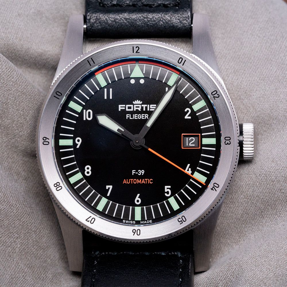 Here we have a classic 2021 Fortis Flieger F-39 Automatic Black dial; this modern interpretation of the Flieger has been part of the Fortis line for nearly 40 years since 1987. This model was created in collaboration with the Swiss Air Force. It has a 39mm brushed recycled stainless steel case that curves over your wrist thanks to the thick tapered drilled screwed lugs. The brushed flanks lead to a lug-to-lug length of 50mm and a case thickness of 12.5mm, giving the watch an impressive wrist presence. On the right side, there is a screw-down signed crown with deep knurling and a triple gasket system. The coin-edge bidirectional concave bezel has engraved 12-hour numerals and holds a flat sapphire crystal AR coated on both sides above a black dial. The crystal is protected by the concave nature of the bezel. A raised minute chapter ring has applied batons and triangle made of Pilot Green Superluminova®X1 Brixtrack® surrounding white Arabic numerals and double pips marking the hours, at 3 o’clock a orange framed colour matched date window, black metallic sword hands are coated in Pilot Green Superluminova®X1 and complemented by a tapered sweeping second hand coated in Orange Synchroline®, at noon we have the Fortis motif “Flieger” printed underneath and at 6 o’clock “F-39” and in orange “Automatic” completes this dynamic aviator timepiece. On the reverse, a screw-down solid case back engraved with the details of the watch around its edge and a propeller design in the centre, inside an automatic Fortis Cal. UW-30, a Sellita SW200-based movement beating at 28,800 beats per hour, has hacking seconds for precision setting. It comes paired with its 21mm Fortis black leather strap and signed pin buckle. The watch comes with its Fortis presentation box, swing tag, screwdriver and Fortis paperwork.