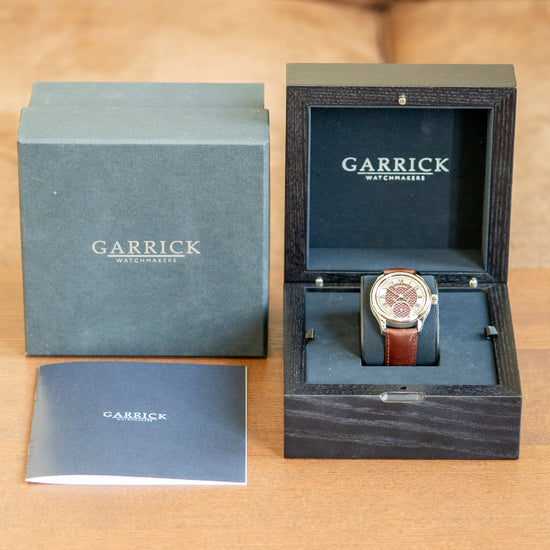 Here we have a 2021 Garrick S4 Plumb Special Dial GPHG Nominee, the Grand Prix d'Horlogerie de Genève, also known as GPHG, is one of the most prestigious award ceremonies in watchmaking., it highlights the industry's outstanding achievements by awarding a golden trophy to the most deserving and talented watchmakers. The curvaceous 41mm polished 904L stainless steel case gently curves over your wrist with finely tapered drilled lugs, and a lug-to-lug length of 50.5mm and a case thickness of 13mm ensures a comfortable fit. On the right side is an onion-style crown, a polished smooth bezel that holds a sapphire crystal AR coated above a stunning Plumb Special Dial. A circular brushed ring, hand frosted and Rhodium plated, has the minute track surrounding hand ink-filled Roman numeral indexes marking the hours; the 'guilloché' engine turned pattern uses a traditional rose engine lathe. Elegant Garrick-designed hands in stainless steel are complemented by a distinctive circular brushed ring, hand frosted, and Rhodium plated 'guilloché' engine turned sub seconds at 6 o’clock. The Garrick motif is screwed on at 12 o’clock, completing this incredible GPHG Nominee timepiece. On the reverse, a screw-down sapphire exhibition case back, inside manually wound Calibre BF03, 19 jewels, beating at 21,600 beats per hour, a heavily modified Swiss ETA Unitas 6498 movement, exquisitely decorated Rhodium-plated and frosted barrel and crown wheel cover proudly stating Garrick Watchmakers Made in England. The watch comes paired with a its 22mm plumb leather strap with its original Garrick Watchmakers signed pin buckle and is sold with its original Garrick Watchmakers box and paperwork.