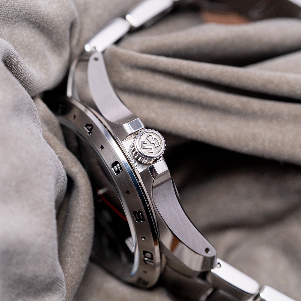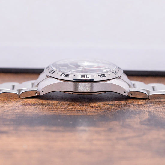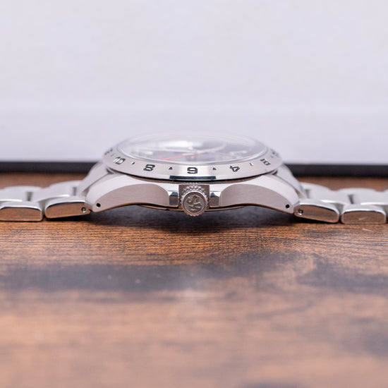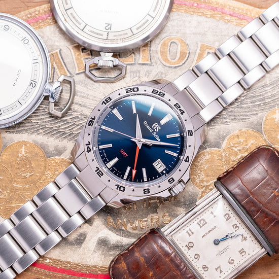 Here is a 2021 Grand Seiko GMT Quartz Blue SBGN005G from their Sports Collection. It has an impressively sculpted 39mm stainless steel case with exquisitely polished and brushed surfaces that curve over your wrist toward the drilled lugs. A lug-to-lug of 44.5mm and a case thickness of 11.5mm give the watch an impressive wrist presence. On the right side at 3 o’clock is a signed screw-down crown protected by crown guards, and a 24-hour satin-brushed steel fixed bezel with deeply engraved numerals filled in black holds a dual-domed sapphire crystal, AR-coated on the inside, above a dark sunburst blue dial. Applied Zaratsu polished facet-edged batons and trapezoid indexes mark the hours that play with the light as you rotate your wrist at 3 o’clock, a framed date window, an outer 24-hour chapter ring in blue for the night hours and silver for the daytime hours. Elegant dauphine hands are Zaratsu polished with razor edges filled with LumiBrite, a bright red arrow hand indicates the 24-hour position, and at 12 o’clock, we have the Grand Seiko motif and at 6 o’clock, a red “GMT”. On the reverse is a screw-down case back with the serial number engraved into it and a deeply embossed medallion in the centre, inside a Quartz Grand Seiko Cal. 9F86, this is a top-tier quartz movement. Seiko grows its own quartz crystals, and using a higher torque allows it to use these heavier GS hands, keeping its brand aesthetic intact. The watch comes fitted with its 19mm stainless steel bracelet, expertly brushed and polished, and features a push-button-release signed clasp, including all spare links. It also includes the Grand Seiko presentation box, swing tag, and paperwork.