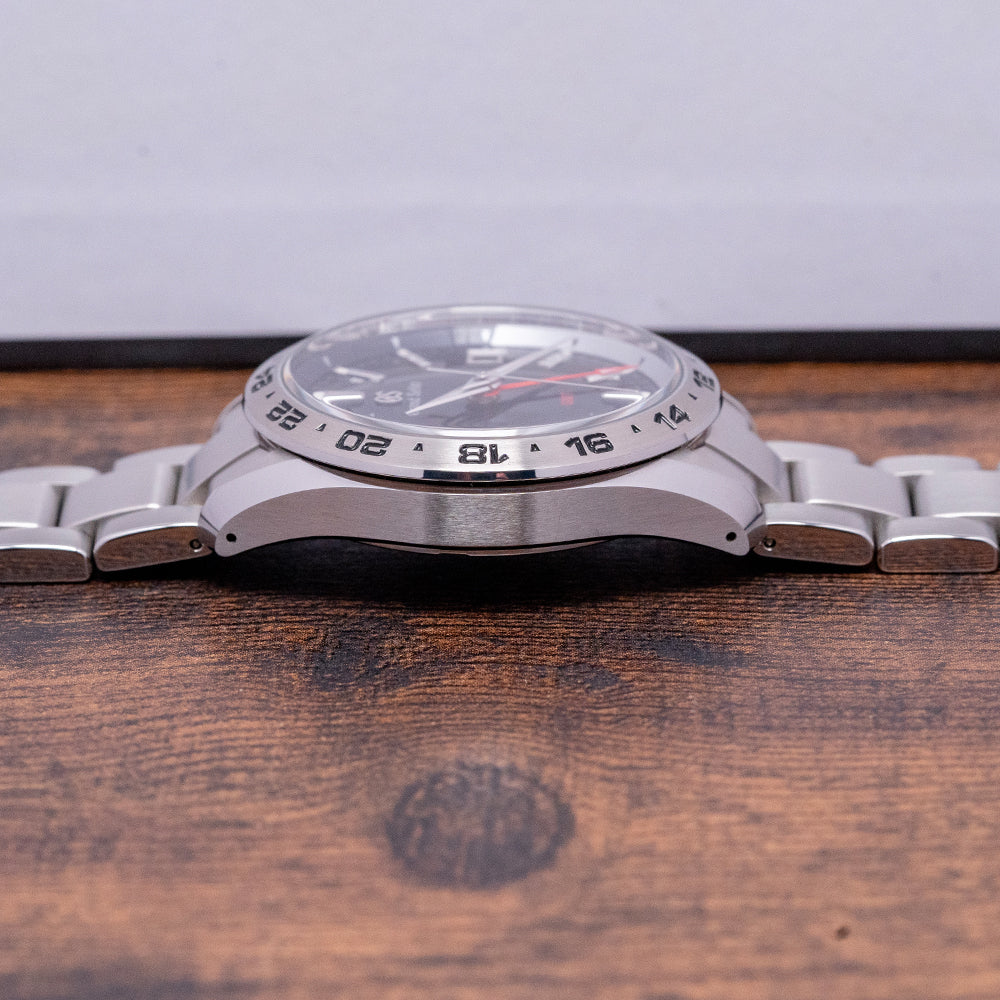 Here we have a 2021 Grand Seiko GMT Quartz Blue SBGN005G as part of their Sports Collection it has an impressively sculptured 39mm stainless steel case with exquisitely polished and brushed surfaces that curve over your wrist toward the drilled lugs and a lug-to-lug of 44.5mm and a case thickness of 11.5mm gives the watch an impressive wrist presence. On the right side at 3 o’clock is a signed screw-down crown protected by crown guards, and a 24-hour satin-brushed steel rotating bezel with deeply engraved numerals filled in black holds a dual-domed sapphire crystal AR coated on the inside above a dark blue dial. Applied Zaratsu polished facet-edged batons and trapezoid indexes mark the hours that play with the light as you rotate your wrist at 3 o’clock, a framed date window, an outer 24-hour chapter ring in blue for the night hours and silver for the daytime hours. Elegant dauphine hands are Zaratsu polished with razor edges filled with LumiBrite, a bright red arrow hand indicates the 24-hour position, and at 12 o’clock, we have the Grand Seiko motif and at 6 o’clock, a red “GMT”. On the reverse is a screw-down case back with the serial number engraved into it and a deeply embossed medallion in the centre, inside a Quartz Grand Seiko Cal. 9F86, this is a top-tiered quartz movement. Seiko grows its own quartz crystals, and using a higher torque allows it to use these heavier GS hands, keeping its brand aesthetic intact. The watch comes fitted on its 20mm stainless steel bracelet expertly brushed and polished with a push-button released signed clasp, and also comes with the Grand Seiko presentation box and unsigned papers.