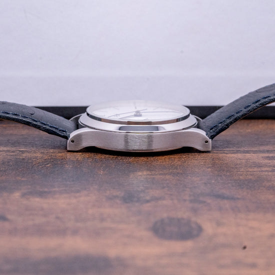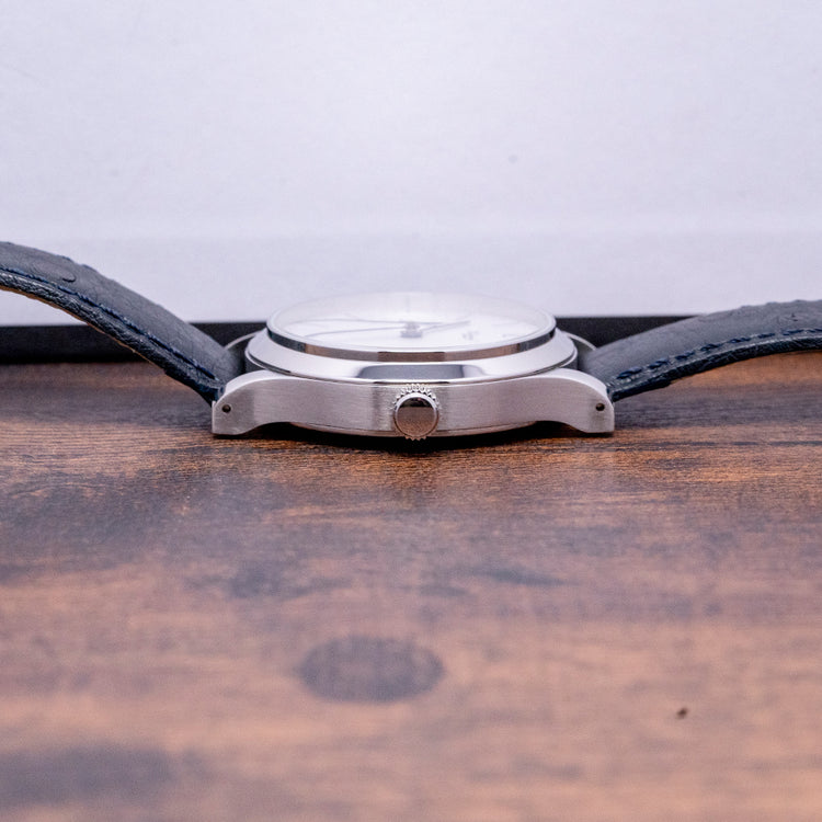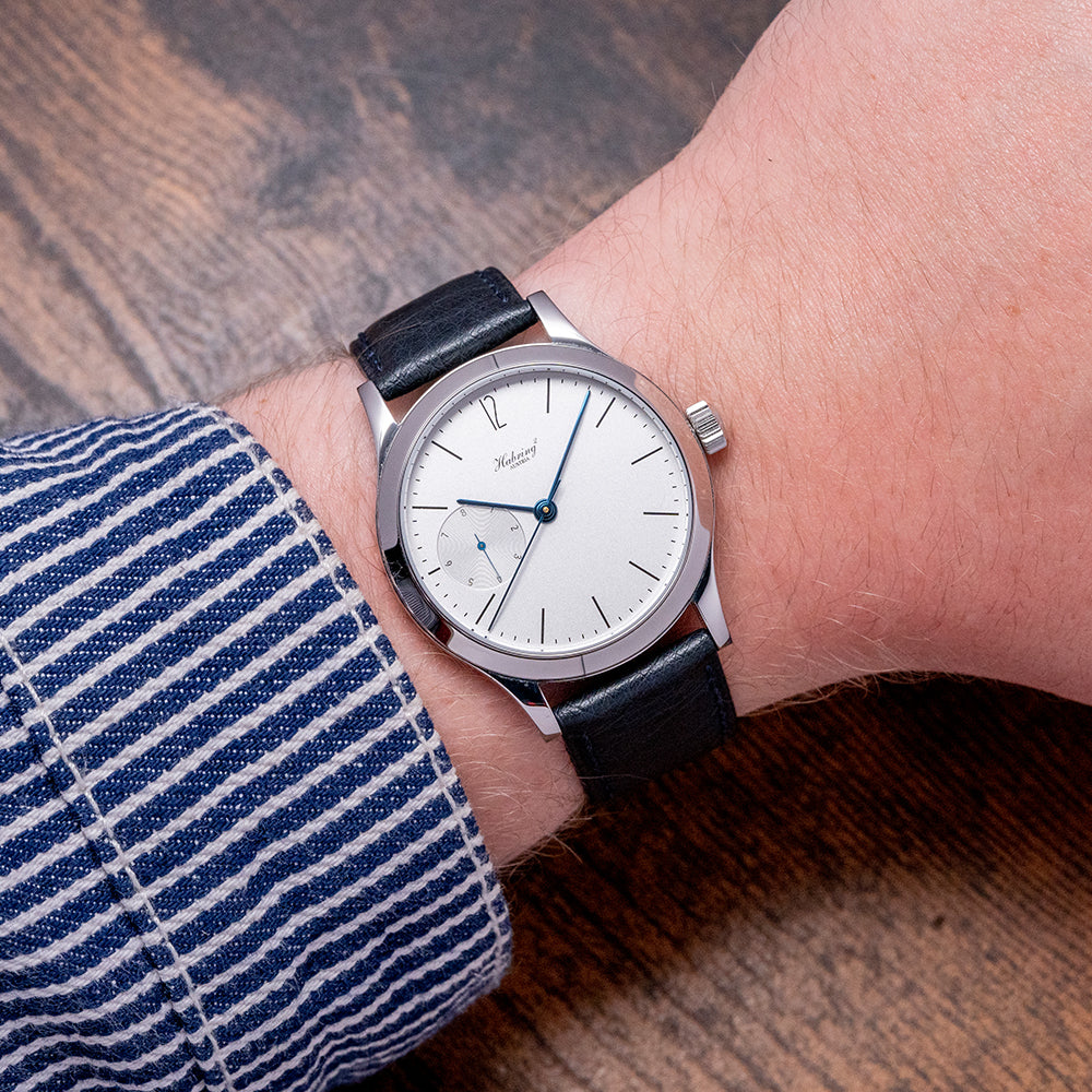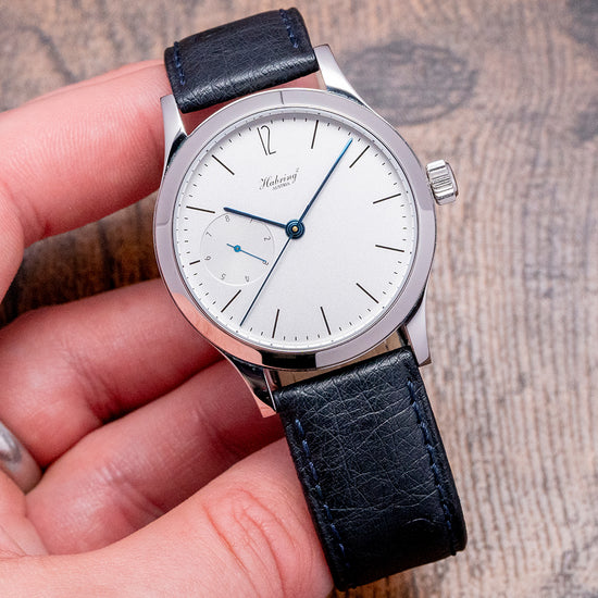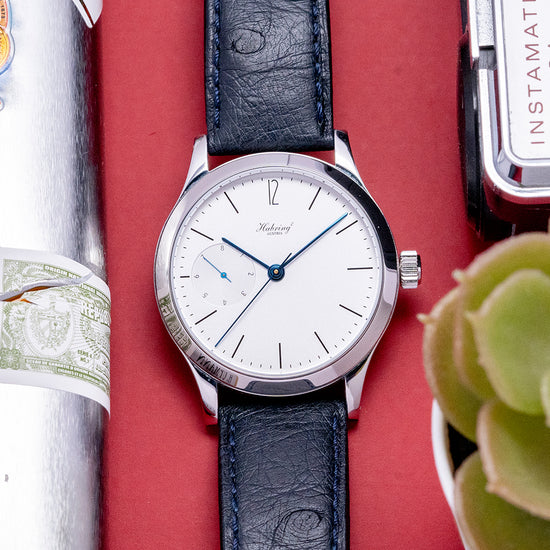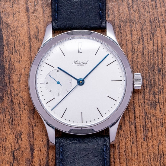 Here we have a 2021 Habring2 Foudroyante-Felix "White" Manually Wound with a 38.5mm stainless steel round case and long slim drilled lugs that curve over your wrist with a lug-to-lug length of 46mm and a case thickness of 12mm, ensuring a comfortable fit. The elegant profile has polished and brushed surfaces that transition perfectly, capturing the light as you move your wrist. Its polished bezel holds a curved sapphire crystal. On the right side is a crown with double seals; between the lugs at 6 o’clock, you will find the consecutive engraved serial number; this one is No.#16. The white dial has a granular texture, an outer minute track has a “12” alongside black slim stick indices marking the hours, and at 9 o’clock, a distinctive "flashing seconds" (Foudroyante) that rotates once per second, adding a dynamic motion to the dial and elegant blued steel slim stick hands complemented by a patented dead beat (jumping second) centre seconds finish off this classic understated timepiece. On the reverse an exhibition case back with sapphire crystal, inside an in-house manually wound Habring2 Cal. A11MF, 23 jewels, beating at 28,800 beats per hour, this refined movement is finely finished with blue screws, polished edges and perlage. An antimagnetic escapement with a Carl Haas hairspring to Chronometer standards. KIF shock protection complies with DIN and NIHS standards. The watch comes paired with two Habring² 20mm leather straps and also comes with its Habring² presentation box and papers.