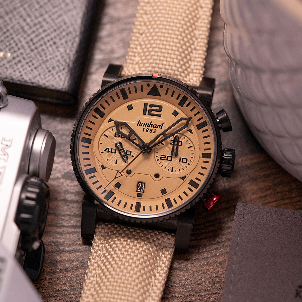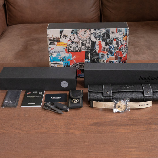 This watch is sold with its original Hanhart Box, travel case & Paperwork. The watch comes paired with its original 24mm sand-coloured strap with a black DLC deployment clasp. The watch is from August 2021 and is sold in unworn condition, as you can see from the photographs. The watch comes with our 12-Months Warranty.