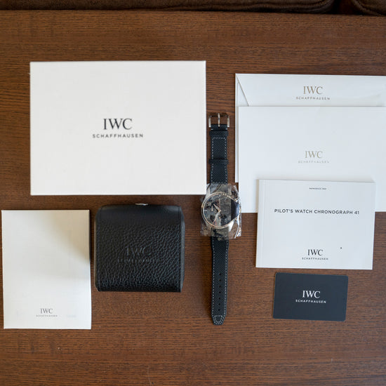 Here we have a 2021 IWC Pilot's Watch Chronograph Edition "C.03." IW388105 A collaboration with the Collective Horology, a Silicon Valley-based Online retailer offering many brands to enthusiasts in the US, since their founding in 2018 they have worked with Czapek, URWERK, IWC Schaffhausen, Zenith, H. Moser and many others on two distinctive projects which are the Collective Series and Portfolio Series, these watches are made available to the Collective members through their shop. Limited to 125 pieces, inspired by the IWC IW3706 from the 1990s. With a 41mm satin brushed stainless steel case with a soft-iron inner case that protects the watch from magnetic fields, a subtle curve of the case leads to flowing chamfer-edges tapered lugs, and a lug-to-lug length of 51.5mm and a case thickness of 14mm gives the watch an impressive wrist presence. Down the right side, we have the polished chronograph pushers and in the centre, a screw-down signed crown, the chamfer-edges smooth bezel holds a convex sapphire crystal AR coated on both sides. A matte black and grey monochromatic dial has an outer minute track with Arabic numeral and baton indexes coated in a grey Super-LumiNova luminance marking the hours, large Arabic numerals lay just underneath again coated in a grey Super-LumiNova luminance with the triangle and pips at 12 o’clock a characteristic seen on many pilot timepieces. At 3 o’clock a day/date window. The chronograph consists of a 30-minute register at 12 o’clock, a 60-second register at 6 o’clock and finally, a 12-hour register at 9 o’clock, each register having a concentric circular pattern. Elegant sword hands coated in luminance complemented with a tapered chronograph hand, at 3 o’clock we have the IWC motif completing this military-inspired chronograph. On the reverse, a screw-down exhibition case back, inside an automatic IWC Cal. 69385, 33 jewels, 28,800 beats per hour, based on the ETA 7750 movement, modified by IWC to their specifications and has a black skeleton nickel-plated signed rotor. The watch is paired with a 20mm black fabric strap with a signed buckle and the watch also comes with its IWC presentation box and papers.