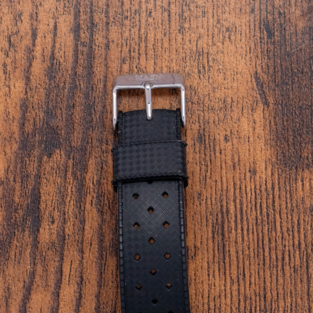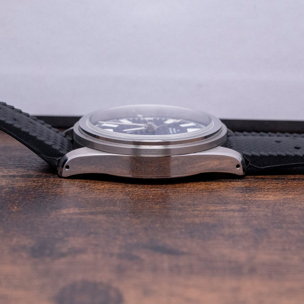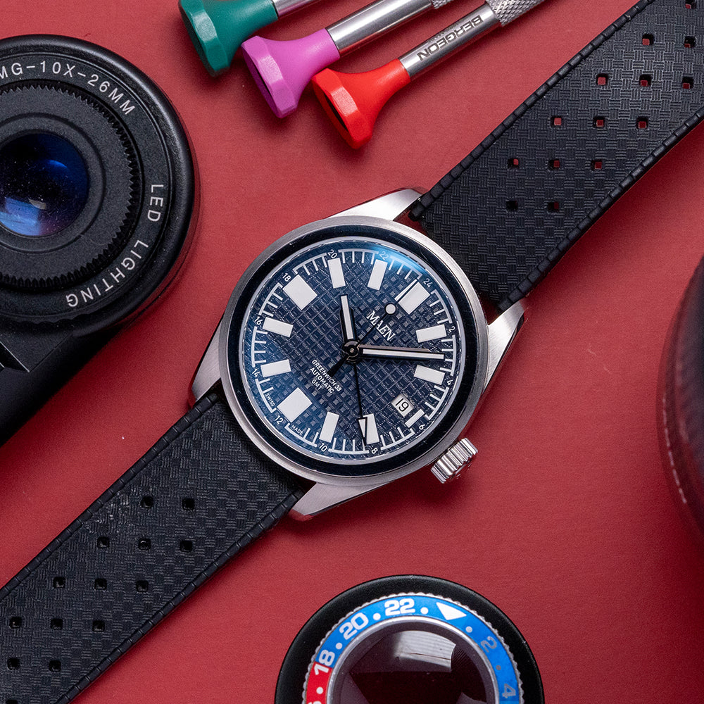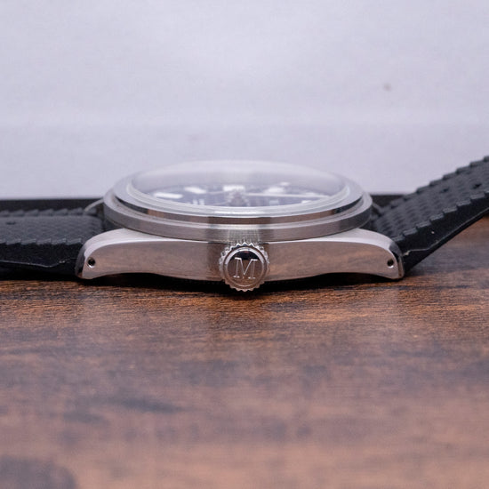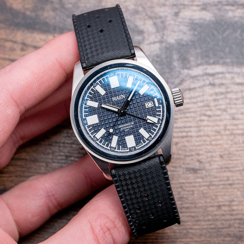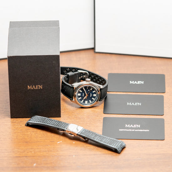 Here we have a 2021 Maen Greenwich 38 GMT Automatic MGG.02 limited, One of 300 pieces, with a 38mm polished and brushed 316L stainless steel case with drilled tapered lugs; the polished bevel edge of the case leads to a lug-to-lug length of 46mm and a case thickness of 12.5mm giving the watch an impressive wrist presence. On the right is a signed screw-down crown with deep knurling for extra grip. The stepped polished and brushed bezel holds a double-domed sapphire crystal AR coated sits above a dynamic glossy black enamel CLOUS DE PARIS pattern dial; an outer 24-hour chapter ring surrounds broad baton indexes filled with C1 X1 Superluminova marking the hours. At 3 o’clock, a date window. Signature Maen “Skyscraper” hands with an extended centre Super-LumiNova stripe are complemented by a lollipop counterweighted sweeping second hand and an arrow-tipped GMT hand. At 12 o’clock, we have the MAEN motif, and at 6 o’clock, “Greenwich 38”, "Automatic", and GMT" complete this striking travelling companion. On the reverse is a screw-down case back with the details of the watch engraved around its edge, inside an automatic SwissTech Cal. S24-045, 28 jewels, based in Hong Kong and their movements are produced in Switzerland and are a worthy alternative to the ETA and Sellita. It comes paired with its original and worn cut waffle 20mm custom-made fitted strap and signed butterfly clasp, plus an additional 20mm Tropic rubber strap and pin buckle. This watch is sold with its original MAEN box and original MAEN paperwork.