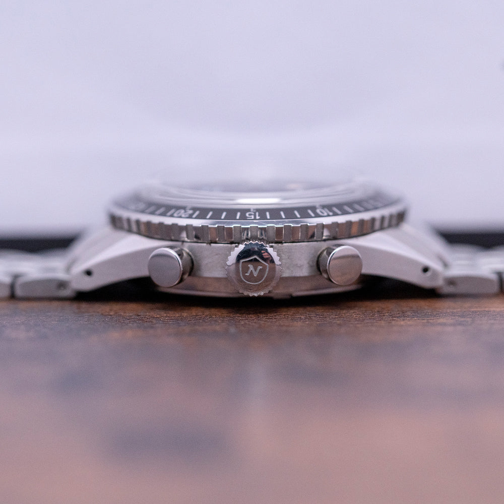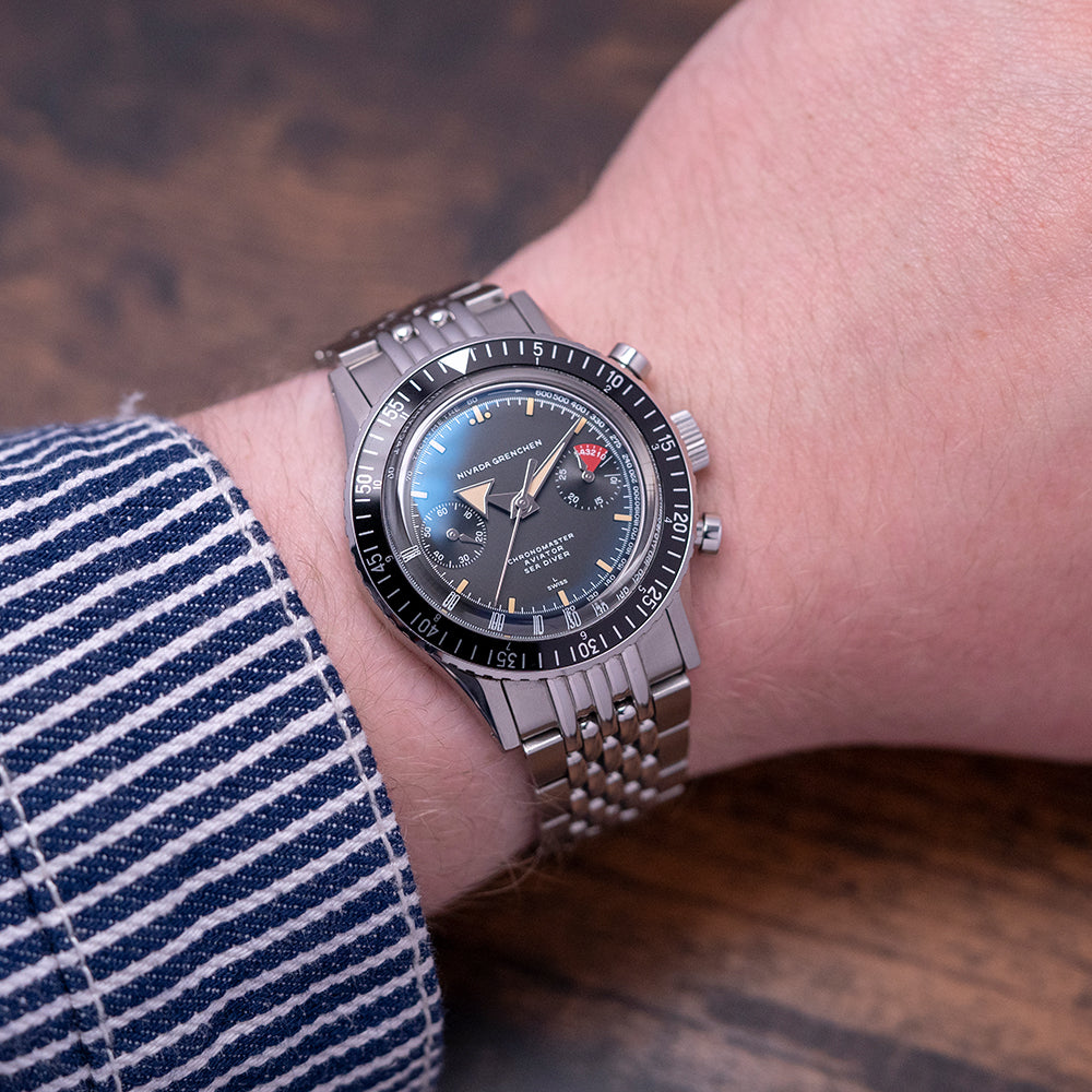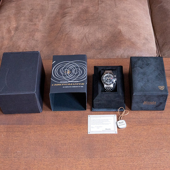 Here we have a 2021 Nivada Grenchen Chronomaster Broad Arrow Manually Wound, a faithful re-edition of the original Chronomaster from 1963, this versatile dive chronograph is designed for avid seafarers and adventurers and includes many useful complications. The polished and brushed 38mm stainless steel case curves over your wrist with long straight flat-ended drilled lugs, a lug-to-lug length of 46mm and a case thickness of 14mm giving the watch an impressive wrist presence, with a vintage aesthetic. Down the right side, we have the piston chronograph pushers and a signed crown in the centre. A no-click bi-directional stainless steel bezel has deep knurling for extra grip and a black anodised aluminium insert with a double scale of 60 minutes and 12-hour which is useful as a second timezone. A double-domed sapphire crystal sits above a matte black dial. The outer Tachymeter surrounds the minute track with baton indexes coated in cream SuperLumiNova marking the hours, at 3 o’clock a 30-minute register with the first 5 minutes in red that is used in Regatta Yachting as a five-minute countdown warning, at 9 o’clock the continuous small seconds. Steel Broad Arrow hands are infilled with cream SuperLumiNova and are complemented by a tapered chronograph hand. At 12 o’clock we have the Nivada Grenchen motif and at 6 o’clock “Chronomaster Aviator Sea Diver '' which highlights the watch's versatility, underneath the “L” Swiss which stood for Luminova a nice nod to the original. On the reverse a screw-down case back with the Nivada shield engraved into it, inside a manually wound Sellita SW510 M BH B, 23 jewels, beating at 28,800 beats per hour, a cam-operated chronograph, a clone of the 7750. The watch comes paired with a 20mm Nivada Grenchen Beads of Rice polished stainless steel bracelet with a signed fliplock folding clasp, all links are provided, and the watch comes with its Nivada Grenchen presentation box, swing tag and paperwork.