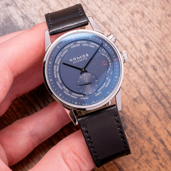 Here we have a 2021 Nomos Zurich World Timer Dark Blue 807 Automatic with a 40mm polished stainless steel case that gently curves over your wrist with angled tapered lugs, and a lug-to-lug length of 49mm and a case thickness of 11mm ensures a comfortable fit. Down the right side, we have a pusher to advance the capital city's disc and the hour hand, in the centre a signed crown sitting proud of the case, and on the left side at 8 o’clock a recessed pusher to advance the Home 24-hour disc. A smooth polished bezel holds a domed sapphire crystal AR coated on both sides above a galvanised dark blue multilayered dial. An outer minute chapter ring has a red indicator and a red house silhouette at 3 o’clock to highlight your home hour; the capital cities of the world sit behind the 24-hour GMT disc. Elegant Rhodium plated steel stick hands are complemented by sub-seconds at 6 o’clock, and at 12 o’clock we have the Nomos motif completing this dynamic travelling companion. On the reverse a screwed-down exhibition case back showcasing the in-house automatic Nomos Cal. 5201, 26 jewels, a bidirectional skeletonised rotor, a world-time mechanism, Rhodium-plated surfaces, perfectly decorated with blued screws, Glashütte stripes and NOMOS perlage. The watch comes paired with a 21mm Horween shell cordovan leather strap and polished signed pin buckle, and the watch comes with its Nomos presentation box, travel case and Nomos paperwork.