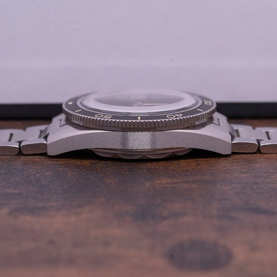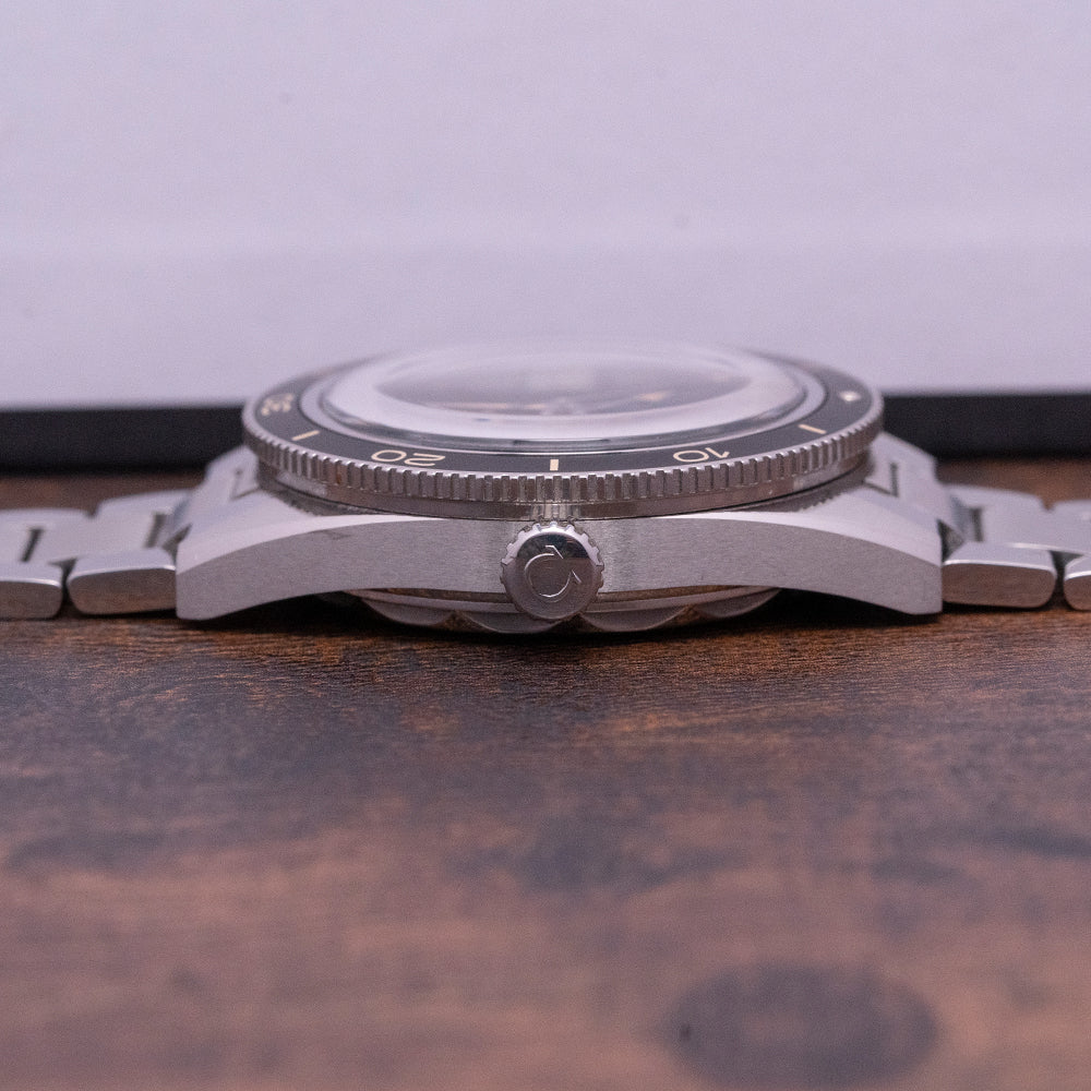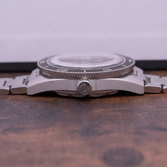 Here we have a 2021 Omega Seamaster Heritage Black 324.30.41.21.01.001 with a curvaceous 41mm stainless steel case that curves over your wrist with tapered flat-ended lugs. A modern interpretation of the 1960s Seamaster 300 with a contemporary case size and modern movement, it is part of their Heritage collection. A lug-to-lug length of 48mm and a case thickness of 13.5mm give the watch an impressive wrist presence, satin-brushed and polished surfaces transition with crisp lines. On the right side is a signed screw-down crown, and the unidirectional 120-click bezel has a coin edge and a 60-minute black anodised aluminium insert holding a domed sapphire crystal AR coated on the inside above a black sandwich dial. A lower layer of aged SuperLuiNova and an upper layer with cut-out Arabic numerals and dagger indexes marking the hours. Steel broad arrow hands infilled with aged SuperLumiNova are complemented by a lollipop counterweighted sweeping second hand, when charged up the bezel and dial glow a distinctive blue with the pip and minute hand glowing a bright green, at 12 o’clock we have the Omega motif and at 6 o’clock “Seamaster 300” complete this versatile vintage-inspired dive watch. On the reverse a screw-down sapphire exhibition case back showcasing the automatic Omega Co-Axial 8912, 38 jewels, 25,200 beats per hour, certified by the Swiss Federal Institute of Metrology (METAS), the watch goes through COSC certification before being selected for the eight tests run by METAS, this in-house movement released in 2015 is Chronometer Certified with a bi-directional rotor which reduces winding time and a Co-Axial Escapement, two barrels in series for excellent stability and durability and a silicon balance spring providing the movement resistance to magnetic fields of over 15,000 Gauss, decorated with Cotes de Geneve. The watch comes paired with its Omega 21mm brushed and polished stainless steel bracelet with a signed push button release folding clasp, all links included and the watch comes with its Omega presentation box, swing tag and papers.