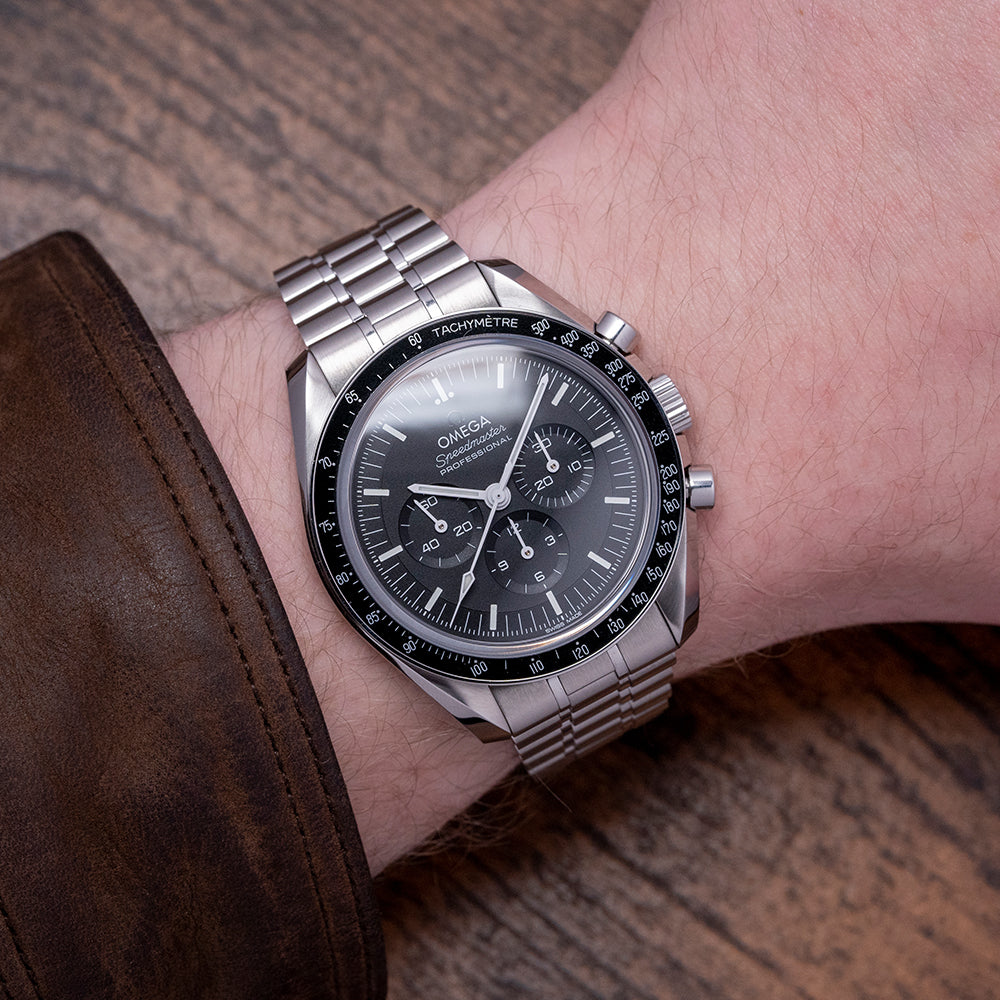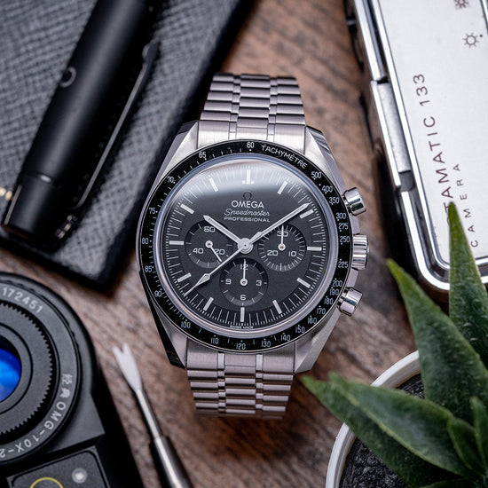 Here we have a 2021 Omega Speedmaster Professional Sapphire Cal. 3861 with a 42mm stainless steel case that has polished and brushed surfaces that lead to the characteristic twisted tapering lugs, the crisp lines transition effortlessly around the case and a lug-to-lug length of 47mm ensures a comfortable fit on the wrist. Down the right side, we have the recessed piston chronograph pushers and a signed crown in the centre. A fixed tachymeter sits on its black bezel. The black dial is protected by Sapphire crystal AR coated on the inside, and an outer minute track with slim baton indexes marks the hours, 3 recessed Sub-dials are made up of 60 seconds, 30 minutes, and 12 hours. Slender sword hands and an elegant long central chronograph seconds hand accurately hit the minute track, the dial has perfect symmetry and hands and indexes are lumed with Super-Luminova. The screw-down sapphire exhibition case back is engraved with “The First watch worn on the Moon” a fitting testament to man's achievements in space, inside we have the manually wound Omega Master Chronometer Calibre 3861 featuring a CO-Axial and column-wheel, COSC-certified 26 jewels, 21,600 beats per hour, decorated rhodium-plated movement with Geneva waves, METAS (Federal Institute of Metrology) also certified this special movement with additional measurements of precision, performance, and anti-magnetic resistance. The continued commitment by Omega to push the envelope of a watch and its movement means it is still the only flight-qualified watch that meets the requirements for EVA (Extravehicular activity) – outperforming quartz watches, with LCD displays, which are vulnerable to temperature changes, and literally, get destroyed when on spacewalks. The watch comes fitted on its original Omega 20mm Stainless Steel brushed and polished bracelet with a signed push-button release deployment clasp that fits the wrist comfortably and also comes with its Omega presentation box, swing tag and paperwork.
