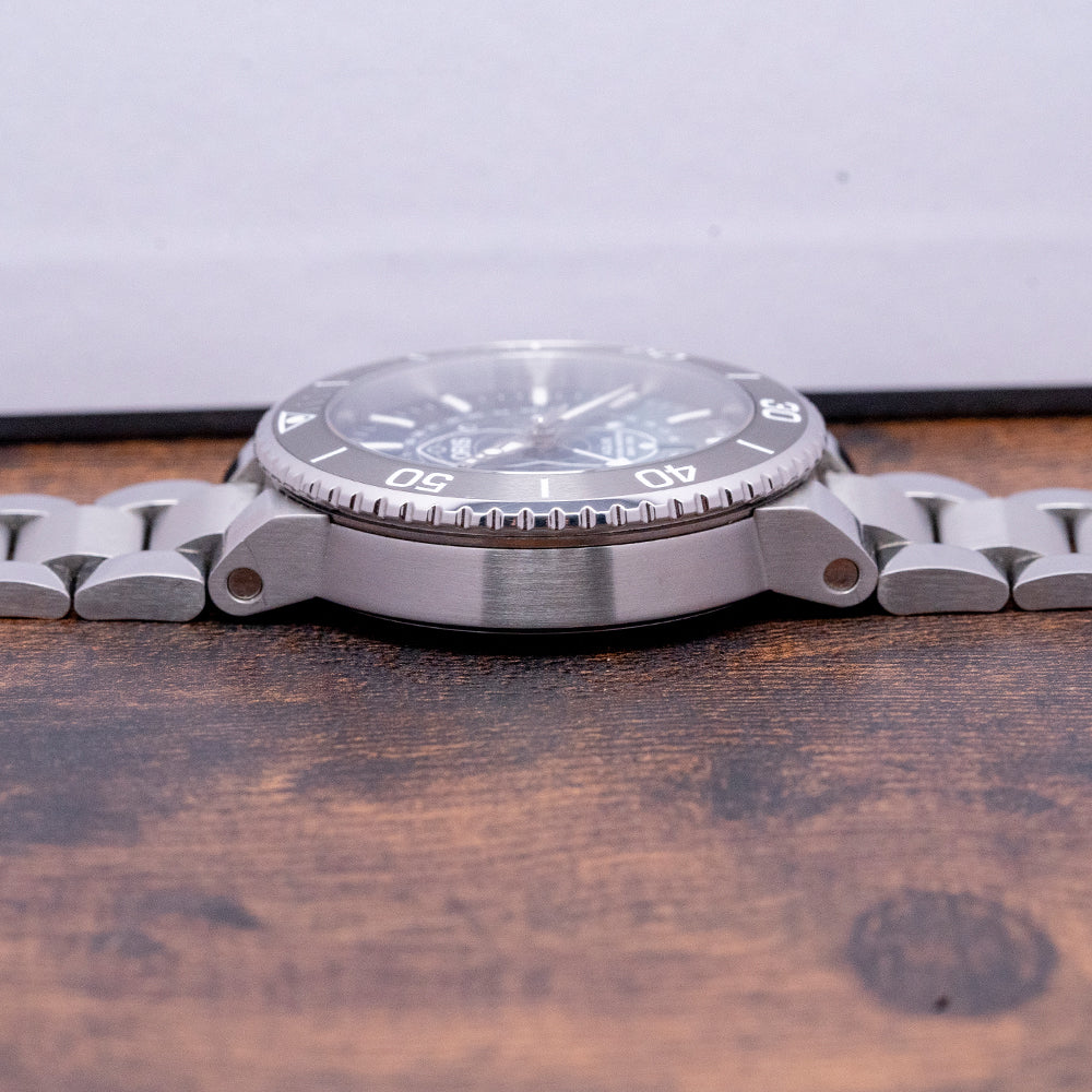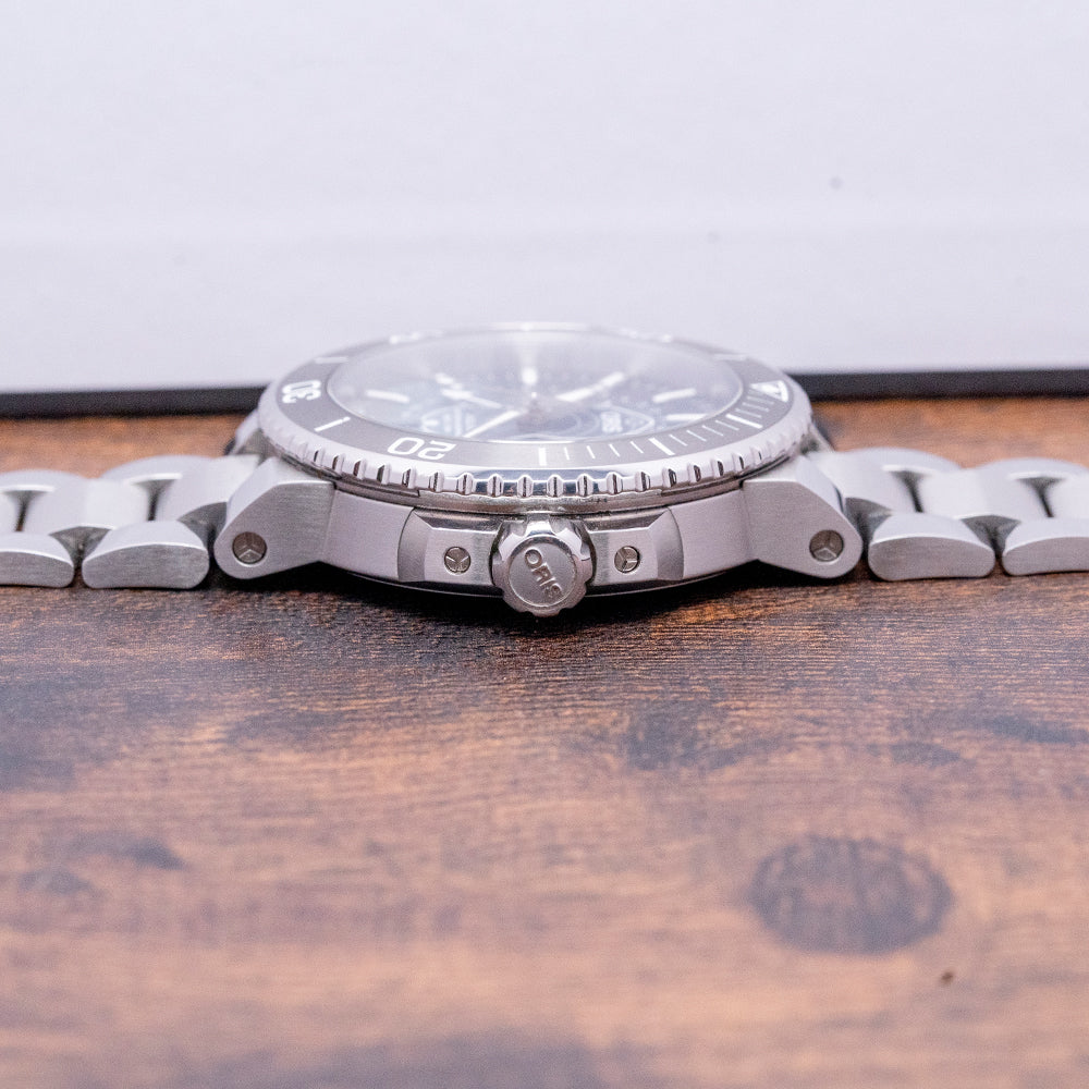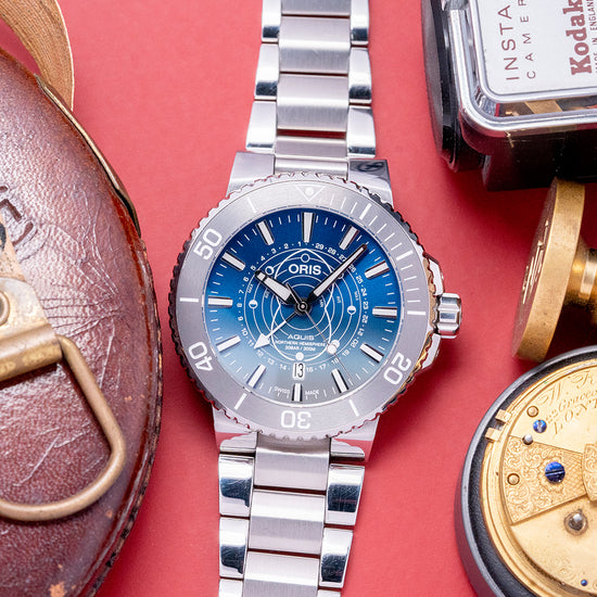 Here we have a 2021 Oris Aquis Dat Watt Limited Edition 01 761 7765 4185 with a 43.5mm stainless steel case that has brushed and polished surfaces, with thick angled drilled lugs, for a comfortable fit on the wrist. This limited edition of 0428/2,009 pieces is made in collaboration with the Common Wadden Sea Secretariat, whose mission is to conserve the Wadden Sea, the world’s largest tidal system and a UNESCO World Heritage Site and is named after the local dialect DAT Watt of the Wadden Sea. The muscular profile leads to a lug-to-lug length of 50mm and a case thickness of 13.5mm, giving the watch an impressive wrist presence. A signed screw-down crown protected by crown guards. A unidirectional stainless steel bezel with deep knurling for grip and a Tungsten 60-minute dive insert. The Sapphire crystal is domed on both sides with AR coating on the inside protecting the blue Fumé dial, which goes from grey on the bottom edge to deep blue, reflecting the night sky with broad faceted baton silver-toned indexes filled with Super Luminova luminescence marking the hours. We have a symbolised 29.5-day lunar cycle moonphase and Northern Hemisphere Tidal range with an arrow point indicator in the centre of the dial. The handset used has sword-shaped silver-toned hour and minute hands filled with Super Luminova luminescence, along with a centre-sweeping second's lollipop hand. A date window at 6 o’clock has a contemporary design of black numerals against a white background. On the reverse, a screw-down case back is embossed with the moon and ocean in the centre and the watch details and a limited number around its edge, inside is the automatic Oris Cal. 761, based on the Sellita SW200-1, the balance has a frequency of 28,800 beats per hour, and the movement contains 26 jewels. The watch has a chunky integrated brushed stainless steel bracelet with a push-button release folding clasp and comes with its Oris presentation box and papers.