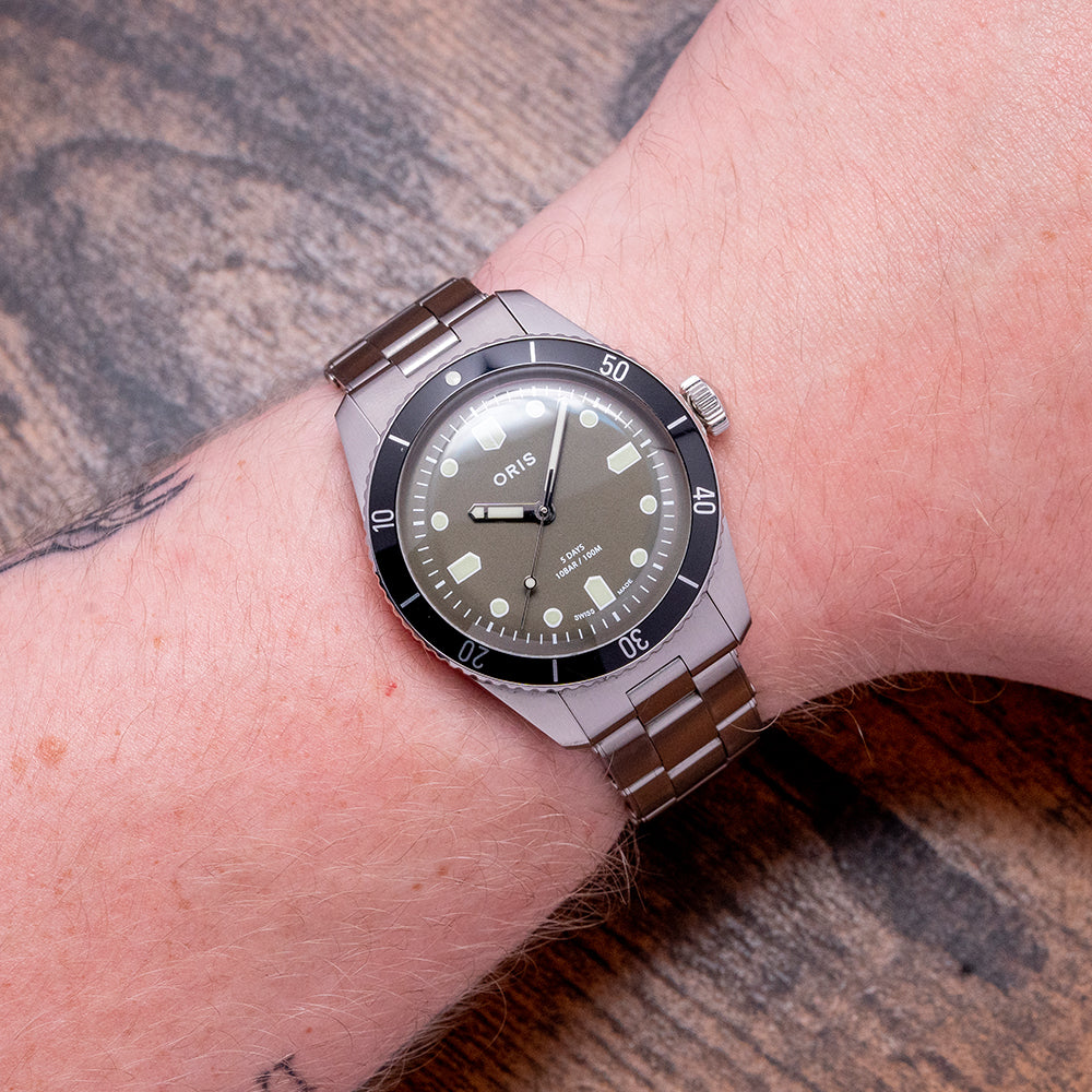This Oris & Hodinkee limited edition is wonderful on the wrist at 38mm and provides all the vintage charm you want whilst being built to a modern standard with an impressive 5-day automatic Oris Calibre 400 that also fills the exhibition case back beautifully. This subtle forest green dial morphs with the light, in certain lights, it will be a dark grey tone, in others a deep and rich green, a surprisingly dynamic choice of dial colour which contrasts perfectly against the black aluminium bezel. I would not hesitate to book an appointment and check this one out on your wrist for yourself, you won't be disappointed!