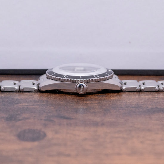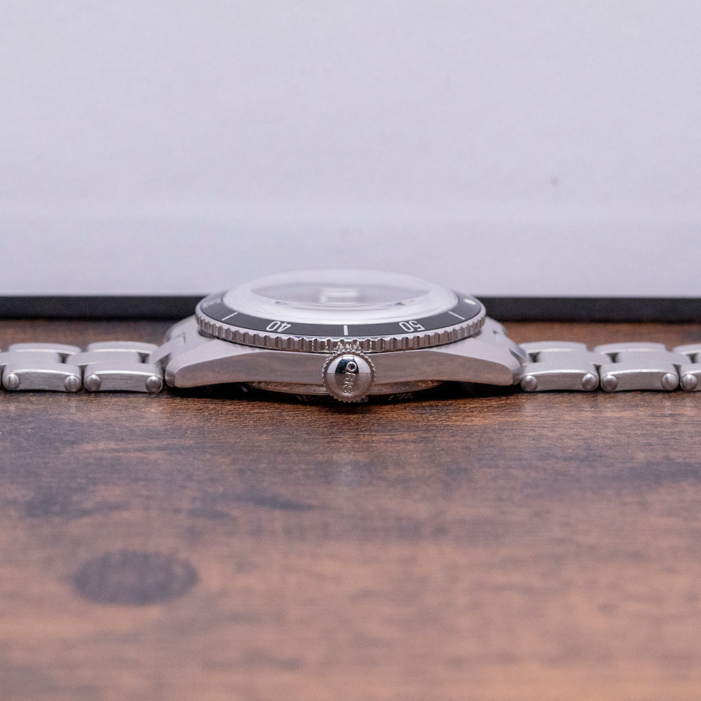 Here we have a 2021 Oris X Hodinkee Calibre 400 01 400 7774 4087 Limited Edition of 096/400 pieces; this was the second collaboration between Oris and Hodikee. The polished and brushed 38mm stainless steel case curves over your wrist with tapered lugs, and a lug-to-lug length of 45.5mm and a case thickness of 12.5mm ensure a comfortable fit. On the right side is a signed crown. For the first time, the stainless steel unidirectional smooth sliding bezel on an Oris Sixty-Five has a black aluminium 60-minute countdown dive bezel insert with white numerals and markings. A double-domed sapphire crystal sits above a forest green dial, an outer minute track surrounds the disc, and shield-shaped indexes coated in a green Super-LumiNova P-7485, inspired by the shield logo found on vintage Oris watches. Slender hands are filled with the same lume complemented by a sweeping second hand; at noon, we have the Oris motif, and at 6 o’clock, “5 days 10bar/100m” complete this distinctive sports watch. On the reverse, an exhibition case back with the details of the watch and number out of 400 engraved around its edge, inside an automatic Oris Cal. 400, 21 jewels, beating at 28,800 beats per hour, this innovative movement has a very efficient escapement, silicon escape wheel and anchor, twin mainspring barrels to give up to a 5-day power reserve. The watch comes paired with its 19mm Rivet-style 3-link brushed stainless steel bracelet with a signed push-button release folding clasp; all links are provided, and the watch comes with its Oris X Hodinkee presentation box, swing tags, leather travel pouch and paperwork.
