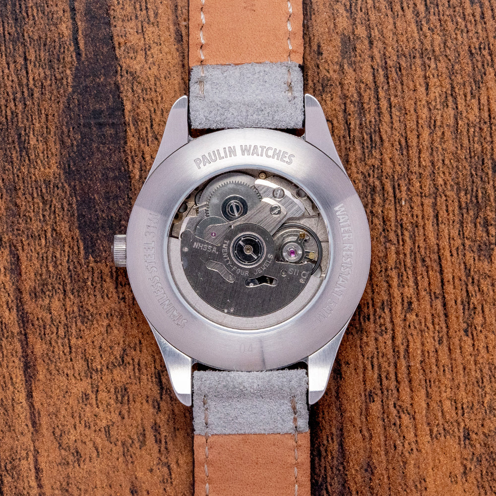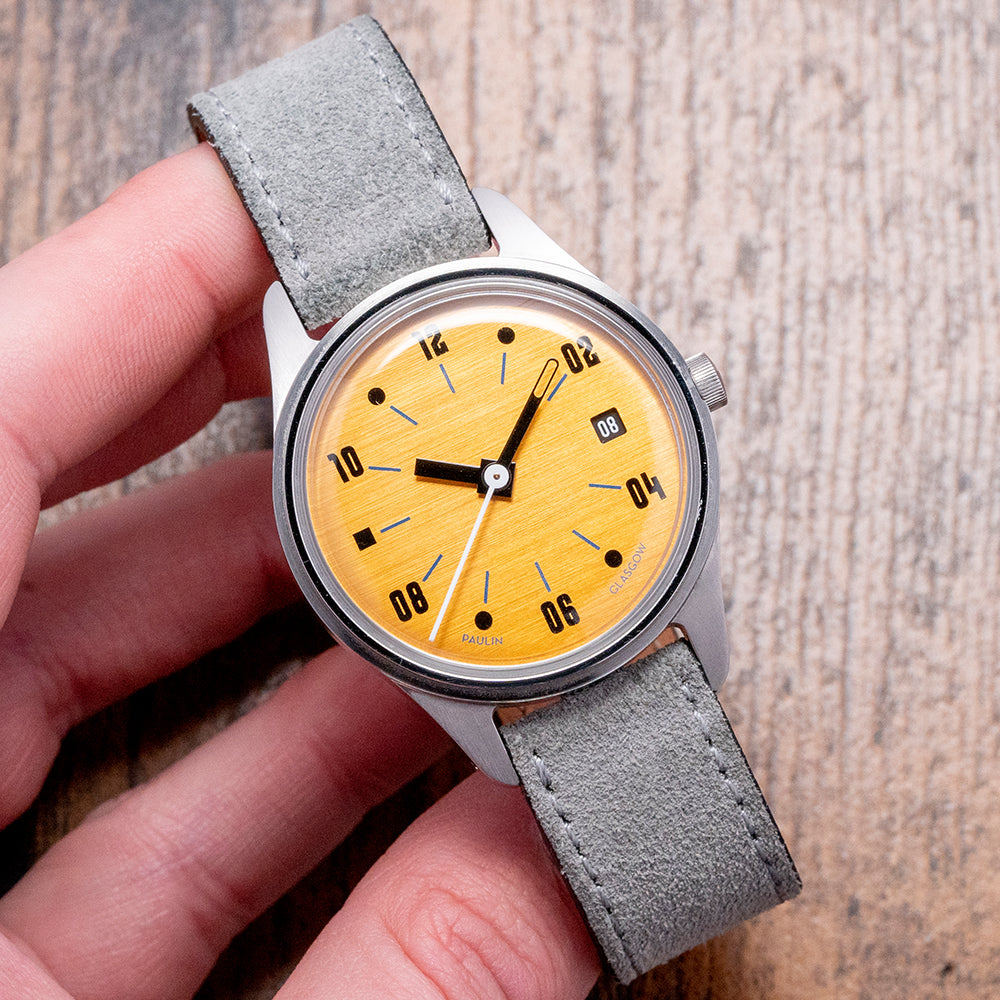 Here we have a 2021 Paulin Neo B Orange Dial with Date Automatic, the brushed 316L stainless steel case curves with tapered drilled lugs over your wrist, and a lug-to-lug length of 48mm and a case thickness of 12mm ensures a comfortable fit. On the right side is a signed crown, and the stepped smooth bezel holds a box-shaped Hesalite crystal above a striking laser-cut Anodised Aluminium grain textured dial hand-dyed vibrant orange, making each dial unique; each dial is produced by AnOrdain in the UK, which is owned by Charlotte Paulin's husband, Lewis Heath. The distinctive hand-printed numerals are a typeface called Wim, named after Wim Crouwel, a Dutch graphic artist inspired by the modernist movement, Surrounding blue batons marking the hours, at 3 o’clock a date window, the unique handset consists of a thick black hour hand, a skeletonised grey minute hand and a white second hand; along the bottom edge, we have Paulin Glasgow completing this colourful, sophisticated contemporary timepiece. On the reverse the exhibition case back with the details of the watch engraved around its edge, inside an automatic Seiko Cal. NH35A, 24 jewels, beating at 21,600 beats per hour, this workhorse movement has hand winding and hacking seconds for your convenience. The watch comes paired with its 18mm grey suede strap and stylised signed pin buckle. The watch comes with a Paulin presentation box, swing tag, and paperwork