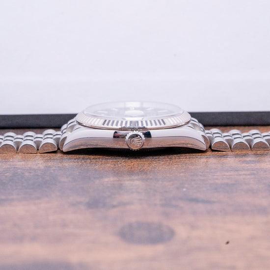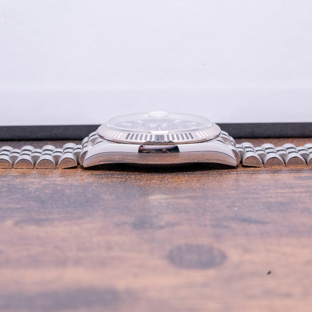 Here we have a 2021 Rolex Datejust 36mm Blue Dial Jubilee & Fluted 126234 with a polished and brushed curvaceous 36mm 904L OysterSteel case that curves over your wrist with finely tapered lugs. The use of OysterSteel, which belongs to the 904L family, makes the case more resilient to corrosion and highly durable. A lug-to-lug length of 43mm and a case thickness of 11mm give the watch an impressive and comfortable fit. On the right side is a signed screw-down Twin-lock crown, and an attractive 18ct White Gold fluted bezel holds a sapphire crystal above a stunning sunburst blue dial that catches the light as you rotate your wrist. An outer Rolex rehaut surrounds the minute track with applied 18ct White Gold baton indexes infilled with Chromalight marking the hours, and at 3 o’clock, a date window with cyclops magnification on the crystal. Slender 18ct White Gold baton hands have Chromalight infill and are complemented by a tapered sweeping second hand; at 12 o’clock, we have the applied Rolex Coronet Rolex “Oyster Perpetual DateJust” printed underneath, and at 6 o’clock, "Superlative Chronometer Officially Certified” completes this distinctive versatile timepiece. On the reverse, a coin-edged case back, inside an automatic Rolex Cal. 3235, 31 jewels, 28,800 beats per hour COSC Certified high precision movement, launched at Baselworld in 2017. The watch comes paired with its polished and brushed 20mm Rolex stainless steel Jubilee bracelet with a signed flip lock safety clasp and Easylink 5mm extension; all links are provided; the watch also comes with its Rolex presentation box, swing tags and papers