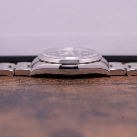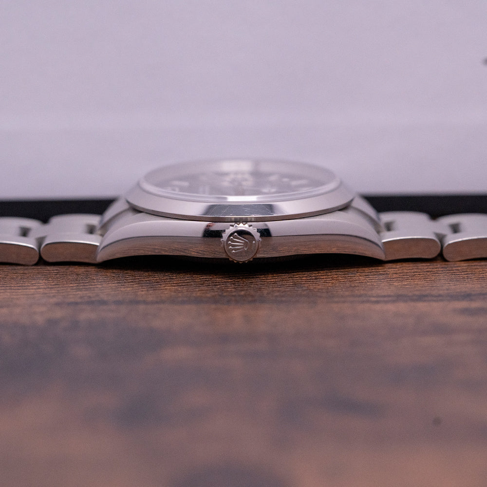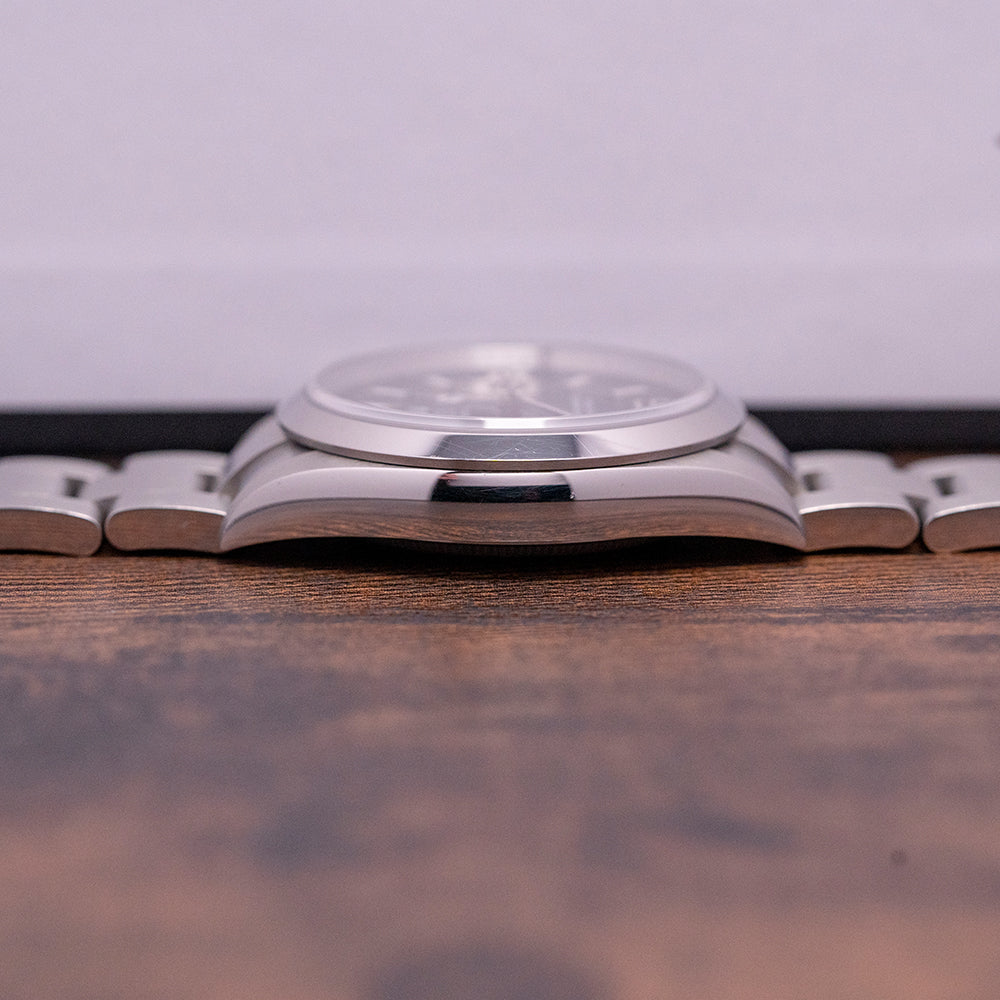 Here we have a 2021 Rolex Explorer 1 124270 that has a 36mm Oyster case made of Oystersteel, the use of Oystersteel which belongs to the 904L family makes the case more resilient to corrosion and highly durable. The Rolex Explorer came about after 20 years of development in extreme environments, starting back in the 1930s, the goal of the watch was to create the perfect mountaineer's tool, keeping the perfect time at -50°C (-58°F) with 70% less oxygen than at sea level. A lug-to-lug length of 43mm and a thickness of 11.5mm ensures a comfortable fit on your wrist, on the right side, is a Twinlock double sealing system for the screw-down crown. A smooth highly polished bezel holds a flat scratch-resistant sapphire crystal above a black dial, the applied highly legible 3, 6, and 9 have an infill of blue luminescence, and the applied baton indexes have the same infill and the text is precisely printed with the Rolex crown at 12. On the reverse, a coin-edged screw-down case back, inside we have the Rolex Cal. 3230 considered a very accurate automatic movement with Chronometer Certification of -2/+2 seconds a day, 31 jewels and beating at 28,800 BPH. The use of a Paramagnetic blue Parachrom hairspring for its speed, it’s 10 times more accurate in case of shocks, resistant to extreme temperatures and unaffected by magnetic fields and gravity. The 904L Stainless Steel Oyster bracelet has the Oysterlock safety clasp with Easylink micro-adjustments up to 5mm extension, all links provided and the watch comes with its Rolex presentation box, swing tags and papers.