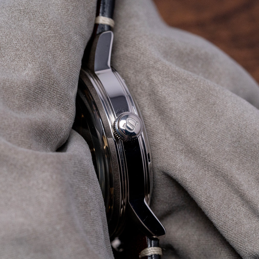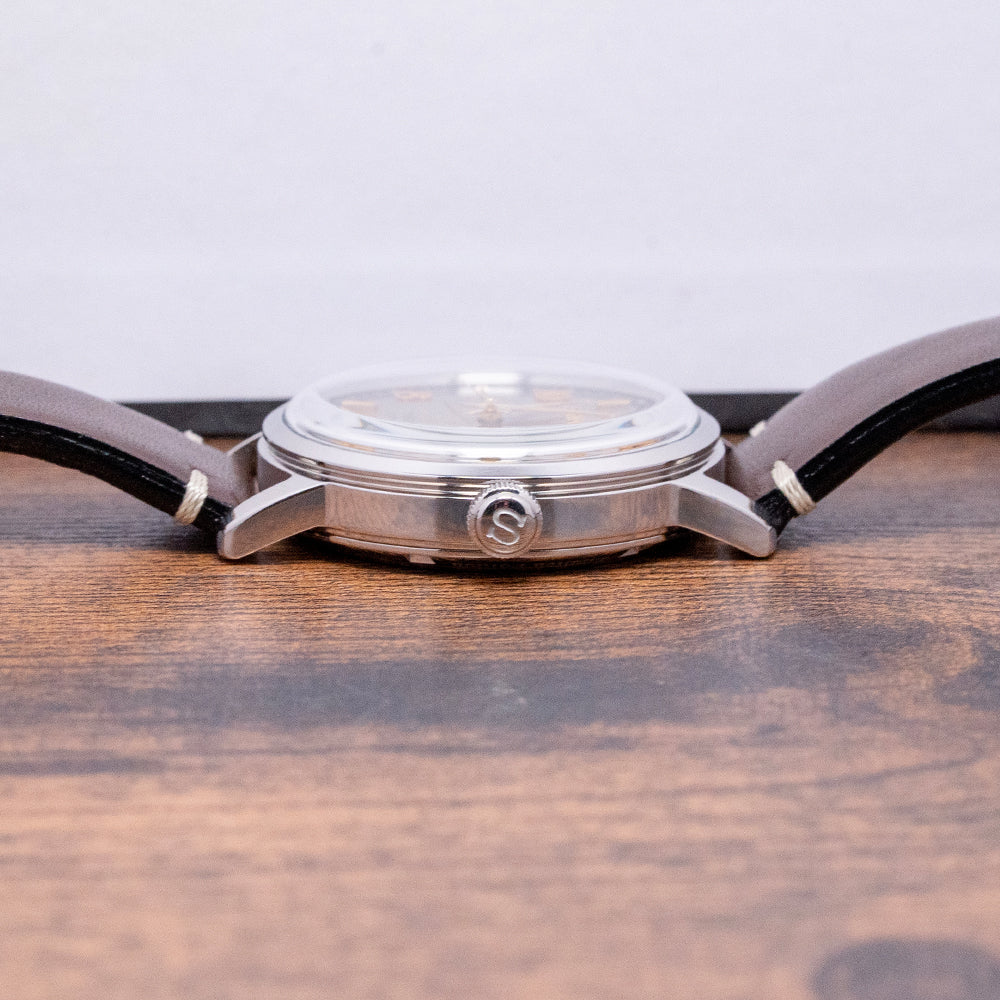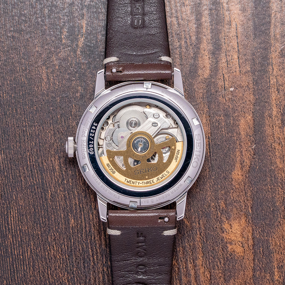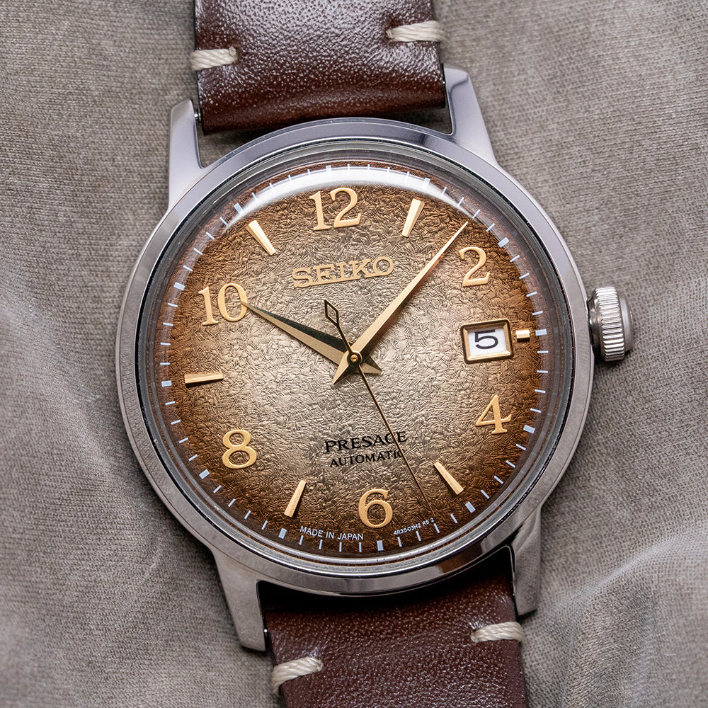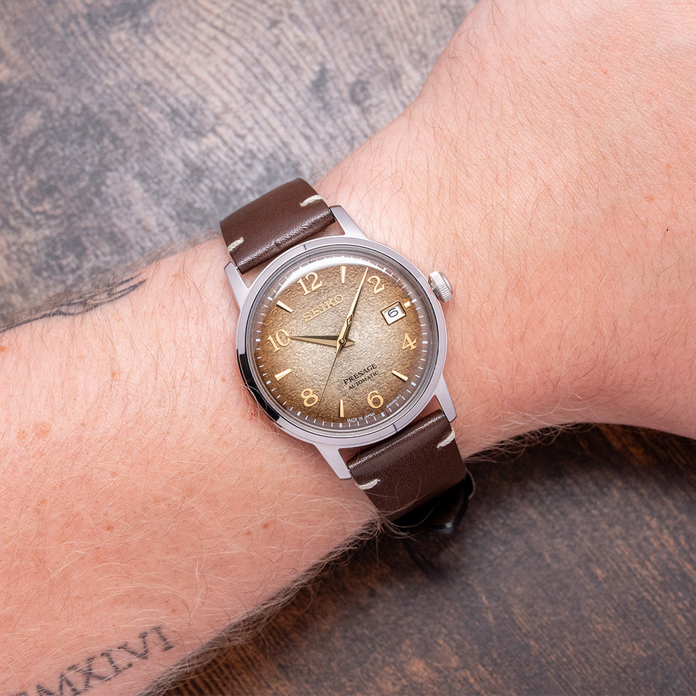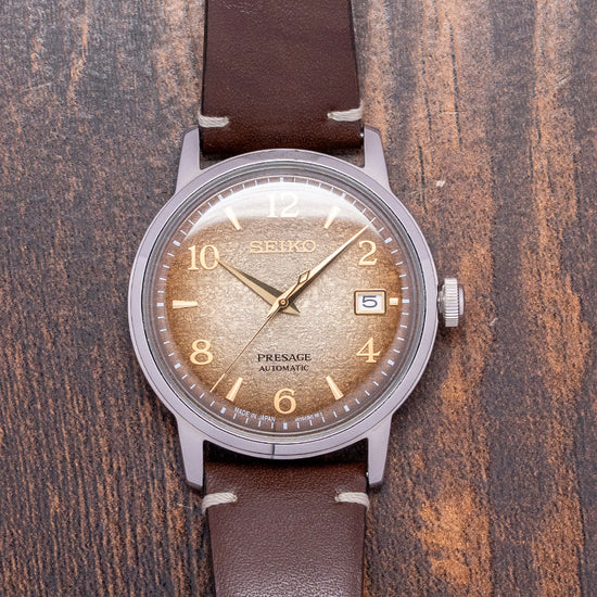 Here we have a classic 2021 Seiko Presage Cocktail Time 'Hojicha' SRPF43J1 Limited Edition of 3422/7000 pieces. Inspired by the two favourite leaf tea cocktails made by Mr. Kishi at the Kyoto Star bar. Its curvaceous 38.5mm polished stainless steel case has straight flat-ended lugs. The curved, polished flanks lead to a lug-to-lug length of 44.5mm and a case thickness of 11.5mm, ensuring a comfortable fit on your wrist. On the right side, there is a coin-edged signed crown. Its stepped polished bezel holds a domed Hardlex crystal above the stunning texture brown fumé dial, capturing the colourful light and dark brown notes of the 'Hojicha' leaf tea, an outer minute track surrounds applied golden Arabic numerals and facet edged indexes marking the hours, at 3 o’clock a framed date window, elegant golden Dauphine hands are complemented by a diamond shaped counterweighted tapered sweeping second hand, at noon we have a golden applied ‘Seiko’ and at 6 o’clock printed in black ‘Presage Automatic’ completes this cocktail infused dress watch. On the reverse, a screw-down exhibition case back etched with the details of the watch around its edge, inside an automatic Seiko Cal. 4R35, 24 jewels, 21,600 beats per hour, the movement has hand winding and hacking for your convenience. It comes paired with its 20mm Seiko vintage-style leather strap secured by a three-fold push-button released clasp. This watch is sold with its original Seiko box, swing tag and paperwork.
