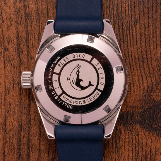 This 2021 Seiko Prospex 55th Anniversary "Glacier" SLA043J1 celebrates the 55-year Anniversary of Seikos use by the Japanese Antarctic Research Expeditions since 1966, this watch is limited to 1700 pieces and is a modern interpretation of Seiko's first "Professional" dive watches. The 40mm brushed stainless steel case is an industry first using Seiko’s “Ever-Brilliant Steel,” which is usually used in Maritime applications due to its corrosion resistance, the case shape sits on the wrist like a cushion, Seiko gets ergonomics so right. A lug-to-lug length of 48mm and a thickness of 14mm gives the watch an impressive wrist presence, on the right side at 3 o’clock a screw-down oversized signed crown. The unidirectional bezel has a black insert with a 60 minutes scale in white numerals, a box-shaped sapphire crystal sits above a sunburst “Glacier” blue dial. An outer minute chapter ring with applied oblong indexes outlined in stainless steel coated in LumiBrite marks the hours, and at 3 o’clock a framed date window. Broad baton hands expertly brushed are coated in LumiBrite complemented by a lume-tipped light blue sweeping seconds hand. Text is applied to the dial at 12 o’clock and 6 o’clock respectively. On the reverse, an etched dolphin is in the centre with the model number and number out of 1700, inside an automatic Seiko 8L35, 26 jewels, 28,800 beats per hour, the movement has hand winding and hacking functionality for your convenience, based on the Grand Seiko calibre 9S55 it is hand-assembled at the Shizuku-Ishi Watch Studio in Morioka. The watch comes fitted on a Seiko 19mm blue silicone strap with a signed buckle and the watch also comes with its Seiko presentation box, swing tags and papers.