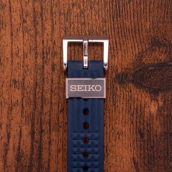 This watch is sold with its original Seiko box, swing tags and paperwork. The watch comes with a Seiko 19mm matte black silicone strap with a signed buckle, and an additional blue Seiko rubber strap which has been cut by the previous owner to be shorter. The watch is from July 2021 and is sold in worn condition, but overall very fair condition as you can see. The watch comes with our 12-Months Warranty.
