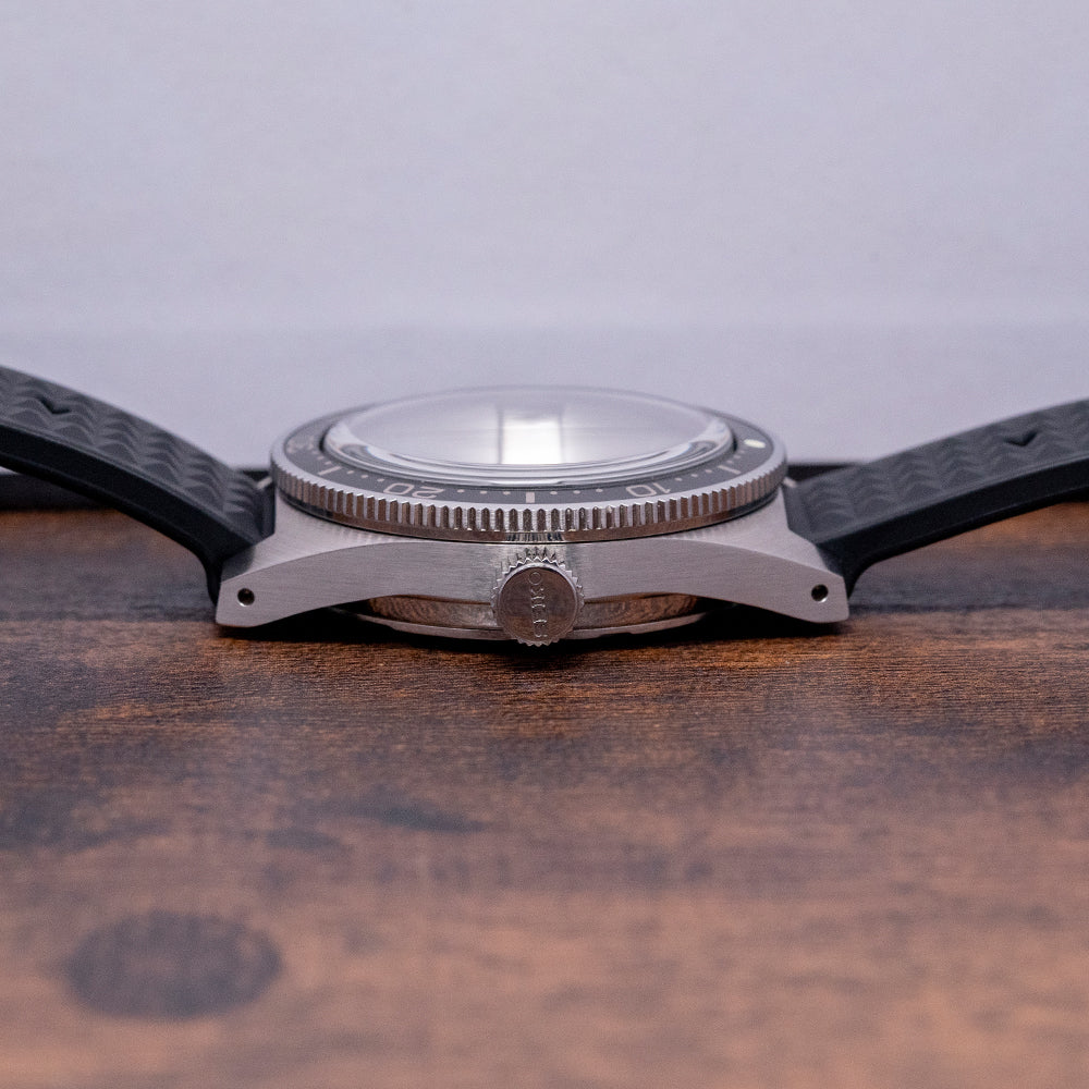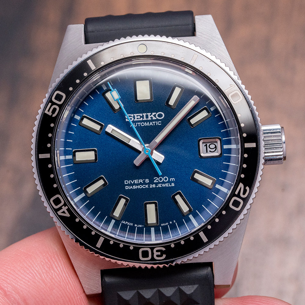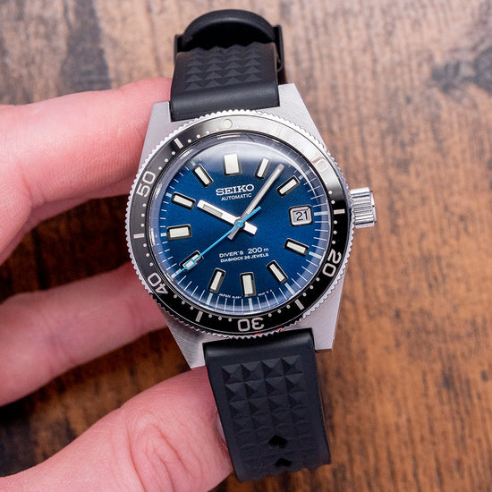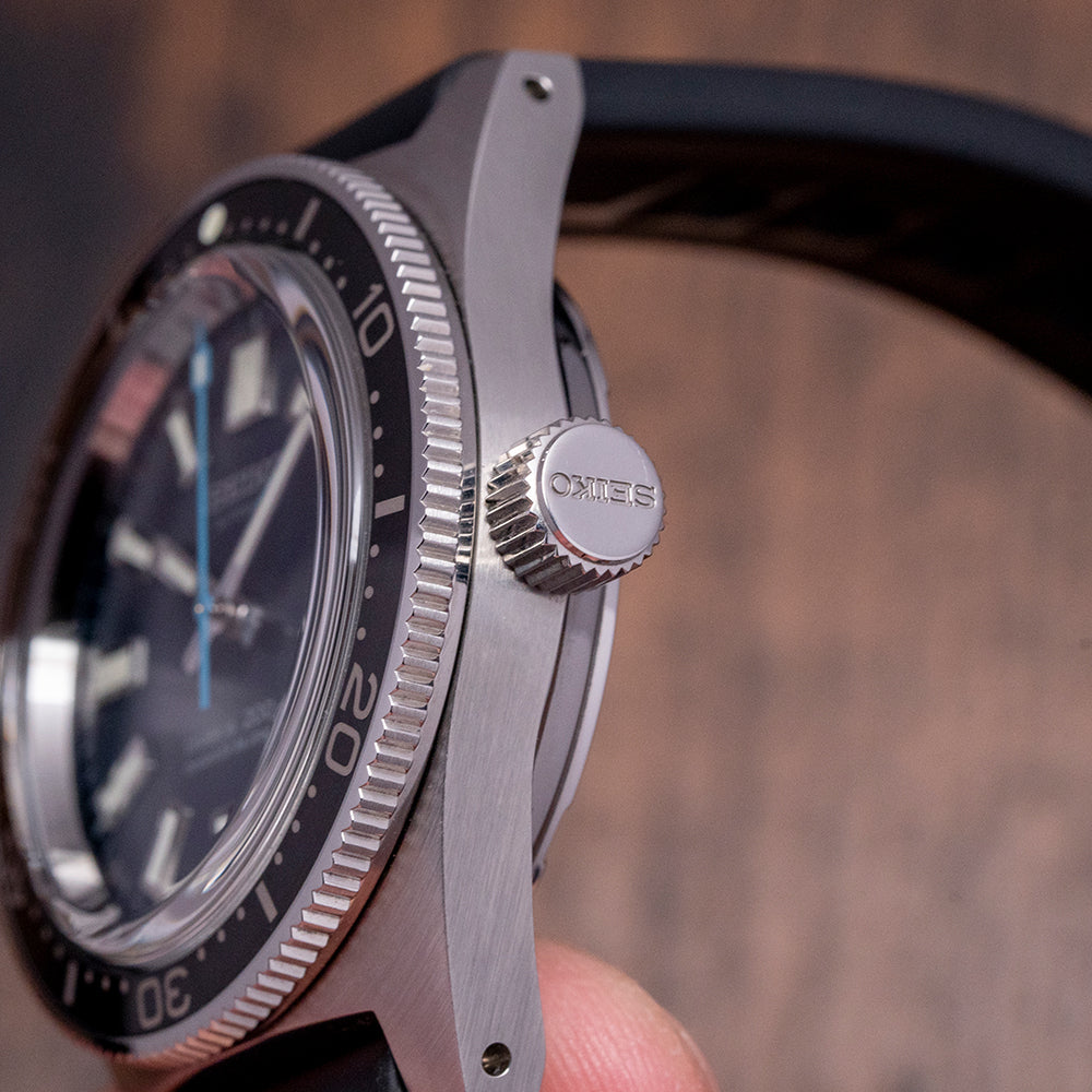 This 2021 Seiko Prospex Glacier Diver 55th Anniversary Limited Ed SLA043J celebrates the 55th Anniversary of Seikos use by the Japanese Antarctic Research Expeditions since 1966; this watch is limited to 0152/1700 pieces and is a modern interpretation of Seiko's first "Professional" dive watches. The 40mm brushed stainless steel case is an industry first using Seiko’s “Ever-Brilliant Steel,” which is usually used in Maritime applications due to its corrosion resistance; the case shape sits on the wrist like a cushion, Seiko gets ergonomics so right. A lug-to-lug length of 48mm and a thickness of 14mm gives the watch an impressive wrist presence; on the right side at 3 o’clock, there is a screw-down oversized signed crown. The unidirectional bezel has a black insert with a 60-minute scale in white numerals, and a box-shaped sapphire crystal sits above a sunburst “Glacier” blue dial. An outer minute chapter ring with applied oblong indexes outlined in stainless steel coated in LumiBrite marks the hours, and at 3 o’clock, a framed date window. Broad baton hands expertly brushed are coated in LumiBrite complemented by a lume-tipped light blue sweeping seconds hand. Text is applied to the dial at 12 o’clock and 6 o’clock, respectively. On the reverse, an etched dolphin is in the centre with the model number and number out of 1700, inside an automatic Seiko 8L35, 26 jewels, 28,800 beats per hour; the movement has hand winding and hacking functionality for your convenience, based on the Grand Seiko calibre 9S55 it is hand-assembled at the Shizuku-Ishi Watch Studio in Morioka. It comes paired with a Seiko 19mm matte black rubber strap with a signed buckle and an additional 19mm blue Seiko rubber strap. It also comes with its Seiko presentation box, swing tags, and papers.