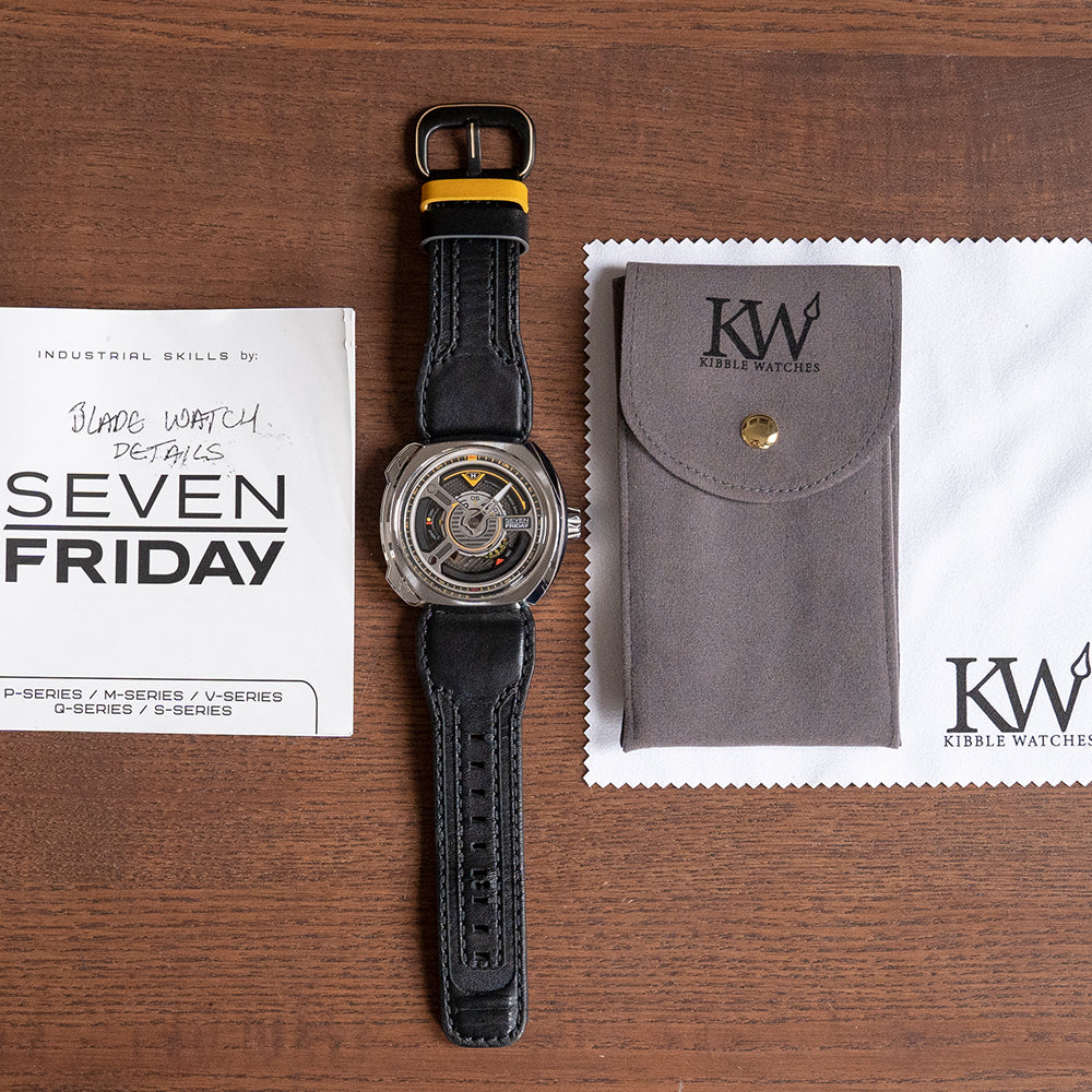 Here we have a 2021 SevenFriday W1/01 "BLADE" Automatic with a 50mm polished and brushed stainless steel square cushion style case, industrial power tools inspire its distinctive design and have two protrusions on the left side, where you will find the buttons to release the strap, a departure from their usual 60s TV-shaped cases. A lug-to-lug length of 46.5mm and a case thickness of 15mm give the watch an impressive wrist presence. On the right side is a signed crown with deep knurling for extra grip and recessed into the side of the case. A domed hardened K1 mineral glass AR coated sits above an open dial which is made up of 5 layers, 1st layer is a honeycomb textured plate, and at 7 o’clock open balance wheel, 2nd layer has the printed “Automatic” followed by its model number, small seconds red arrow, and a night/day indicator, 3rd layer has a large yellow “H” for Hour and a pointer indicating the hour disc direction, 4th layer is made up of three arms “Seven Friday” at 3 o’clock and polished screws secure the other two arms in keeping with the power tool aesthetic, in the centre we have the silver hour disc with a serrated edge, a large skeletonised steel minute hand tipped with luminance and finally the 5th layer has the yellow minute chapter ring with a red 60. Between the 4 and 5, we have the black small seconds with yellow Arabic numerals and at 9 o’clock a yellow and red disc showing day and night completes this dynamic industrial-designed timepiece. On the reverse, a screwed-down case back, specifications, SevenFriday embossed on it, and an NFC Chip used with the SevenFriday App to register your watch, inside the automatic Miyota 82S7, 21 jewels, 21,600 beats per hour. The watch comes paired with a 28mm SevenFriday black calf leather strap and the watch comes with its SevenFriday booklet.