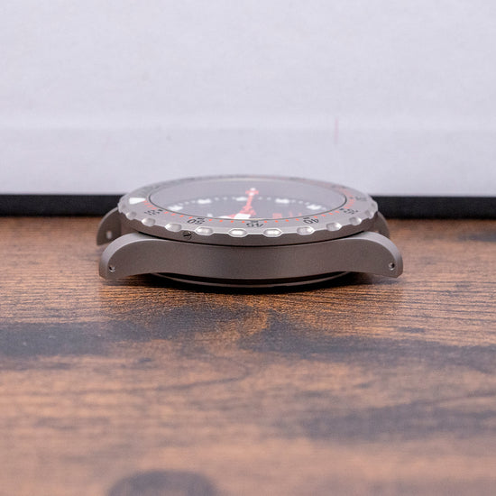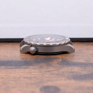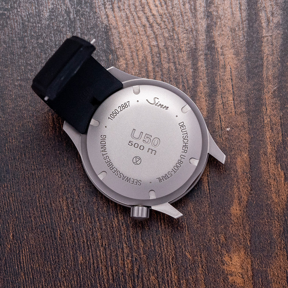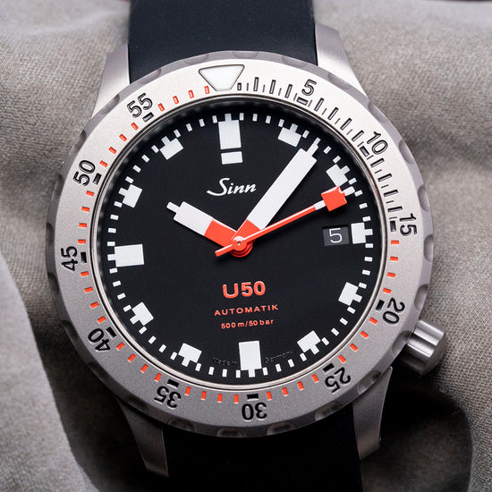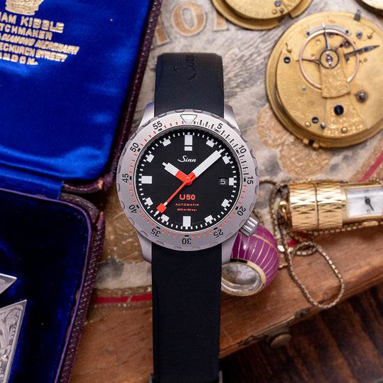 Here we have a 2021 Sinn U50 Fully Tegimented Automatic 1050.030 with a 41mm bead blasted German submarine stainless steel case treated with a hard coating to be scratch resistant and sea water resistant. TEGIMENT Technology enhances the hardness of base materials, such as stainless steel, offering excellent protection against scratches. This innovative process hardens the material's surface, creating a durable protective layer called “tegimentum,” derived from Latin. The thick curved, drilled lugs have a lug-to-lug length of 47mm and a thickness of 11mm, giving the watch an impressive wrist presence. On the right side at 4 o’clock, a TEGIMENT Technology-treated signed screw-down crown. The unidirectional bezel has deep scalloped knurling for extra grip. A 60-minute scale highlighted in red from 15-60 with an inverted triangle at 12 o’clock. The flat sapphire crystal AR coated on both sides sits above a black dial. An outer minute track has blocks of SuperLuminova marking the hours. At 3 o’clock, a colour-matched date window. The flat red baton hands have lume tips complemented by a red centre second hand with a lume tip and a red counterweight. The text is minimalist, with “Sinn” at 12 o’clock and “U50 Automatik” and “500M 50 BAR” in red print. The dial's simplicity makes for a very legible dive watch. On the reverse, a screw-down case back. Inside an Automatic Sellita Cal. SW300-1, 25 jewels, beating at 28,800 beats per hour, it has hacking seconds for your convenience. It comes paired with its original Sinn 20mm fitted and cut rubber strap with a signed folding clasp, TEGIMENT Technology treated, it will fit up to a 6.75-inch wrist, and new straps can be had from Sinn. This watch is sold with its original Sinn presentation box, spring bar removal tool and Sinn paperwork.