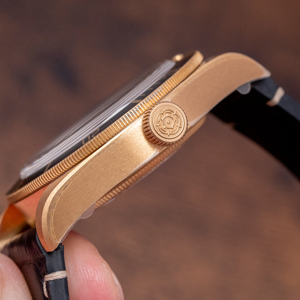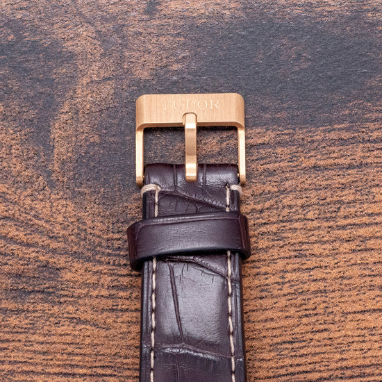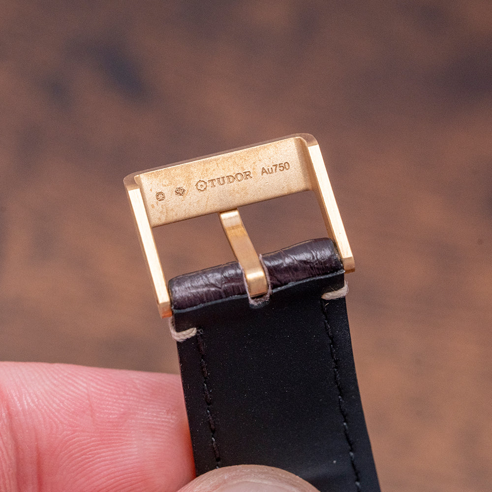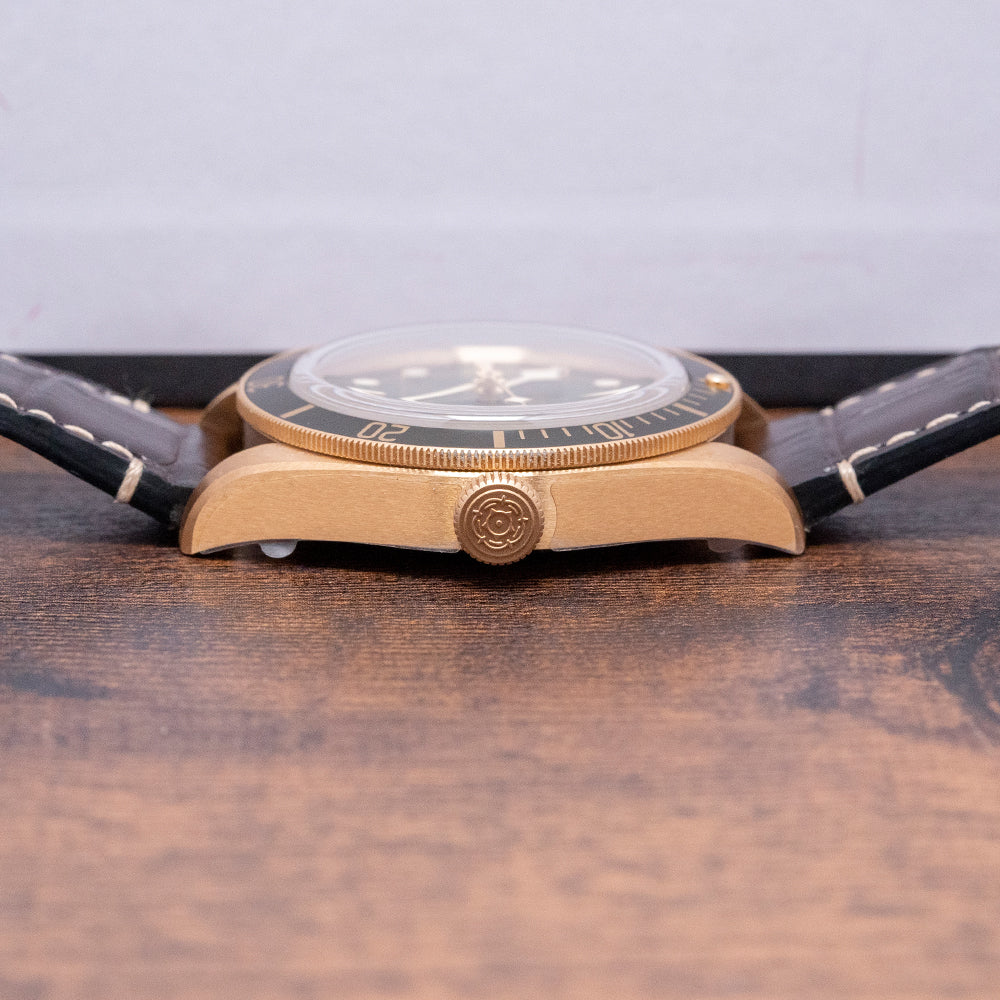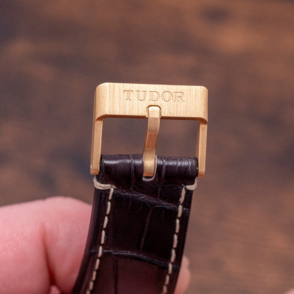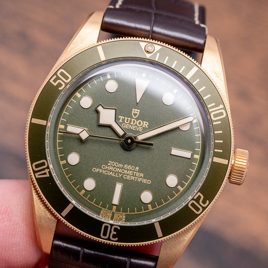 Here we have a 2021 Stickered Tudor Black Bay 58 18ct Gold Green Dial 79018V with a curvaceous satin-finished 39mm 18ct yellow gold case. The case curves over your wrist with a lug-to-lug length of 47.5mm and a case thickness of 11.5mm, giving the watch an impressive wrist presence. On the right side is a screw-down crown, with an 18ct yellow gold winding crown tube and Tudor Rose in relief. The 18ct yellow gold unidirectional bezel has a matte green anodised aluminium insert with a gilded 60-minute dive scale. The domed sapphire crystal sits above a matte green coloured dial. An outer gilded minute track surrounds the applied disc, and baton indexes are filled with SuperLumiNova, marking the hours. The characteristic Snowflake hands are filled with SuperLumiNova complemented by a counterweighted taped sweeping second hand. Text is in gilded gold at 12 o’clock and 6 o’clock, respectively, completing this striking dive watch. On the reverse, a screw-down exhibition case back with the gold hallmarks and details of the watch engraved, inside an automatic Tudor Cal. MT5400, 27 jewels, 28,800 beats per hour. This in-house movement is COSC-certified and has a skeletonised bi-directional rotor and silicon balance spring, and the movement is finished in a combination of sandblasting, satin brushing, and polishing. It comes paired with its 20mm Tudor brown alligator strap with a signed buckle in 18ct yellow gold, and the watch also comes with its Tudor presentation box and papers.