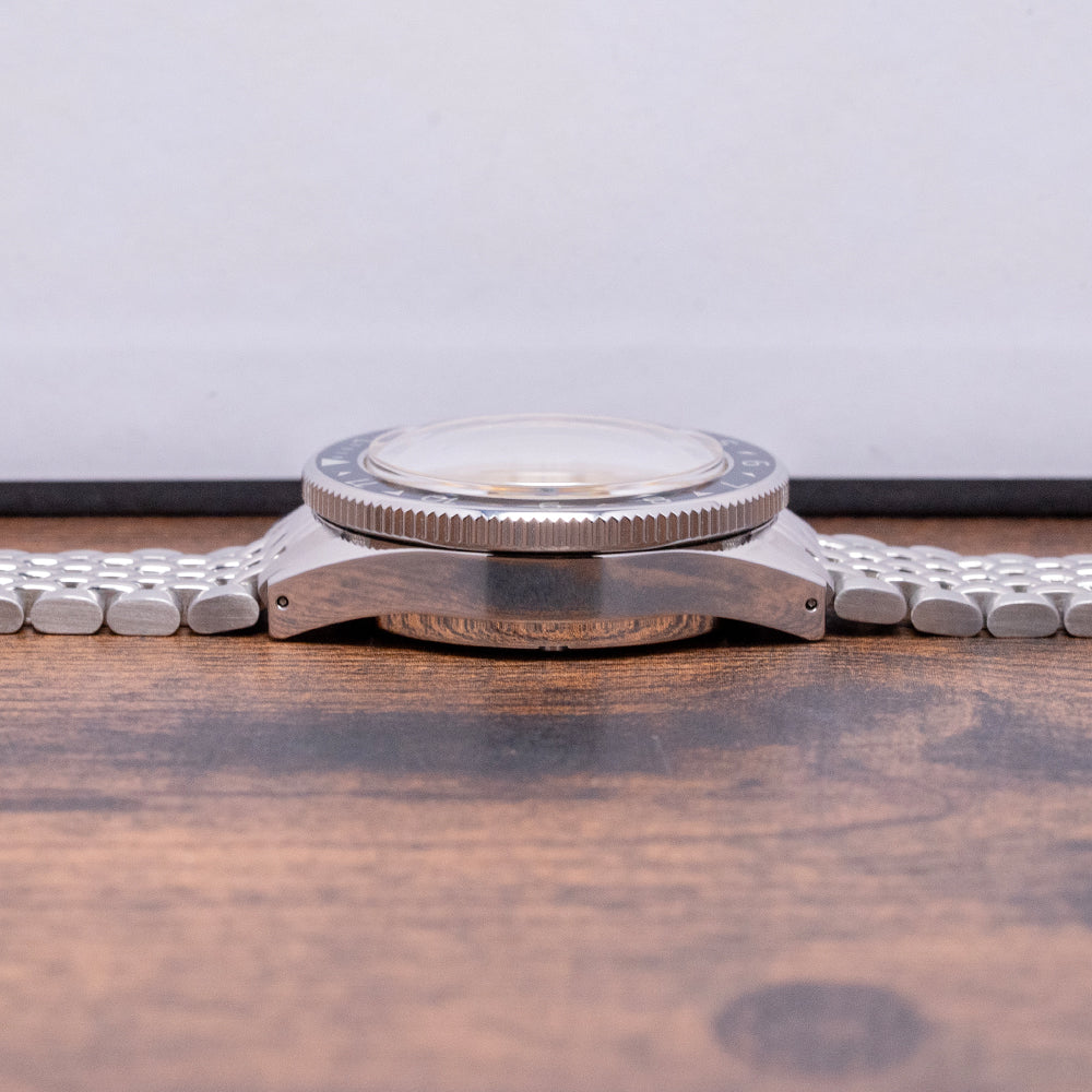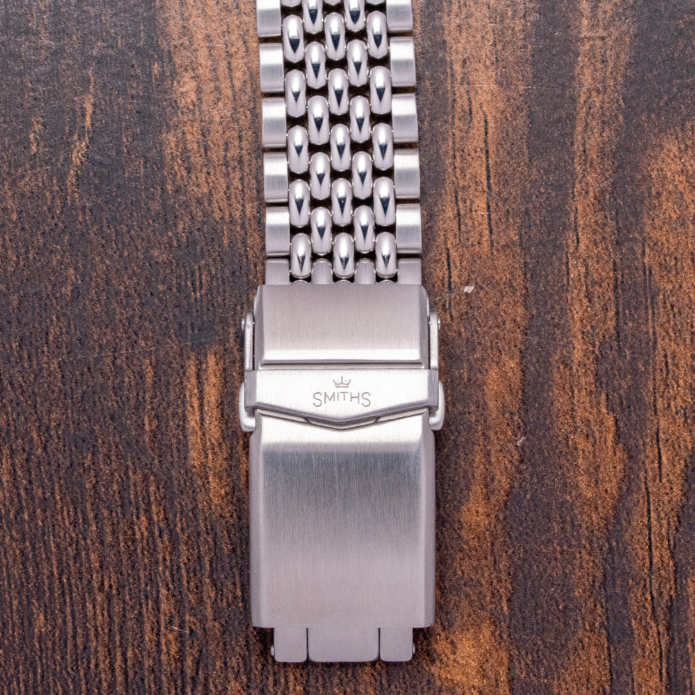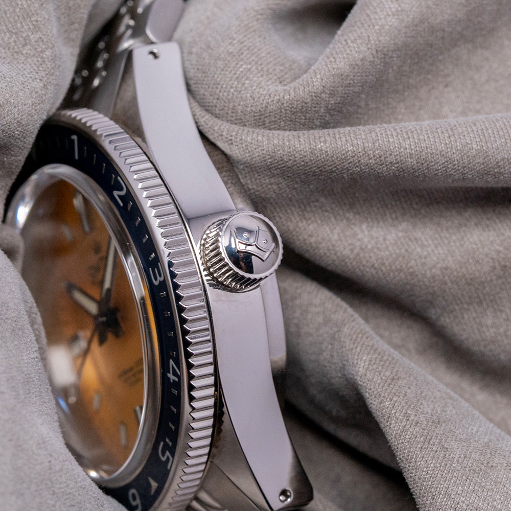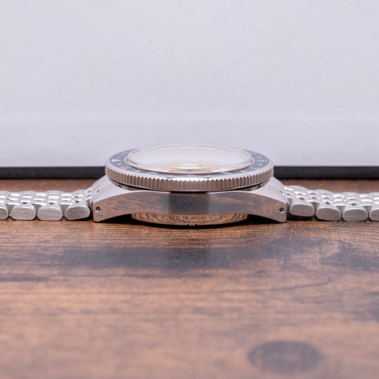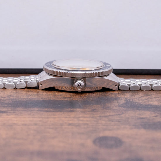 Here we have a 2021 Timefactors Smiths Caribbean 1000 YB Yellow, this is the first dive watch tested to 1000 metres/3300 feet to be launched by Time Factors. Caribbean watches gained immense popularity in the 1960s, standing out for their stylish designs and impressive water resistance. The name was introduced by Jenny Watches, founded in 1963, a Swiss brand known for its professional dive watches. They were particularly recognised for their MONOBLOC Triple-Safe case design and were a pioneer in producing a 1,000-meter water-resistant dive watch, the Caribbean 1000. Several other brands also produced watches under the Caribbean name, including Ollech & Wajs and Jacquet Droz. The 40mm polished stainless steel case curves over your wrist with tapered flat-ended drilled lugs. Its curved flanks have crisp edges leading to a lug-to-lug length of 44.5mm and a case thickness of 14.5mm, ensuring a comfortable fit. On the right side, a screw-down coin-edged domed crown. A coin-edged steel bezel has a blue enamelled 12-hour scale with polished 3D pyramid indices holding a domed sapphire crystal AR-coated on the inside above a vibrant yellow dial. An outer minute track surrounds applied steel double baton indexes filled with lume at the cardinal points and lume-coated batons marking the hours. At 3 o’clock, a framed date window, featuring thick black hands filled with lume, is complemented by an arrow-pointed sweeping second hand. At noon, we have the Smiths motif, and at 6 o’clock, ‘Caribbean 1000 Meters 3300 Ft’ completes this vintage-infused dive monster. On the reverse, a screw-down solid case back engraved with the details of the watch and ‘Smiths’ motif in the centre, inside automatic Miyota 9015, 24 jewels, beating at 28,800 beats per hour, this quality workhorse movement has hand winding, hacking seconds and quick-set date. It comes paired with its 20mm Beads of Rice brushed and polished stainless steel bracelet secured by a signed folding clasp. This watch is sold with its original Timefactors Smiths box and paperwork.