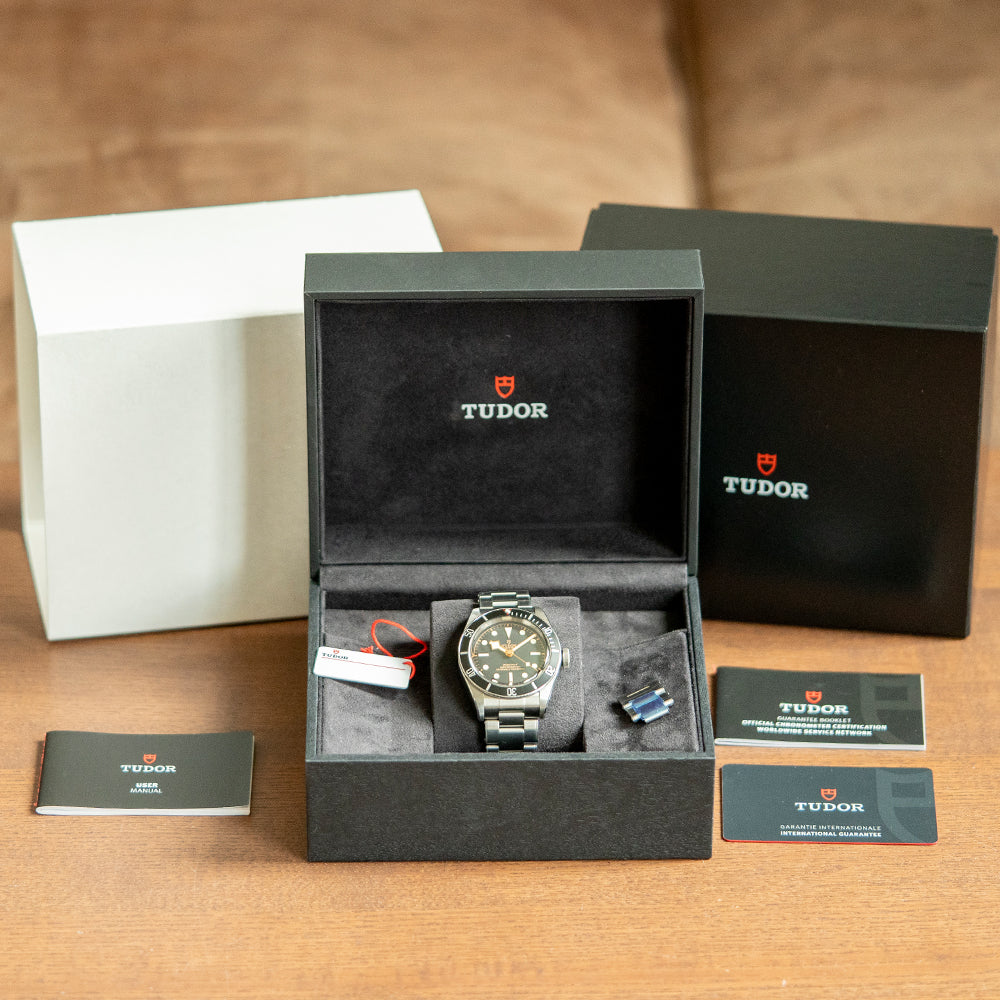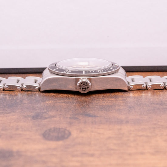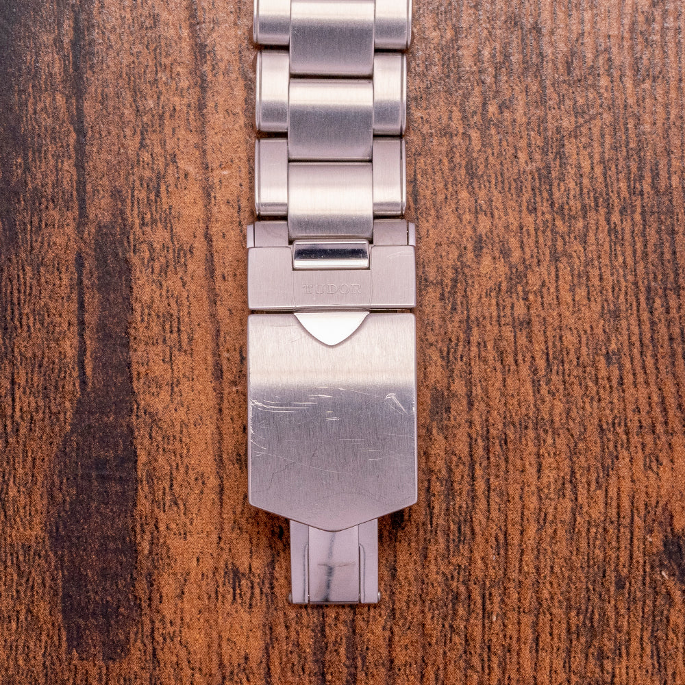 This watch is sold with its original Tudor presentation box, swing tag and paperwork. The watch comes paired with its Tudor "faux Rivet plated" bracelet for a vintage aesthetic, instead secured by screws for easy sizing, 22mm stainless steel Oyster-style with a signed folding clasp and safety fliplock, all links are included. The watch is from May 2021 and is sold in worn condition, as you can see, a full case and bracelet refurb can be provided at an additional cost. The watch comes with our 12-Months Warranty.