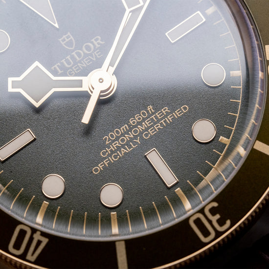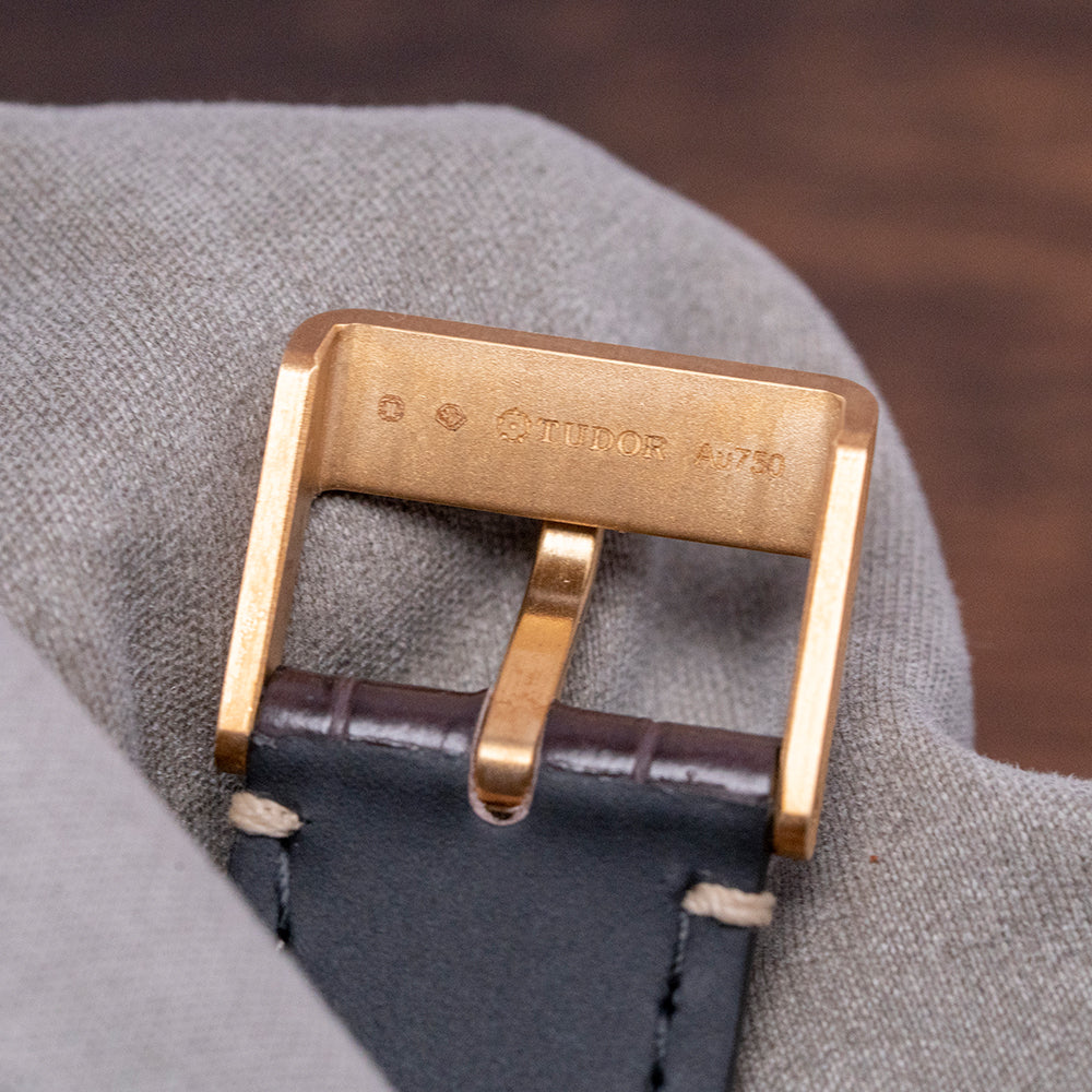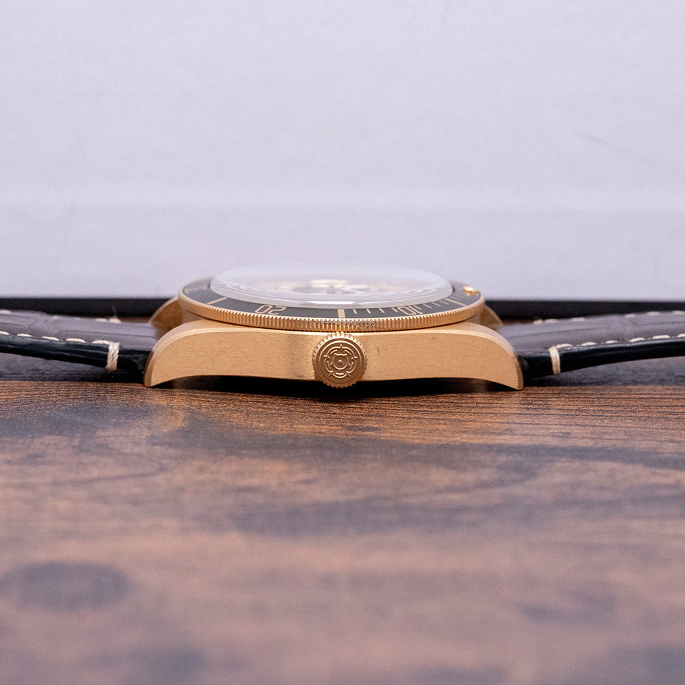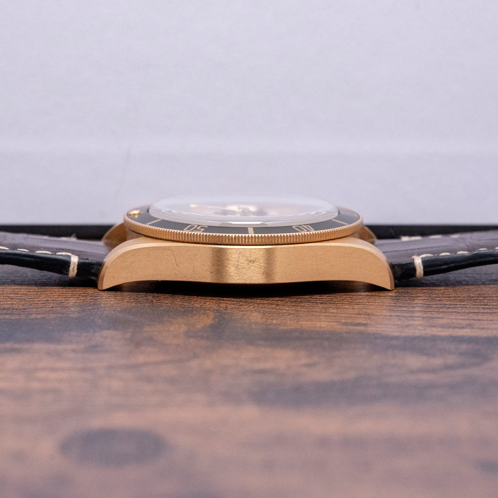 Here we have a 2021 Tudor Black Bay 58 18ct Gold Green Dial 79018V with a curvaceous satin-finished 39mm 18ct yellow gold case. The case curves over your wrist with a lug-to-lug length of 47.5mm and a case thickness of 11.5mm, giving the watch an impressive wrist presence. On the right side is a screw-down crown, with an 18ct yellow gold winding crown tube and Tudor Rose in relief. The 18ct yellow gold unidirectional bezel has a matte green anodised aluminium insert with a gilded 60-minute dive scale. The domed sapphire crystal sits above a matte, green-coloured dial. An outer gilded minute track surrounds the applied disc, and baton indexes are filled with SuperLumiNova, marking the hours. The characteristic Snowflake hands are filled with SuperLumiNova, complemented by a counterweighted, tapered, sweeping second hand. Text is in gilded gold at 12 o’clock and 6 o’clock, respectively, completing this striking dive watch. On the reverse, a screw-down exhibition case back with the gold hallmarks and details of the watch engraved, inside an automatic Tudor Cal. MT5400, 27 jewels, 28,800 beats per hour. This in-house movement is COSC-certified and has a skeletonised bi-directional rotor and silicon balance spring, and the movement is finished in a combination of sandblasting, satin brushing, and polishing. It comes paired with its 20mm Tudor brown alligator strap with a signed buckle in 18ct yellow gold, and the watch also comes with its Tudor presentation box and papers.