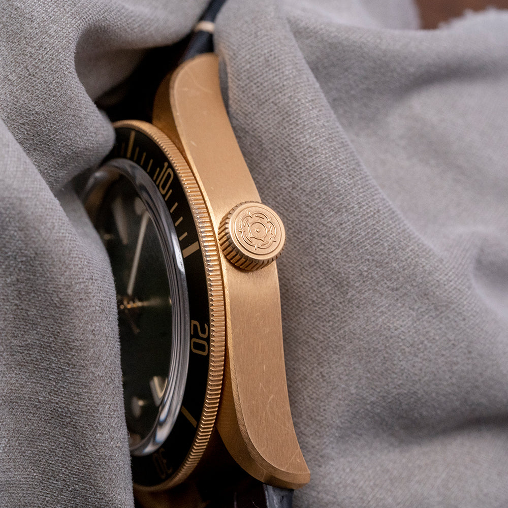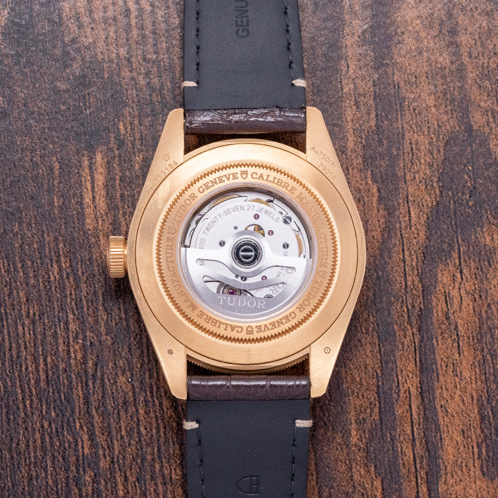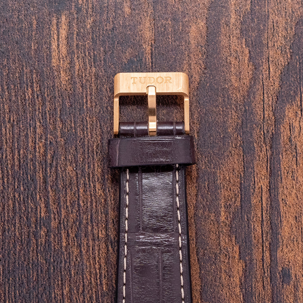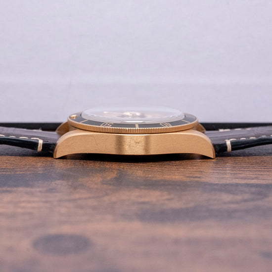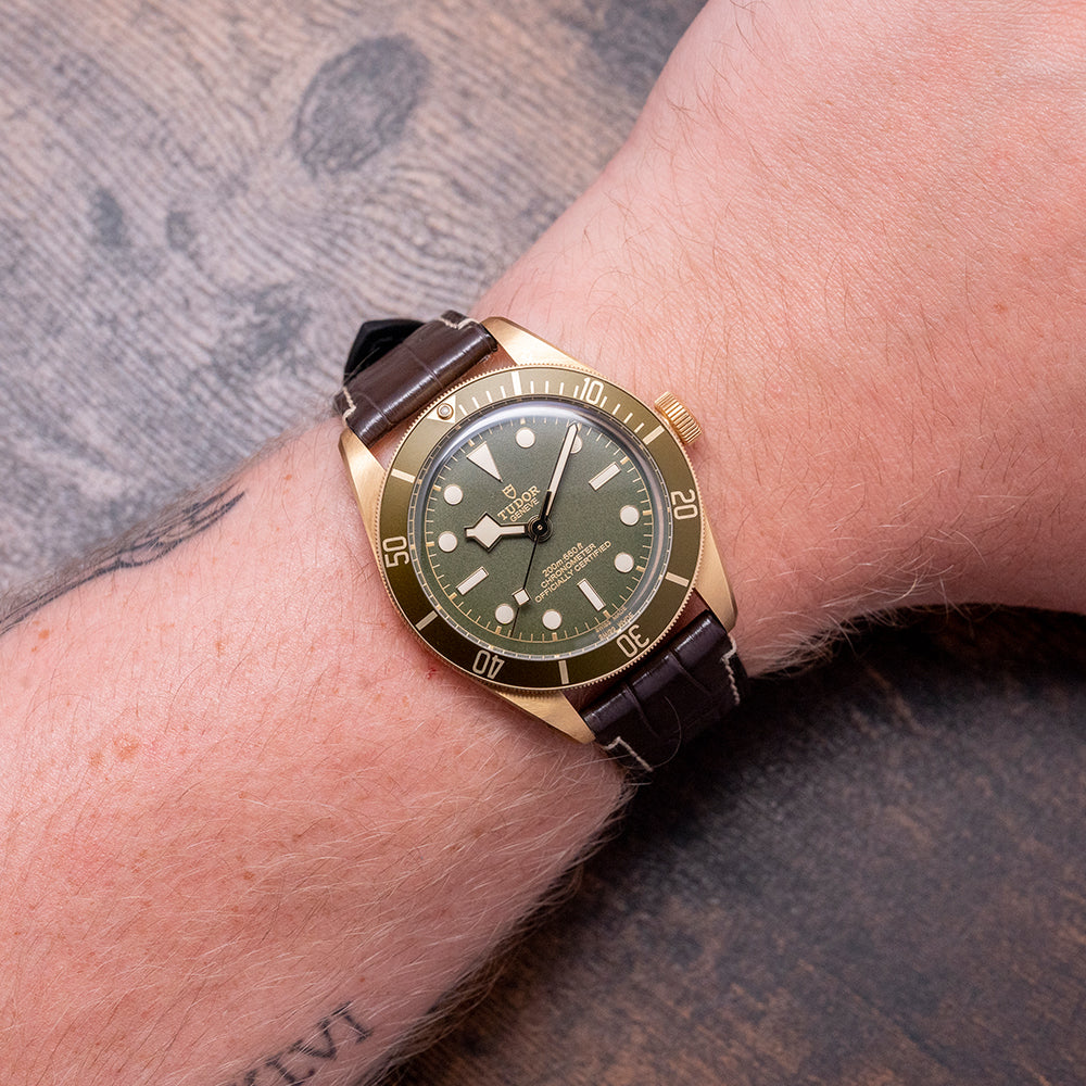 Here we have a 2021 Tudor Black Bay 58 18ct Gold Green Dial 79018V with a curvaceous satin-finished 39mm 18ct yellow gold case. The case curves over your wrist with a lug-to-lug length of 47.5mm and a case thickness of 11.5mm, giving the watch an impressive wrist presence. On the right side is a screw-down crown, with an 18ct yellow gold winding crown tube and Tudor Rose in relief. The 18ct yellow gold unidirectional bezel has a matte green anodised aluminium insert with a gilded 60-minute dive scale. The domed sapphire crystal sits above a matte, green-coloured dial. An outer gilded minute track surrounds the applied disc, and baton indexes are filled with SuperLumiNova, marking the hours. The characteristic Snowflake hands are filled with SuperLumiNova, complemented by a counterweighted, tapered, sweeping second hand. Text is in gilded gold at 12 o’clock and 6 o’clock, respectively, completing this striking dive watch. On the reverse, a screw-down exhibition case back with the gold hallmarks and details of the watch engraved, inside an automatic Tudor Cal. MT5400, 27 jewels, 28,800 beats per hour. This in-house movement is COSC-certified and has a skeletonised bi-directional rotor and silicon balance spring, and the movement is finished in a combination of sandblasting, satin brushing, and polishing. It comes paired with its 20mm Tudor brown alligator strap with a signed buckle in 18ct yellow gold, and the watch also comes with its Tudor presentation box and papers.