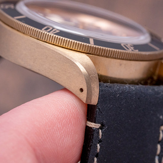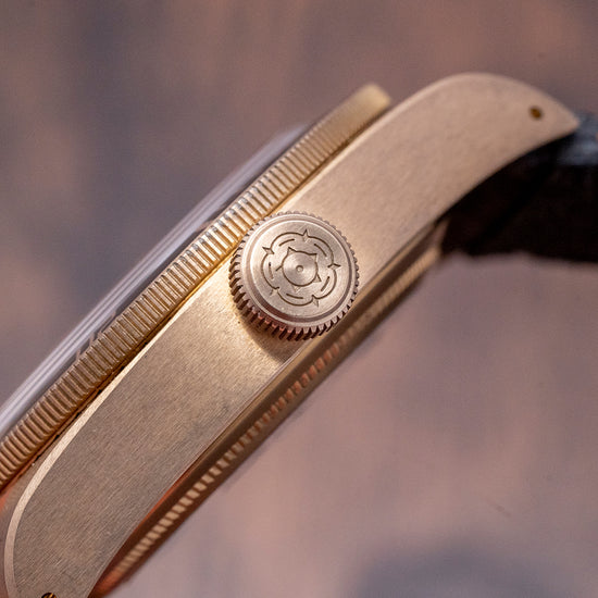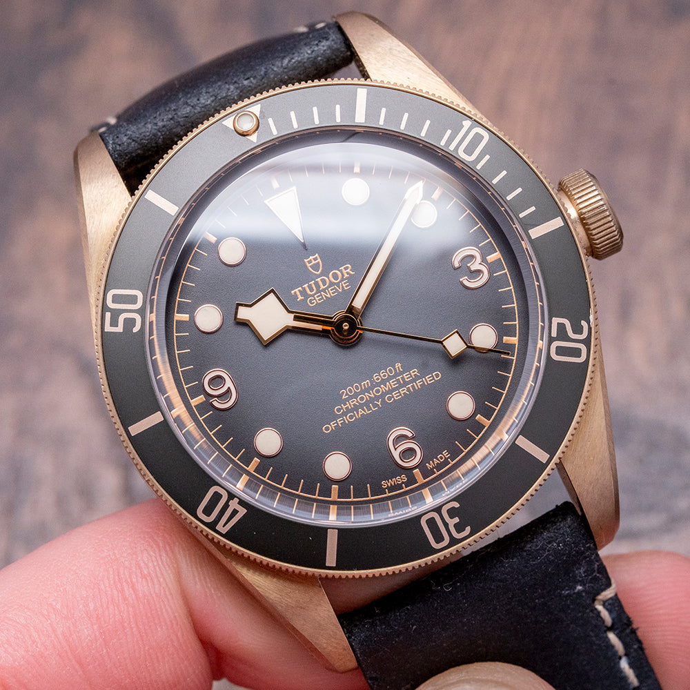 Here we have a classic 2021 Tudor Black Bay Bronze Slate Grey 79250BA with a 43mm brushed bronze case that curves over your wrist for a comfortable fit. The case has a lug-to-lug length of 52.5mm and a thickness of 14mm, giving the watch an impressive wrist presence. Brushed surfaces and polished edges are expertly executed around the case. On the right side is a signed screw-down crown. A bronze unidirectional bezel has a distinctive slate grey 60-minute dive scale anodised aluminium insert. The domed vintage-style boxed sapphire crystal sits above a slate grey dial. An outer minute track has bronze-edged discs and numerals at 3, 6, and 9. The characteristic snowflake hands are bronze-edged and coated in luminance, complemented by a sweeping second hand. The bronze accents really work with the slate grey dial. Text is precisely applied to the dial at 12 o’clock; we have the Tudor motif, and at 6 o’clock, “200m-660ft Chronometer Officially Certified”. On the reverse, a coin-edged screw-down case back. Inside the in-house automatic Tudor Cal. MT5601, 25 jewels, 28,800 beats per hour. COSC certified. The MT stands for "Manufacture Tudor". It comes paired with its original 23mm Tudor leather strap with a bronze buckle, inside the box, we have an aftermarket NATO strap. This watch is sold with its Tudor box, swing tag and Tudor paperwork.