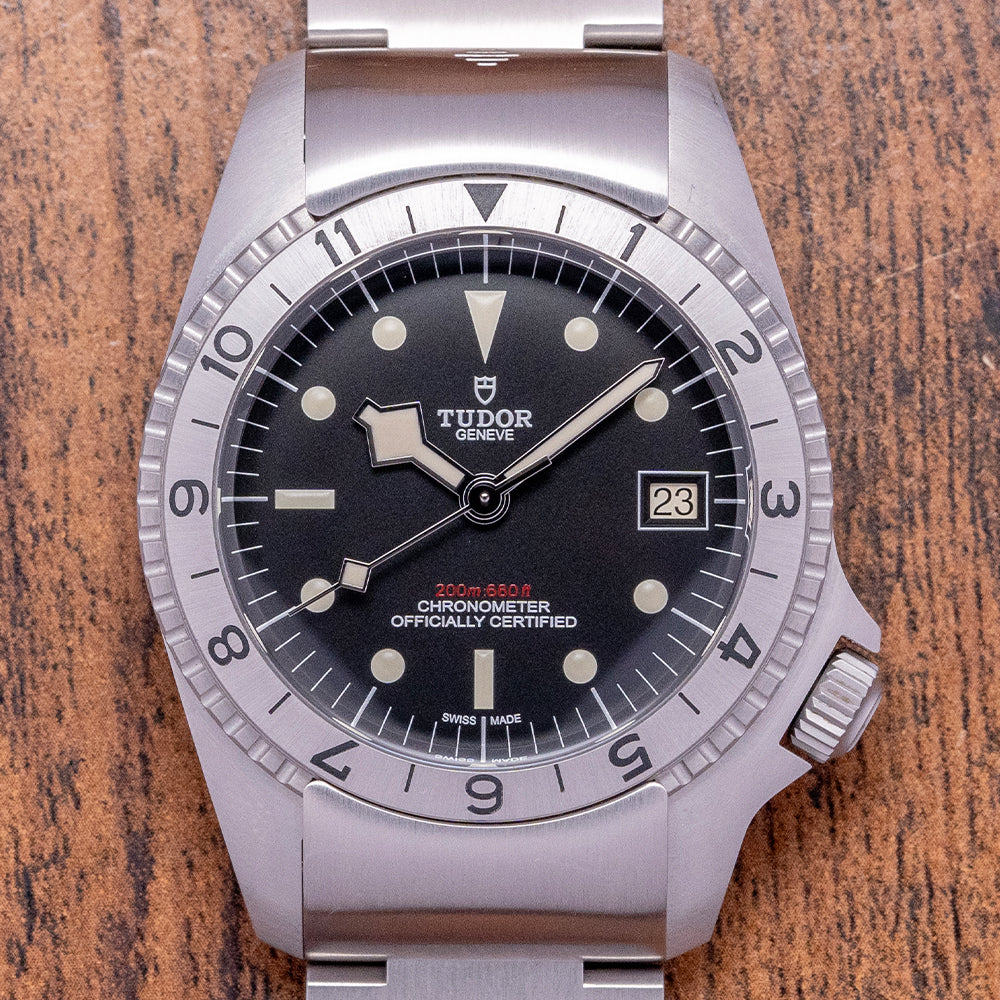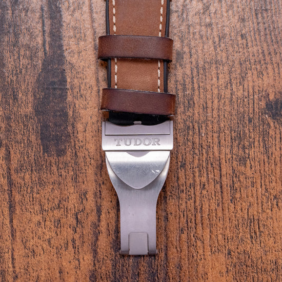 Here, we have a 2021 Tudor Black Bay P01 Automatic 70150 launched at Baselworld in 2019 with its distinctive 42mm satin-finished stainless steel asymmetric case. This watch is based on an imaginative prototype developed in the late 1960s as part of their “Commando” development program. It was submitted to the US Navy but was never adopted, and Tudor patented its hinged-end link system for locking and dismantling (in case of repair) in 1968. The watch's tapered profile sits comfortably on your wrist with thick, drilled, flat-ended hinged lugs, and a lug-to-lug length of 55mm and a case thickness of 14mm give the watch an impressive wrist presence. The clever bezel-stopping system operates by raising the end link at 12 o’clock so you can rotate the bidirectional 60-notched 12-hour stepped bezel and then press it down to lock it in place at the desired hour. At 4 o’clock we have a screw-down signed crown protected by crown guards that are part of the case for added strength. A domed sapphire crystal sits above a domed matte black dial. An outer minute track surrounds disc and baton indexes coated in Super-LumiNova, marking the hours; at 3 o’clock, a framed date window, the characteristic Snowflake hands are filled with the same lume and complemented by a Snowflake counterweighted sweeping second hand. At noon, we have the Tudor motif, and at 6 o’clock, in red, “200m 660ft.” In white, “Chronometer Officially Certified” completes this faithful recreation of a unique Prototype. On the reverse a screw-down coin-edged case back, inside an automatic Tudor Cal. MT5612, 26 jewels, 28,800 beats per hour, introduced in 2015, this in-house COSC Certified movement has a bi-directional rotor, hand winding and hacking seconds functionality for your convenience. The watch comes paired with its thick Tudor 20mm fitted strap in brown leather and rubber secured by a signed folding buckle and comes with its Tudor presentation box and paperwork.