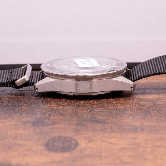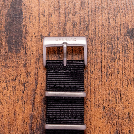 Here we have a collaboration between UNIMATIC and Hodinkee producing a Limited Edition of 071/500 pieces. Designed and envisioned by Hodinkee in appreciation of the unique Unimatic styling. The 41mm brushed stainless steel case curves in all the right places, and a lug-to-lug length of 49mm and a thickness of 13mm ensures a comfortable fit on your wrist. On the right side, is a signed screw-down crown protected by crown guards. Its 120-click uni-directional 60-minute dive bezel has a lume pip at 12. A sapphire crystal AR coated sits above a Hodinkee grey dial, an outer minute track, large disc, and baton indexes lume filled with Super-LumiNova C1 White mark the hours. Broad phantom ladder hands filled with the same Super-LumiNova C1 White lume and a grey reverse lollipop second-hand with a black tip. On the reverse, a screw-down case back with deep engraving celebrates the collaboration and its number out of 500, inside an automatic Sellita SW200-1, 26 jewels, 28,800 beats per hour. The watch comes with a black two-piece TPU 22mm strap and a two-piece nylon 22mm strap both with a signed buckle and also comes with its UNIMATIC tough case and papers.