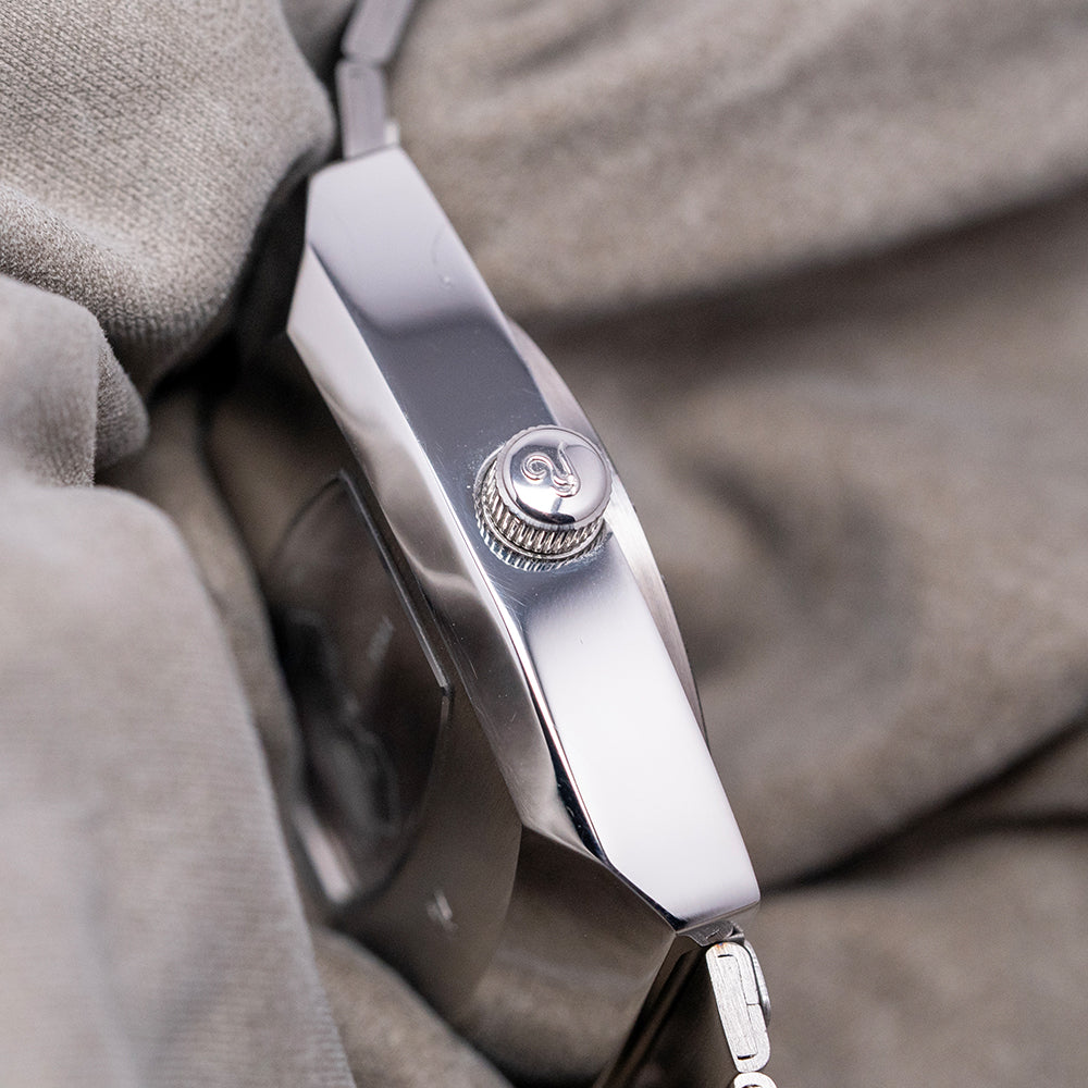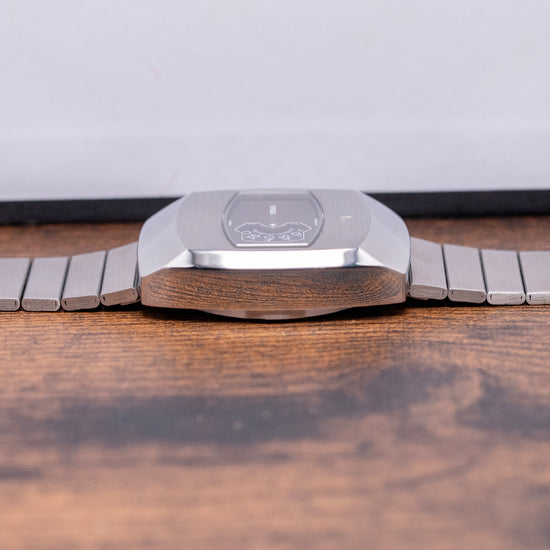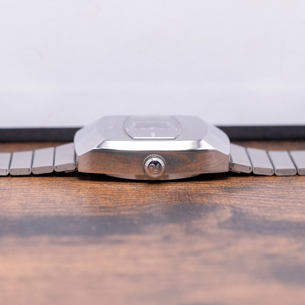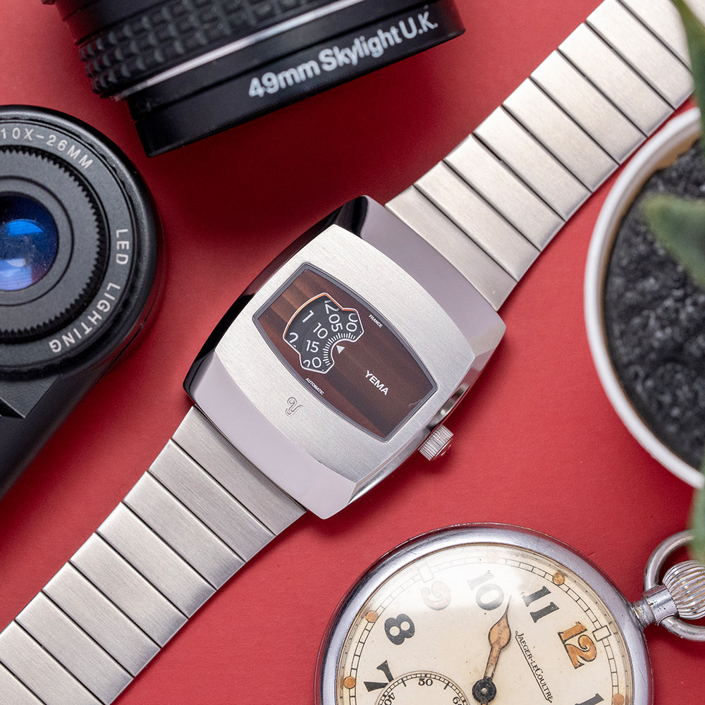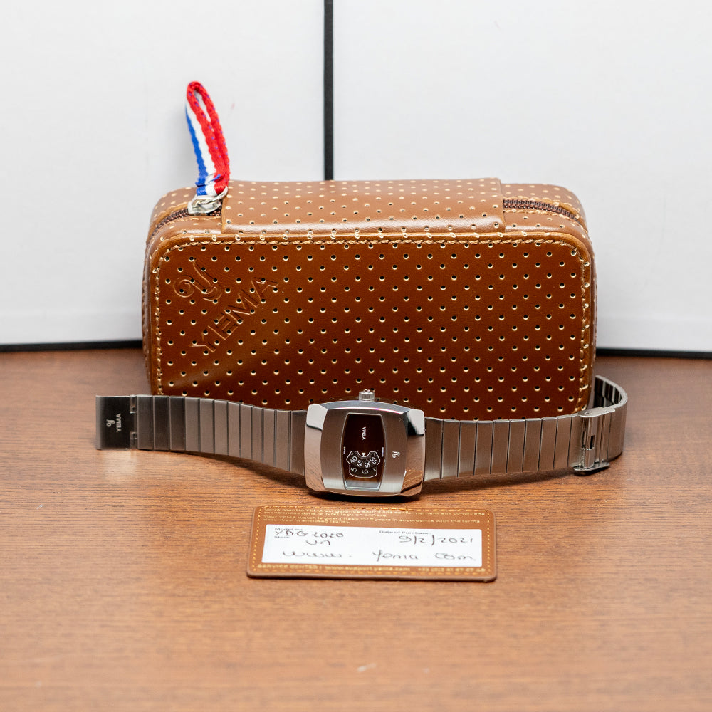 Here we have a quirky 2021 YEMA Digital 'Digidisc' Brown Dial Automatic, a contemporary reissue of a Yema digital watch produced in the 1970s. Featuring a 36mm polished and brushed stainless steel tonneau-shaped case that sits comfortably on your wrist with hooded lugs. Its curved flanks lead to a lug-to-lug length of 42.5mm and a case thickness of 11.5mm, giving the watch an impressive wrist presence. On the right side, a signed coin-edged screw-down crown. Sloping polished sides surround a satin-brushed top plate engraved with the ‘Y’ motif, and a rectangular sapphire crystal sits above a horizontal-stripe brown Digidisc dial. An aperture shows the two rotating discs for minutes and hours, and a helpful arrow pointing to the minutes. The Yema logo completes this distinctive vintage-inspired reissue. On the reverse, a screw-down case back, its outside edge engraved with the watch details, and the Yema crest in the centre, inside an in-house automatic YEMA Cal. YEMA2000, 29 jewels, beating at 28,800 beats per hour. It comes paired with its 24mm stainless steel bracelet secured by a signed sliding clasp. This watch is sold with its original YEMA box and paperwork.