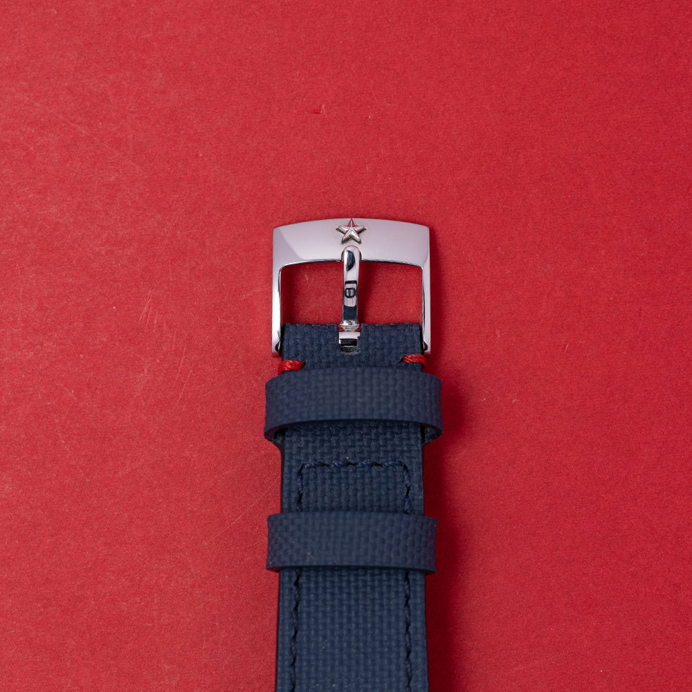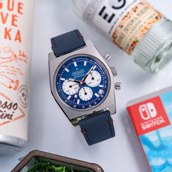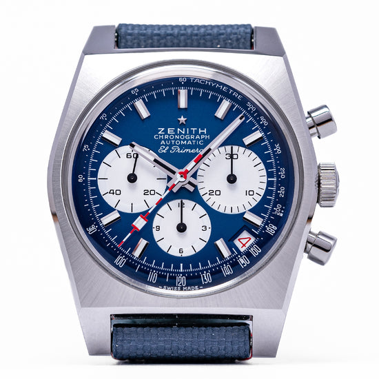 This watch is sold with its original Zenith box and paperwork. The watch comes paired with its original vintage-style blue Zenith 20mm Cordura strap and Zenith signed buckle. The watch is from October 2021 and is in lightly worn, but fair condition as you can see. The watch comes with our 12-Month Warranty.