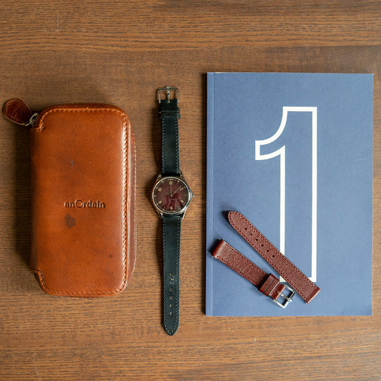 This watch is sold with its original AnOrdain travel case with original AnOrdain paperwork. The watch comes with its original 18mm quick-release leather strap with a signed buckle plus an additional 18mm AnOrdain leather strap. The watch is from July 2022 and is sold in a worn condition but is overall very good, as you can see in the photos. The watch comes with its Manufacturer's Warranty.