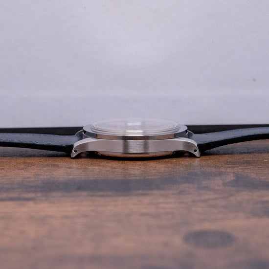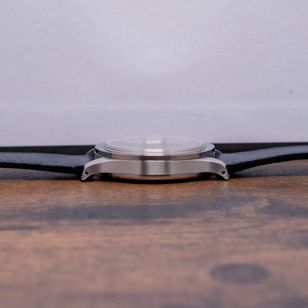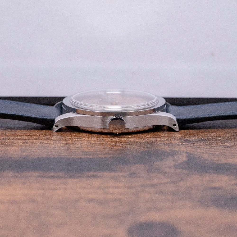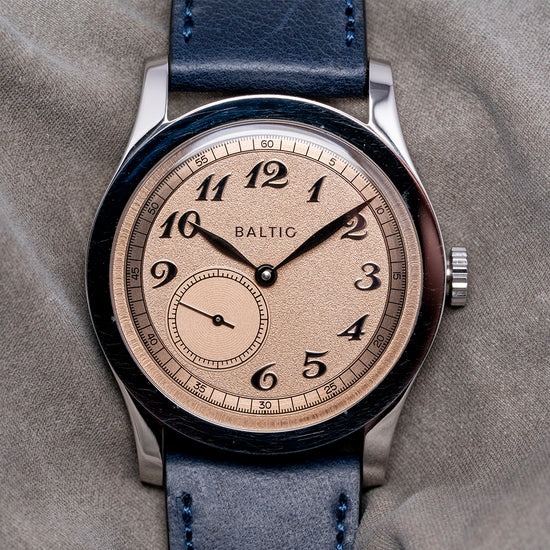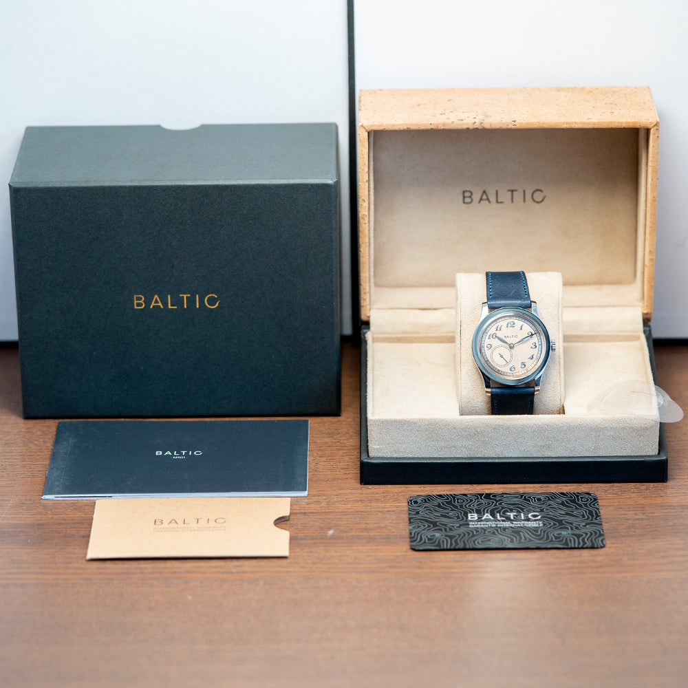 Here we have a 2022 Baltic MR01 Salmon Dial Automatic Micro-Rotor. The 36mm brushed and polished stainless steel case gently curves over your wrist with elegant sweeping drilled lugs, its horizontally brushed flanks lead to a lug-to-lug length of 44mm and a case thickness of 10mm to ensure a comfortable fit on your wrist. On the right side is a push/pull crown. A polished stepped smooth bezel holds a high domed Hesalite crystal above a distinctive MR Classic Salmon dial that has a grainy texture with an outer circular brushed minute railtrack precisely executed. Applied polished Breguet indexes shimmer in the light as you rotate your wrist, marking the hours. Off-centred at 7, we have a sub-second dial with guilloche finishing. Elegant, polished leaf hands complete this sophisticated dial. On the reverse, a screwed-down exhibition case back is secured with six screws and inside an automatic Hangzhou ELA05MN, 30 jewels, beating 28,800 beats per hour, Hangzhou is a direct competitor to SEAGULL whose movement can be found in the Baltic BI-Compax chronographs, the micro-rotor sits inside the movement making it much thinner, decorated with circular Côtes de Genève, perlage just under the rotor, and blue-coloured screws, this attractive watch is appealing on both sides with Baltic’s attention to detail is inspiring. It comes paired with a 20mm Baltic blue Italian leather strap, drilled lug holes make for easy strap changing and comes with its Baltic presentation box and papers.