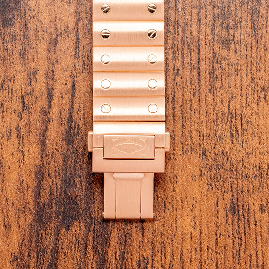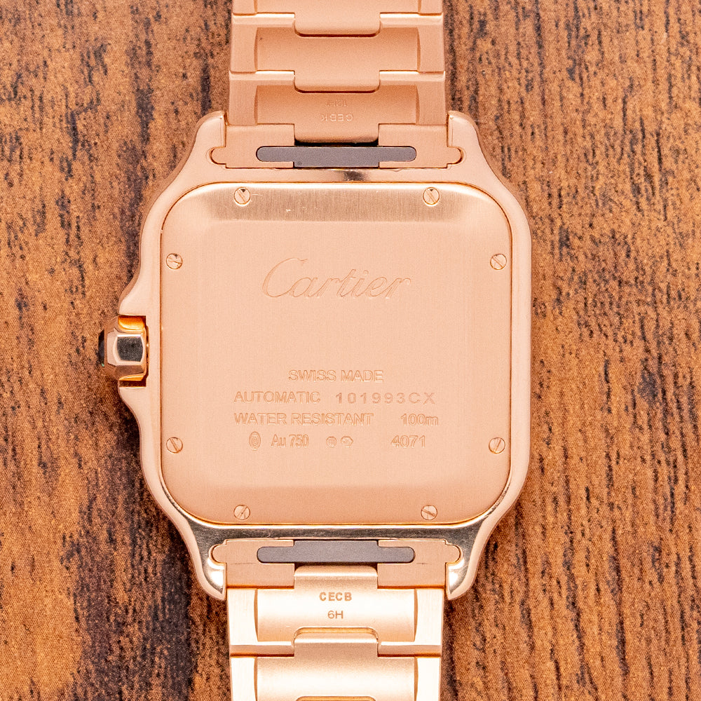 Here we have a curvaceous 2022 Cartier Santos de Cartier 18ct Rose Gold WGSA0018 with a larger 40mm brushed 18ct Rose Gold case, the polished chamfer edge leads the eye towards the gently sculpted lugs, which perfectly support the bracelet and strap, and a lug-to-lug length of 47.5mm and a case thickness of 9mm ensure a comfortable fit on your wrist. Polished and brushed surfaces are expertly finished. On the right side, a heptagon crown protected by crown guards with a blue spinel cabochon inset. The polished bezel now tapers towards the lugs for a seamless transition. Its use of screws in the polished bezel was intended to simulate the screws found on the Eiffel Tower in Paris, France. A slightly curved sapphire crystal protects the crisp white dial, and large applied Roman numerals radiate around the inner minute track, like the Paris roads, radiating from the Arc de Triomphe. Elegant slim steel thermally blued sword hands are complemented by a fine tapered second hand. At 6 o’clock, a colour-matched framed date window perfectly balances this striking dial. At noon, we have the Cartier motif, and at 6 o’clock, “Automatic” completes this sophisticated dress watch. On the reverse, a screwed-down 18ct Rose Gold 750/1000 case back includes the Cartier details and the gold hallmarks engraved into it. Inside an automatic Cartier Cal. 1847 MC, 23 jewels, 28,800 beats per hour, the in-house movement was first introduced in the 2015 Cartier Clé collection. It comes paired with its original Cartier 21mm brushed 18ct Rose Gold bracelet with polished screw detailing and secured by a concealed push-button butterfly clasp; all links are included, plus a Cartier 21mm grey Alligator leather strap secured by a beautiful 18ct Rose Gold Ardillon pin buckle. The “QuickSwitch" mechanism makes strap changing a breeze; you simply press a small rectangular button underneath the watch band to release it from the case – no need for spring bars or specialist tools. The watch comes with its Cartier presentation box and paperwork, the inner sleeve and cushion of the box are missing as you can see from the photographs.