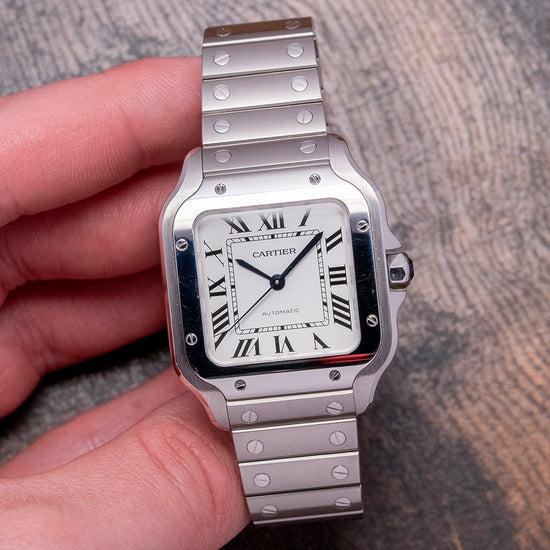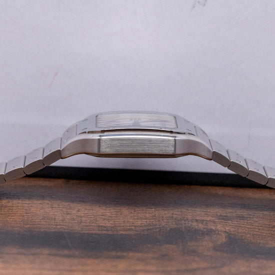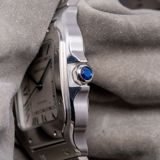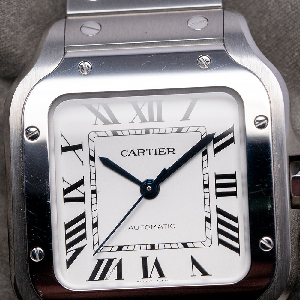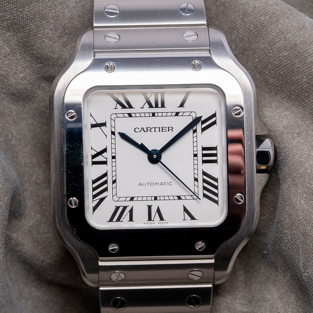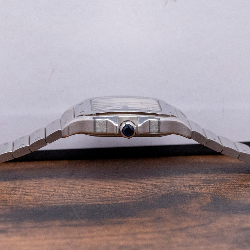 Here we have a curvaceous 2022 Cartier Santos De Cartier Medium White WSSA0029 with a 35mm brushed and polished stainless steel case, the polished chamfer edge leads the eye towards the gently sculpted lugs, which perfectly support the bracelet, and a lug-to-lug length of 41.5mm and a case thickness of just 8.5mm ensure a comfortable fit on your wrist. Polished and brushed surfaces are expertly finished. On the right side, a heptagon crown is protected by crown guards with a blue spinel cabochon inset. The polished bezel now tapers towards the lugs for a seamless transition. Its use of screws in the polished bezel was intended to simulate the screws found on the Eiffel Tower in Paris, France. A slightly curved sapphire crystal protects the crisp white dial, and large applied Roman numerals radiate around the inner minute track, like the Paris roads radiating from the Arc de Triomphe. Elegant, slim steel thermally blued sword hands are complemented by a fine, tapered second hand. At noon, we have the Cartier motif, and at 6 o’clock, “Automatic” completes this sophisticated dress watch. On the reverse, a screwed-down solid case back includes the Cartier details engraved into it. Inside an automatic Cartier Cal. 1847 MC, 23 jewels, 28,800 beats per hour, the in-house movement was first introduced in the 2015 Cartier Clé collection. It comes paired with its original Cartier 19mm brushed stainless steel bracelet with polished screw detailing and secured by a concealed push-button butterfly clasp; all links are included. The ‘QuickSwitch’ mechanism makes strap changing a breeze; you simply press a small tab underneath the watch band to release it from the case – no need for spring bars or specialist tools, ‘Smart link’ is a clever way to remove a link by depressing a button on the link you want to remove which releases a retaining bar( it doesn’t completely come out), then push the button on the above link to remove the required link, connect the remaining links back together and push the bar back in to secure it. Plus, a brown 19mm Cartier leather strap and a black 19mm Cartier leather strap are in the box. The watch comes with its Cartier presentation box and paperwork.