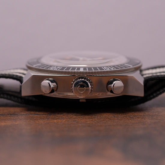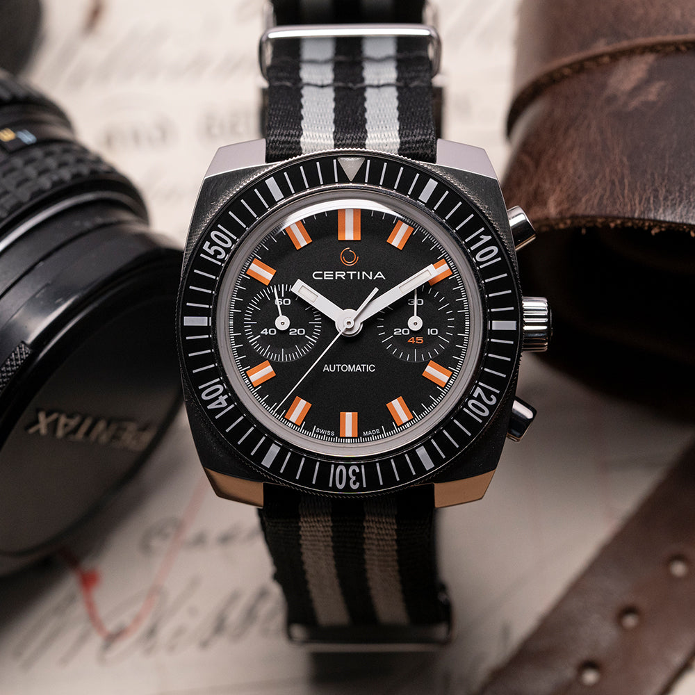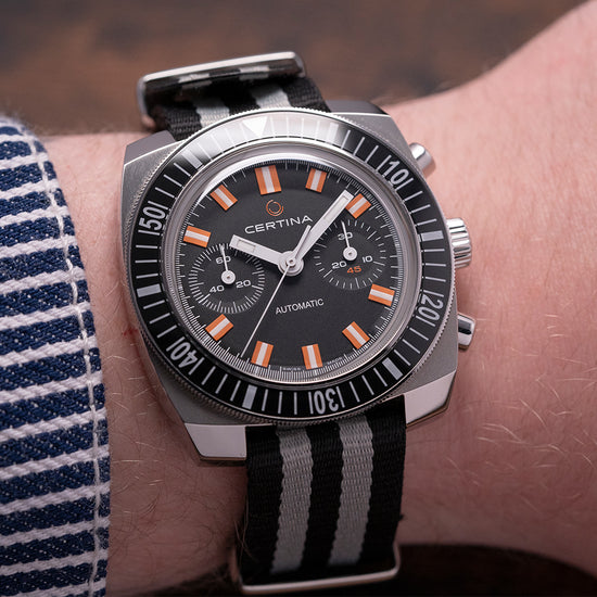 Here we have a 2022 Certina DS Chronograph Automatic 1968 C040 462A based on the 38mm Certina Argonaut Chrono 200m Ref: 8401 002, production ran for only a few years between 1968 and 1972. The 43mm stainless steel brushed and polished square cushion case curves over your wrist with short-angled flat-ended lugs, a lug-to-lug length of 46mm and a case thickness of 14.5mm give the watch an impressive wrist presence. The finish of the brushed and polished sides transitions with crisp edges and lifts this timepiece above many of its chronograph contemporaries. Down the right side, you find the recessed piston-style chronograph pushers and a signed screw-down crown in the centre. The rotating unidirectional bezel has a black 60-minute scale with bold white numerals holding a domed sapphire crystal AR coated above a matte black bi-compax dial. An outer minute track is precisely executed with large applied orange baton indexes infilled with SuperLumiNova, at 3 o’clock we have a 30-minute register with an orange 45 and white hand, at 9 o’clock the continuous seconds register. Thick white baton hands are tipped with SuperLumiNova and complemented by a tapered white chronograph hand, the orange elements are a nice contrast to the black of the perfectly balanced bi-compax dial. At 12 o’clock we have the Certina motif with “Automatic” printed underneath at 6 o’clock complete this contemporary vintage-inspired dive tool watch. On the reverse a screw-down exhibition case back showcasing the automatic Certina Cal. A05.H31, 27 jewels, beating at 28,800 beats per hour, this movement is based on and is an adaptation of the Valjoux/ETA 7753 movement with the date removed. The watch comes paired with its Certina 21mm black and silver striped NATO strap with a signed buckle, made from recycled #tide ocean plastic, Tide Ocean SA was founded in 2019 by Thomas Schori, they are a supplier to the watch industry based in Basel, Switzerland and use recycled plastic from the ocean to make their watch straps. The watch comes with its Certina presentation box, swing tag and paperwork.