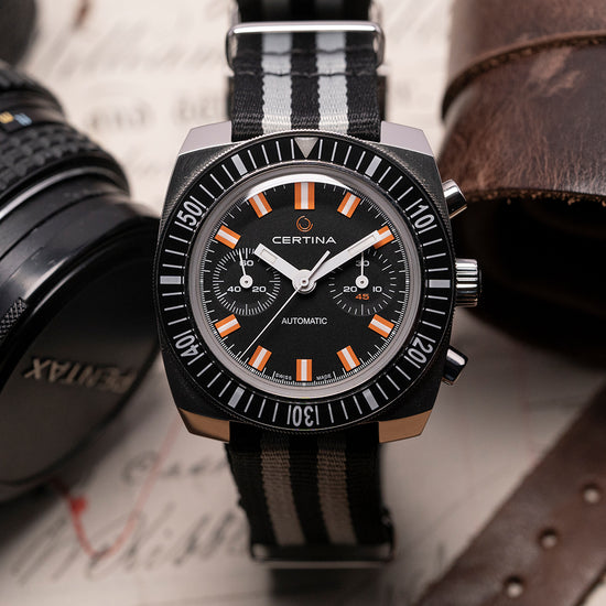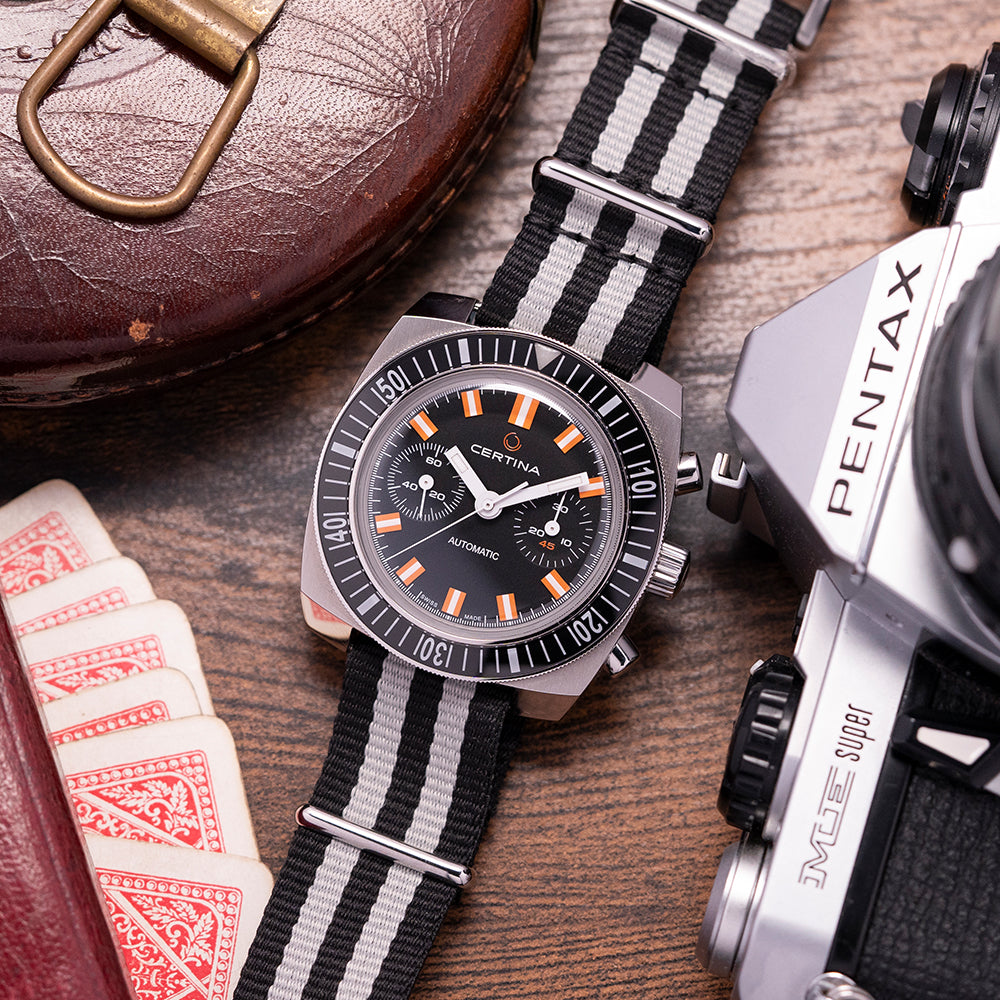 This watch is sold with its original Certina box, swing tag and paperwork. The watch comes paired with its original black and silver striped 21mm Certina signed NATO strap. The watch is from August 2022 and is sold in fantastic condition and appears to have been worn very lightly. The watch comes with our 12-Month Warranty.
