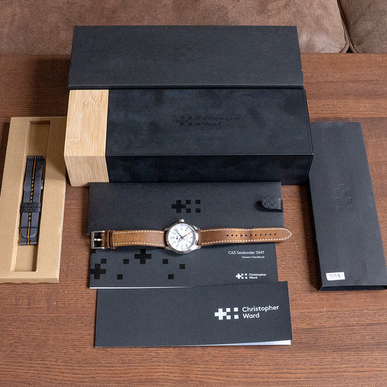 This watch is sold with its original Christopher Ward presentation box and Paperwork. The watch comes paired with its original Christopher Ward 20mm Leather quick-release strap with a signed pin buckle plus an additional Christopher Ward 20mm strap in the box. The watch is from December 2022 and is sold in worn condition, but overall very fair condition as you can see from the photographs. The watch comes with its Manufacturer's Warranty.