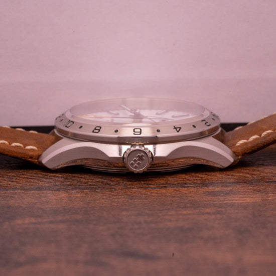Here we have a 2022 Christopher Ward C63 Sealander GMT White on Strap that has a 39mm 316L marine-grade stainless steel Light-catcher case that gently curves over your wrist with tapered lugs, and a lug-to-lug length of 45.5mm and a case thickness of 12mm ensures a comfortable fit. Brushed and polished surfaces transition with crisp edges that play with the light as you rotate your wrist hence the name. On the right side is a screw-down signed crown with an embossed Christopher Ward motif. A fixed 24-hour brushed bezel has black lacquer-filled numerals and holds an anti-reflective sapphire crystal. The white polished lacquered dial has an outer minute chapter ring with printed Arabic numerals and an orange pip, applied bevel-edged gun-metal diamond polished baton indexes with a strip of Super-LumiNova Grade X1 BL C1 down their centres mark the hours. The polished edges catch the light in a magical way. At 6 o’clock a date window. Brushed and polished gun-metal hands are filled with the same luminance complemented by an orange-tipped GMT arrow hand and an orange-tipped sweeping second hand complete with the characteristic Trident counterweight. Text is precisely applied with a splash of orange at 6 o’clock indicating its water resistance. This go-anywhere, do-everything watch is perfectly balanced. On the reverse a screw-down exhibition case back, inside an automatic Sellita SW330-2, 25 jewels, 28,800 beats per hour, with a bespoke “Colimaçoné” finishing (a type of twisting sunray graining). The rotor has a double Twin-flag engraving across it. The watch comes fitted on a Christopher Ward 20mm Leather strap with a signed pin buckle and the watch also comes with its Christopher Ward presentation box and papers.