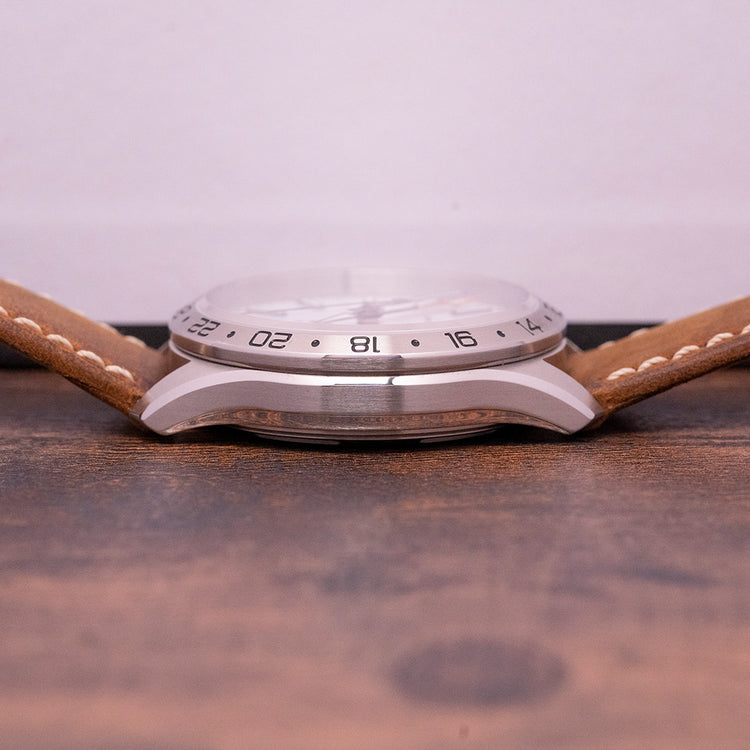 Here we have a 2022 Christopher Ward C63 Sealander GMT White on Strap that has a 39mm 316L marine-grade stainless steel Light-catcher case that gently curves over your wrist with tapered lugs, and a lug-to-lug length of 45.5mm and a case thickness of 12mm ensures a comfortable fit. Brushed and polished surfaces transition with crisp edges that play with the light as you rotate your wrist hence the name. On the right side is a screw-down signed crown with an embossed Christopher Ward motif. A fixed 24-hour brushed bezel has black lacquer-filled numerals and holds an anti-reflective sapphire crystal. The white polished lacquered dial has an outer minute chapter ring with printed Arabic numerals and an orange pip, applied bevel-edged gun-metal diamond polished baton indexes with a strip of Super-LumiNova Grade X1 BL C1 down their centres to mark the hours, the polished edges catch the light in a magical way. At 6 o’clock a date window. Brushed and polished gun-metal hands are filled with the same luminance complemented by an orange-tipped GMT arrow hand and an orange-tipped sweeping second hand complete with the characteristic Trident counterweight. Text is precisely applied with a splash of orange at 6 o’clock indicating its water resistance. This go-anywhere, do-everything watch is perfectly balanced. On the reverse a screw-down exhibition case back, inside an automatic Sellita SW330-2, 25 jewels, 28,800 beats per hour, with a bespoke “Colimaçoné” finishing (a type of twisting sunray graining). The rotor has a double Twin-flag engraving across it. The watch comes fitted on a Christopher Ward 20mm Leather strap with a signed pin buckle and the watch also comes with its Christopher Ward presentation box and papers.