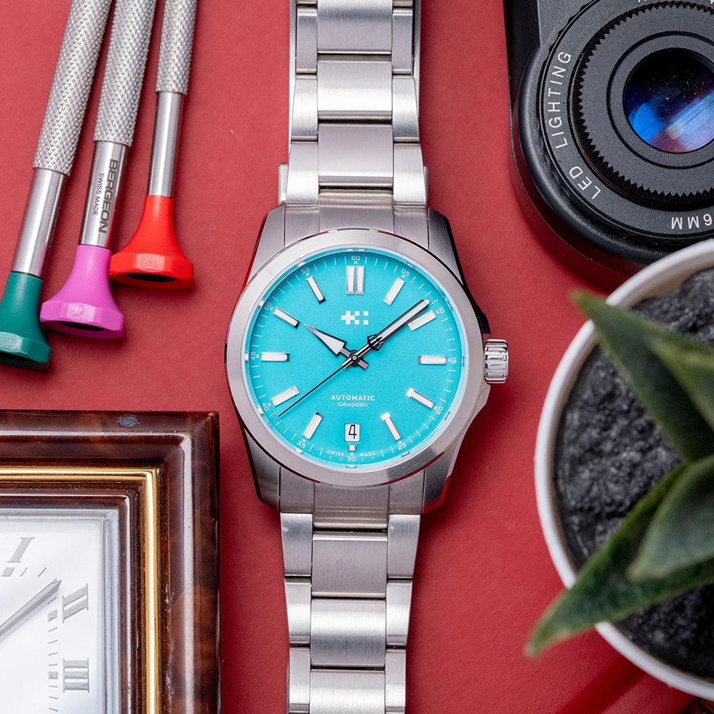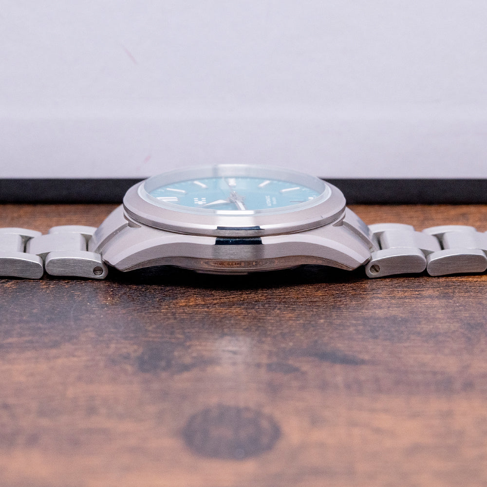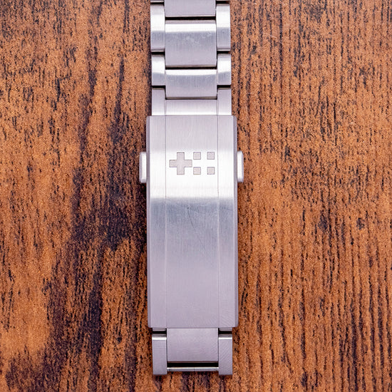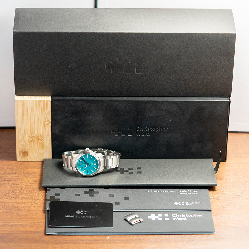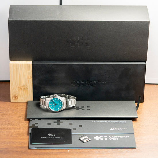 Here we have a 2022 Christopher Ward C63 Sealander Lucerne Blue LE. Limited to 016/200 pieces. The 36mm 316L marine-grade stainless steel Light-catcher case has brushed and polished surfaces that transition with crisp edges catching the light as you rotate your wrist, hence the name. The watch's 42.5mm lug-to-lug length and 11mm case thickness give it an impressive wrist presence. A screw-down signed crown with an embossed Christopher Ward motif is on the right side. A circular brushed and polished smooth fixed bezel holds an anti-reflective sapphire crystal; above the Lucerne Blue polished lacquered dial, there is an outer minute track with printed Arabic numerals in white. Applied chamfer-edged diamond polished baton indexes with a Super-LumiNova Grade X1 BL C1 strip down their centres. The polished edges catch the light in a magical way, at 6 o’clock a date window. Brushed and polished hands are filled with the same luminance complemented by a sweeping second hand complete with the characteristic Trident counterweight; at 12 o’clock, we have the Christopher Ward motif with white text at 6 o’clock, indicating its water resistance. This go-anywhere, do-everything watch is perfectly balanced. On the reverse, there is a screw-down exhibition case back with the details of the watch and a limited number engraved around its edge, inside an automatic Sellita SW200-1, 26 jewels, 28,800 beats per hour, with a bespoke “Colimaçoné” finishing (a type of twisting sunray graining), the rotor has a double Twin-flag engraving across it. The watch comes fitted on a Christopher Ward 20mm stainless steel bracelet with a micro-adjustment ratchet clasp; all links are provided, and the watch also comes with its Christopher Ward presentation box and papers.