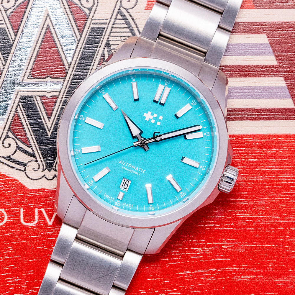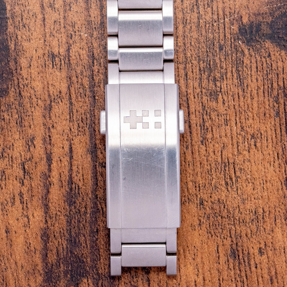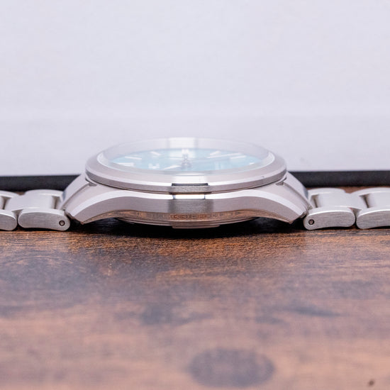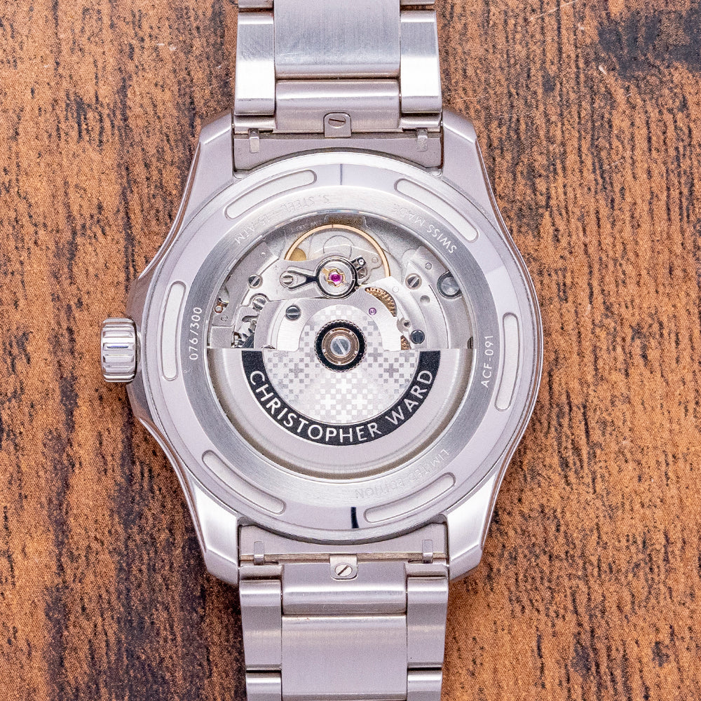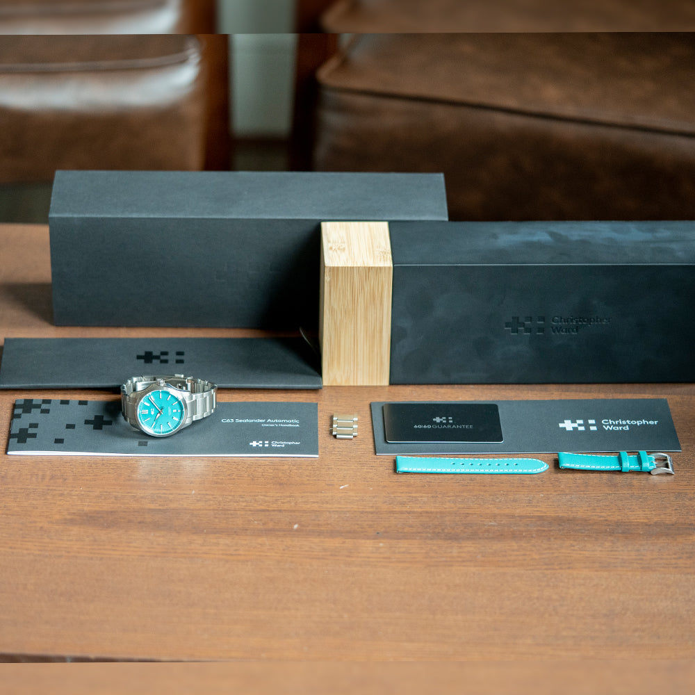 Here we have a 2022 Christopher Ward C63 Sealander Lucerne Blue LE. Limited to 076/300 pieces. The 39mm 316L marine-grade stainless steel Light-catcher case has brushed and polished surfaces that transition with crisp edges catching the light as you rotate your wrist, hence the name. The watch's 45.5 mm lug-to-lug length and 11.5 mm case thickness give it an impressive wrist presence. A screw-down signed crown with an embossed Christopher Ward motif is on the right side. A circular brushed and polished smooth fixed bezel holds an anti-reflective sapphire crystal; above the Lucerne Blue polished lacquered dial, there is an outer minute track with printed Arabic numerals in white. Applied chamfer-edged diamond polished baton indexes with a Super-LumiNova Grade X1 BL C1 strip down their centres. The polished edges catch the light in a magical way, at 6 o’clock a date window. Brushed and polished hands are filled with the same luminance complemented by a sweeping second hand complete with the characteristic Trident counterweight; at 12 o’clock, we have the Christopher Ward motif with white text at 6 o’clock, indicating its water resistance. This go-anywhere, do-everything watch is perfectly balanced. On the reverse, there is a screw-down exhibition case back with the details of the watch and a limited number engraved around its edge, inside an automatic Sellita SW200-1, 26 jewels, 28,800 beats per hour, with a bespoke “Colimaçoné” finishing (a type of twisting sunray graining), the rotor has a double Twin-flag engraving across it. The watch comes fitted on a Christopher Ward 20mm stainless steel bracelet with a micro-adjustment ratchet clasp; all links are provided, plus an additional 20mm Lucerne blue Christopher Ward leather strap and pin buckle and the watch also comes with its Christopher Ward presentation box and papers.